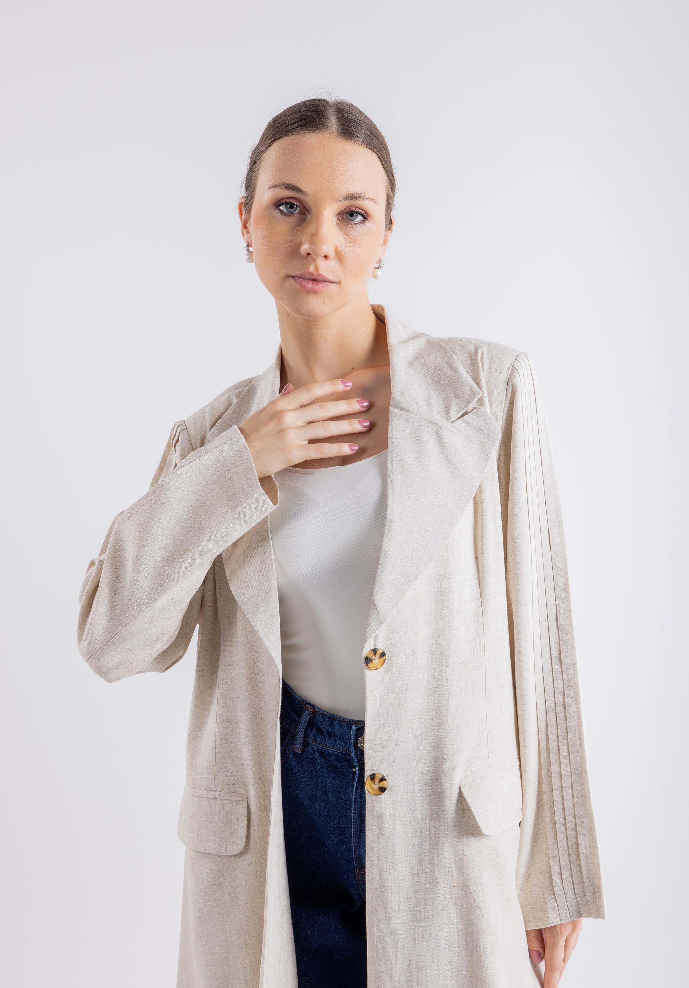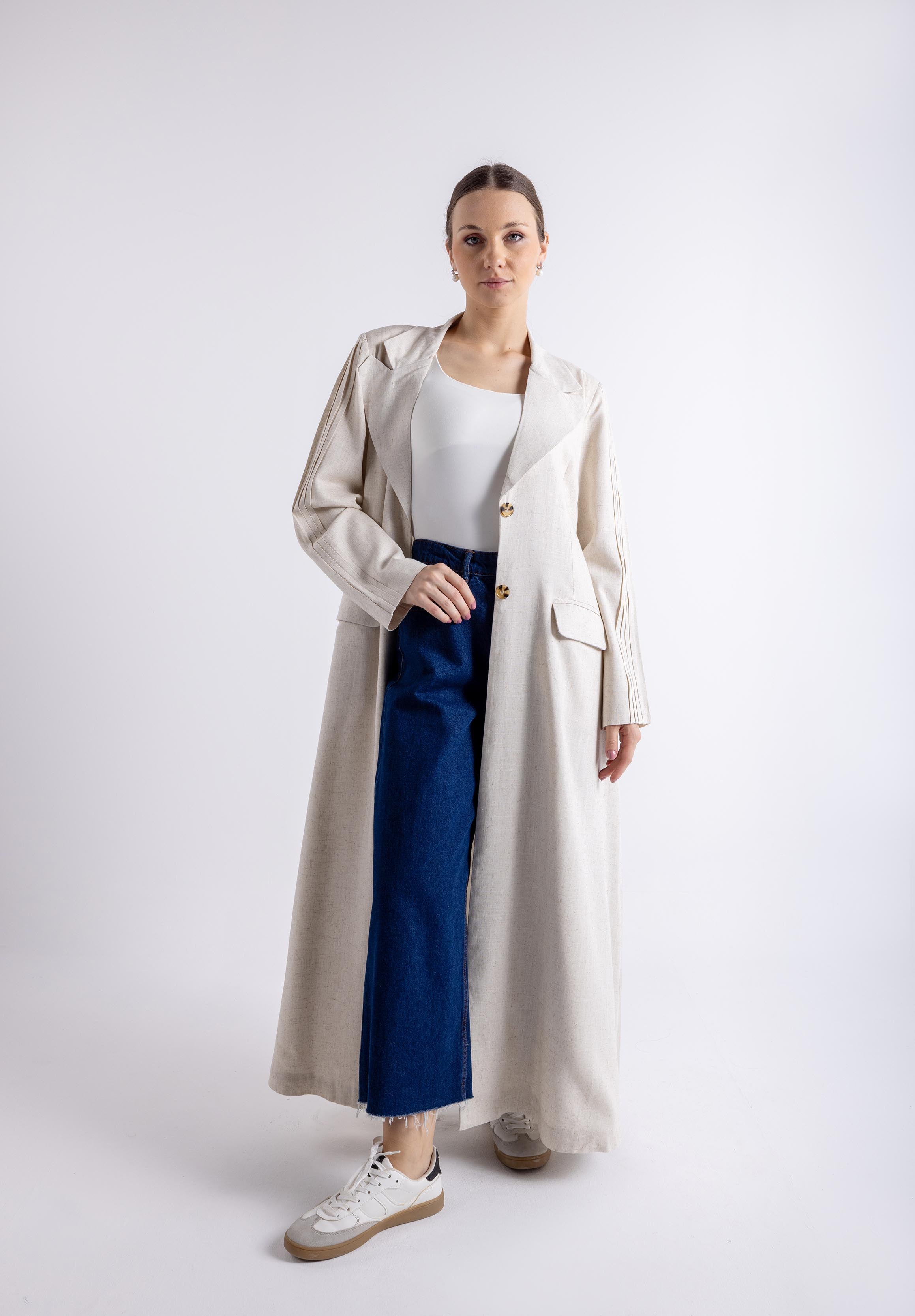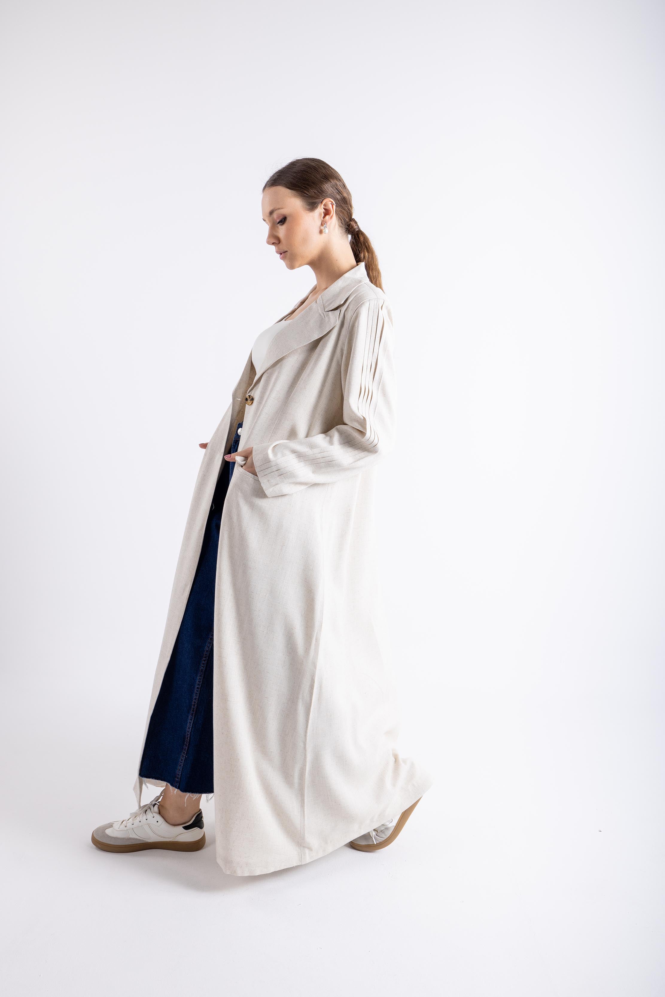 يتميز هذا المعطف الطويل الخفيف بقصّة واسعة ومريحة مع زرين أماميين للإغلاق. يحتوي المعطف على جيوب عميقة وياقة كبيرة، مما يوفر مظهرًا أنيقًا وعمليًا. يمكن تنسيقه مع بلوزة بيضاء بسيطة وجينز وحذاء رياضي غير رسمي، مما يجعله مثاليًا لأسلوب الشارع البسيط والأنيق.