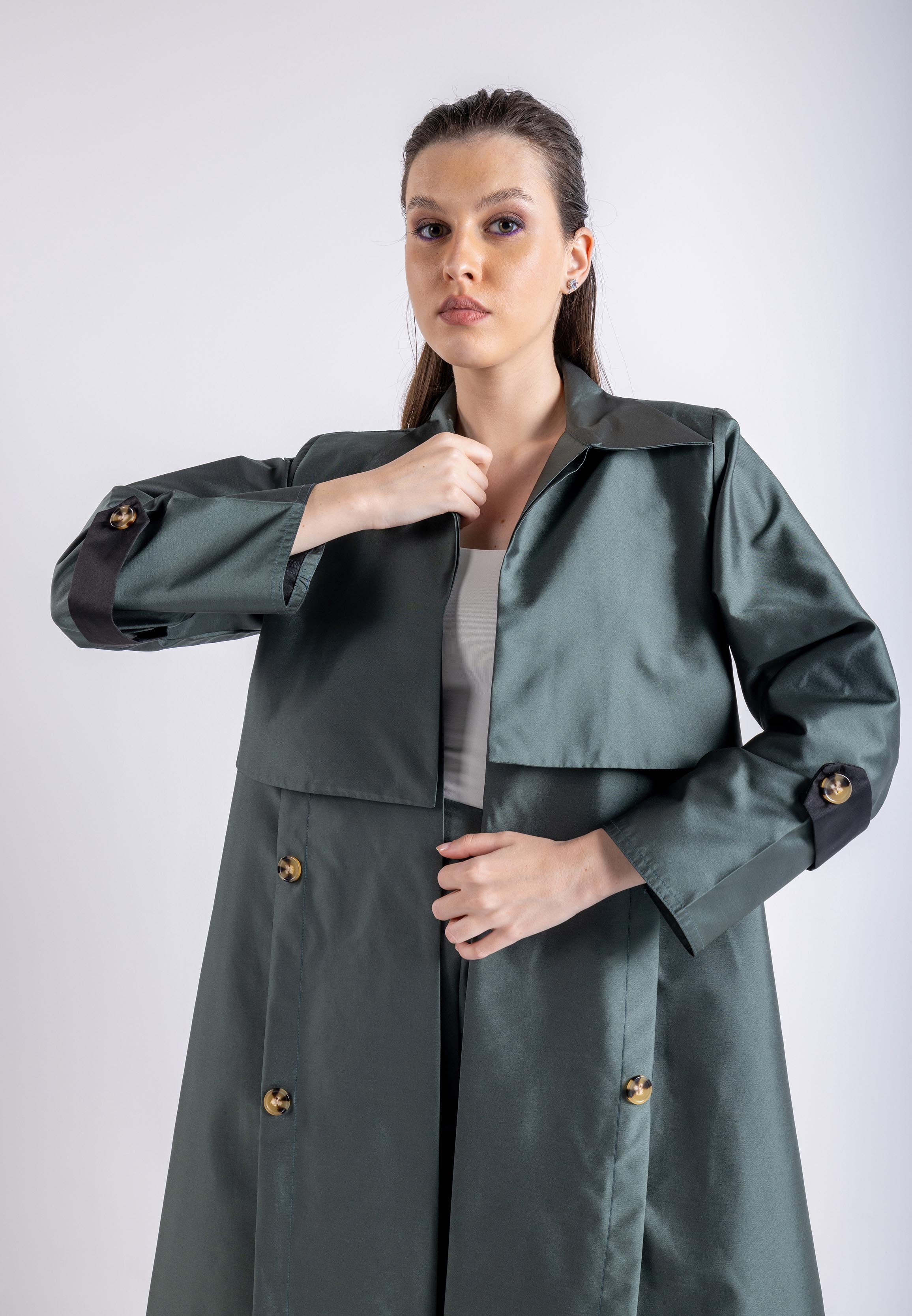 التصميم: طيات أمامية، وأكمام واسعة مطوية مع أزرار على الجانبين