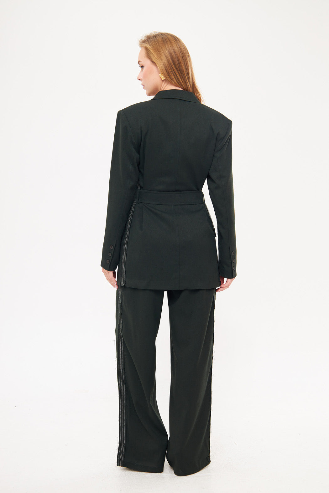 سترة مزدوجة الصدر أنيقة بلمسة عصرية، صُممت هذه القطعة لتمنحك مظهرًا أنيقًا وجذابًا. يشد الحزام المرفق الخصر، مما يعزز المظهر المنظم لهذه القطعة الخالدة. مصنوعة من قماش صلب عالي الجودة، هذه السترة متعددة الاستخدامات لكل من الإطلالات العملية وغير الرسمية.