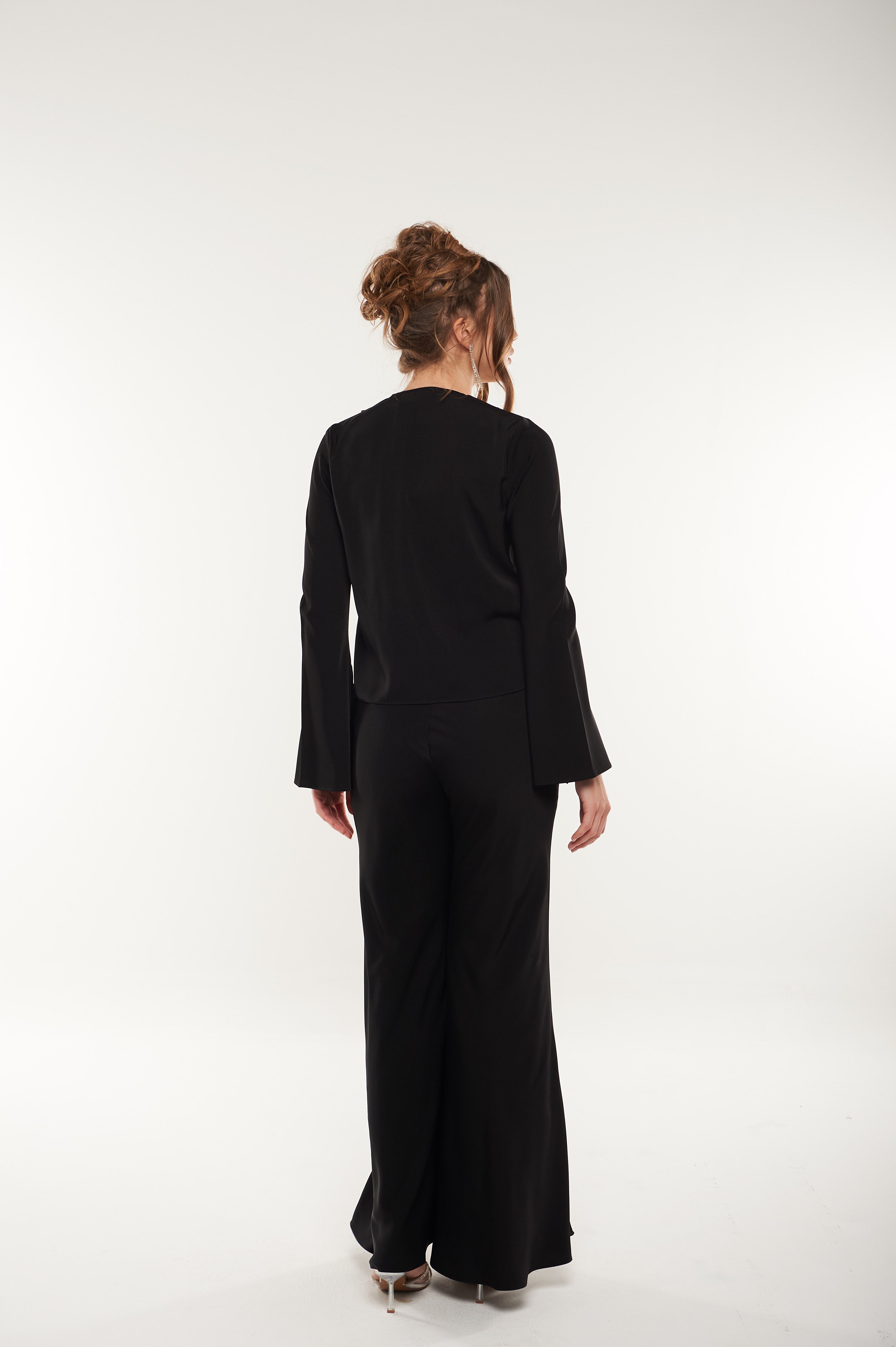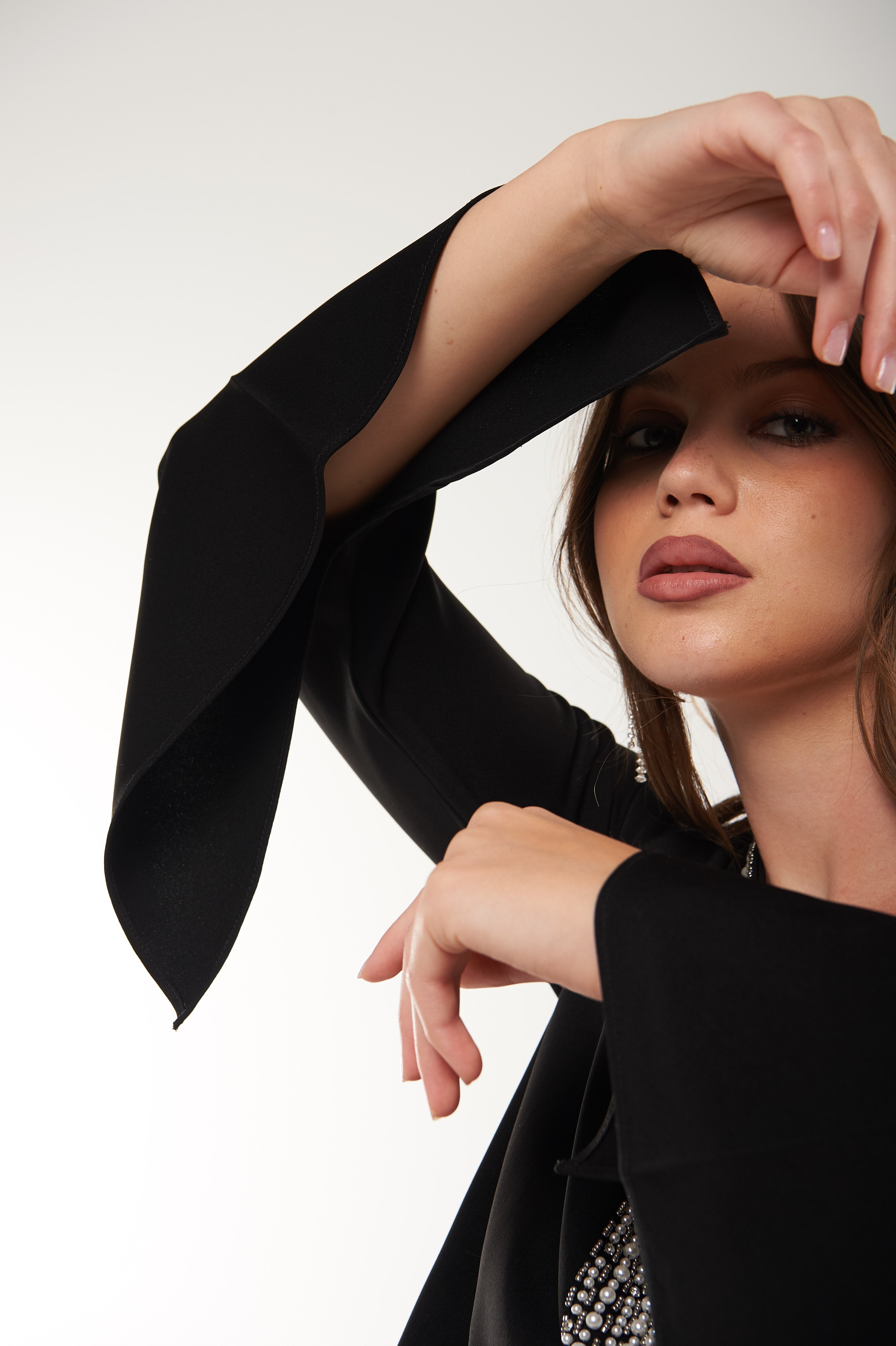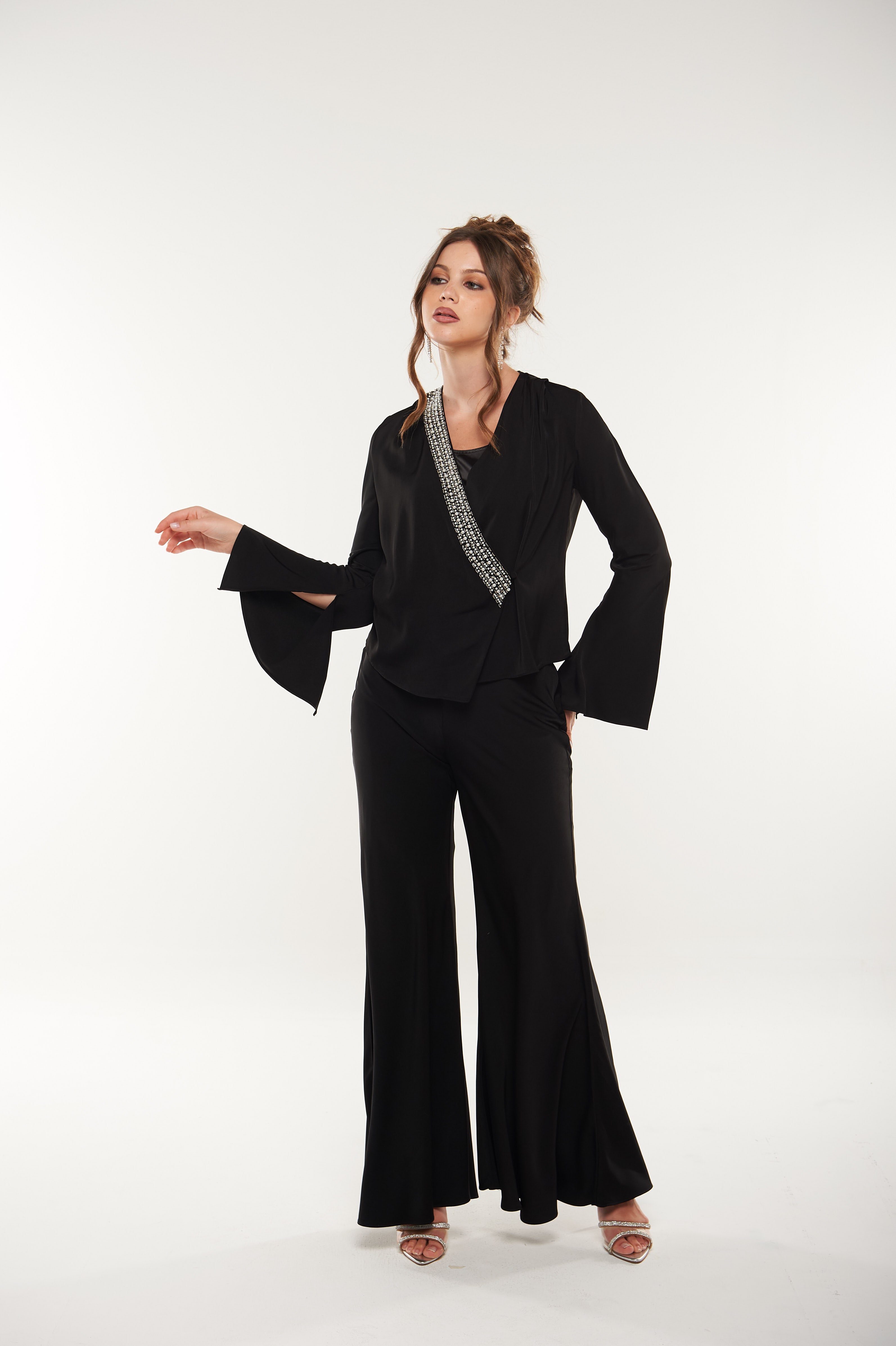 تميّزي بإطلالة أنيقة وجذابة مع هذه البلوزة السوداء الراقية التي تتميز بتصميم بلف غير متماثل وتطريز لؤلؤي فاخر على طول الياقة. يمنحك القَصّ الانسيابي والتفصيل النظيف شكلاً جذابًا ومريحًا، بينما تضيف الأكمام الطويلة الواسعة لمسة درامية مميزة. مثالية للسهرات الراقية، العشاء الرسمي، أو حتى إطلالات العمل الأنيقة، فهي تجمع بين الفخامة الهادئة والحداثة.