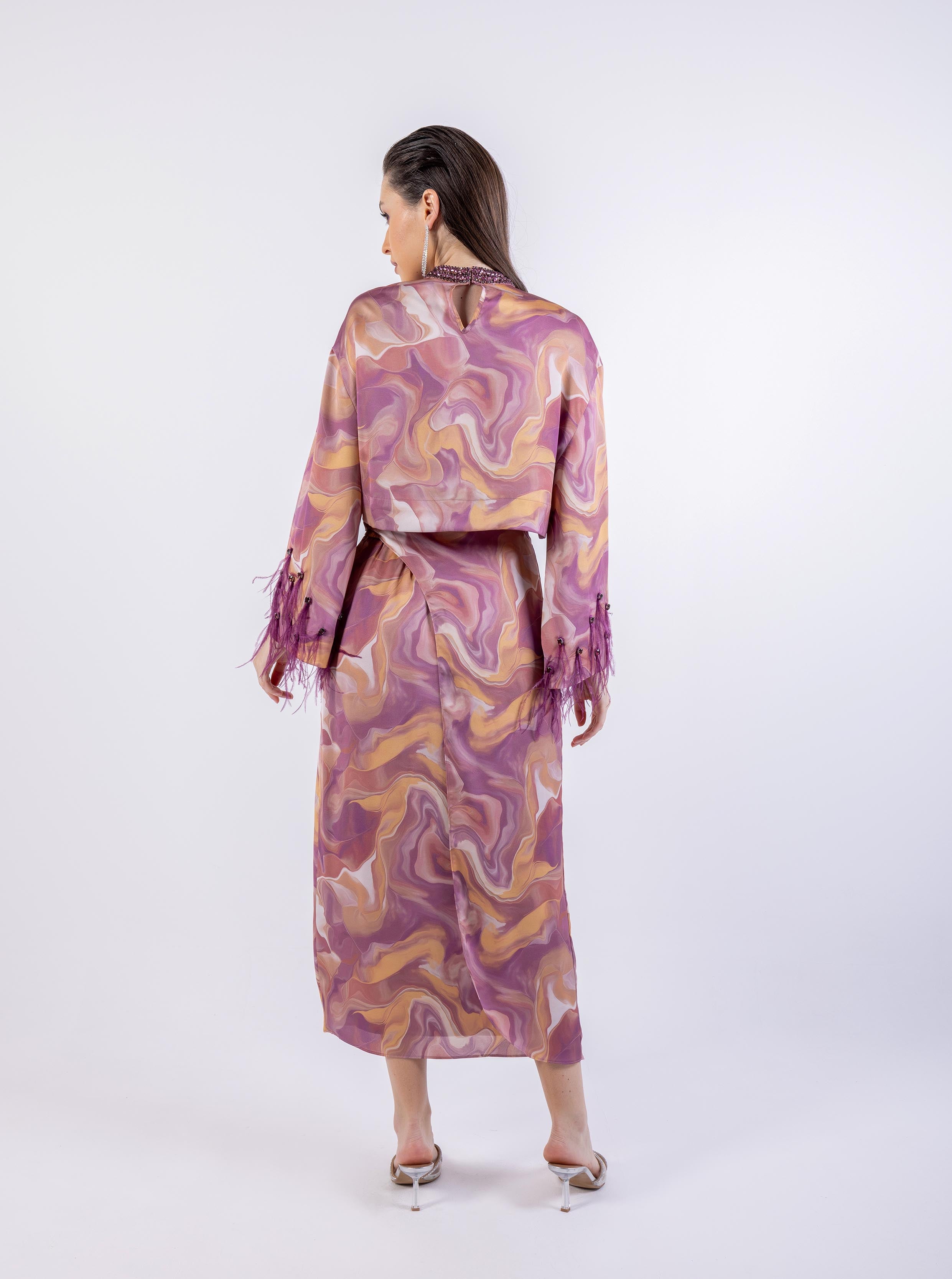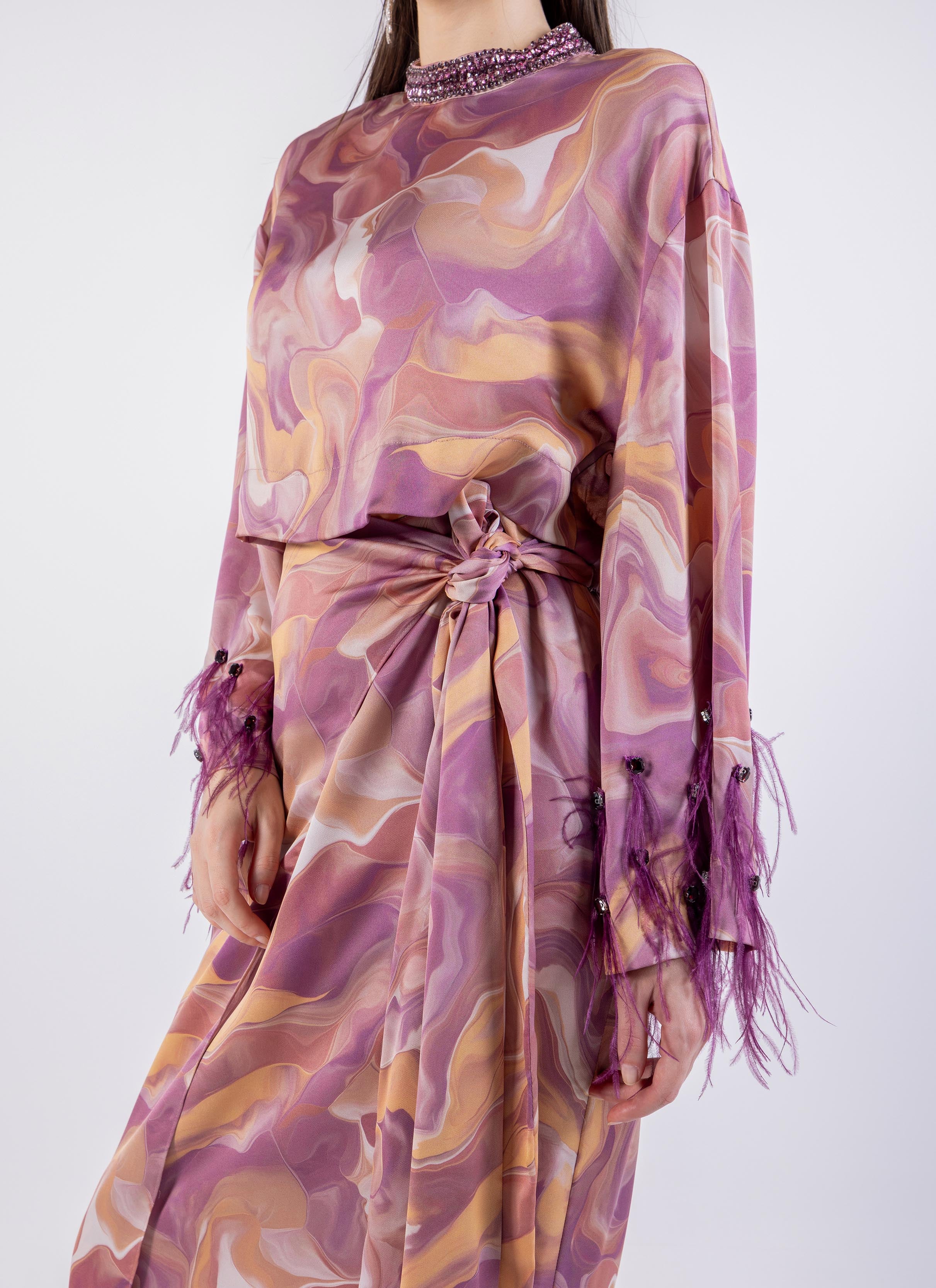 يتميز بجزء علوي من الرخام المقصوص مع حاشية بأكمام طويلة من الريش. توفر المادة خفيفة الوزن والتصميم المتدفق ملاءمة مريحة ومناسبة لمناسبات مختلفة.