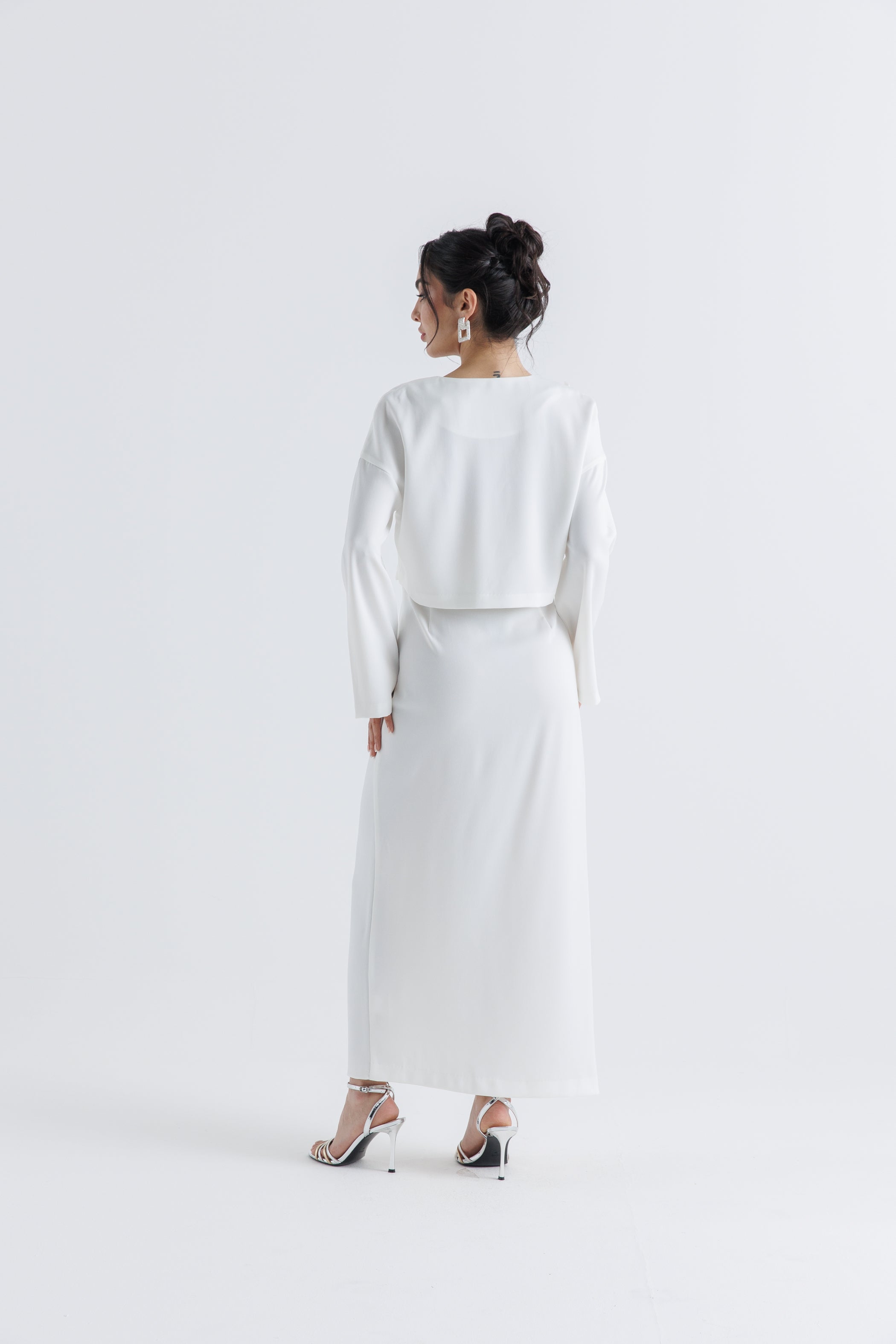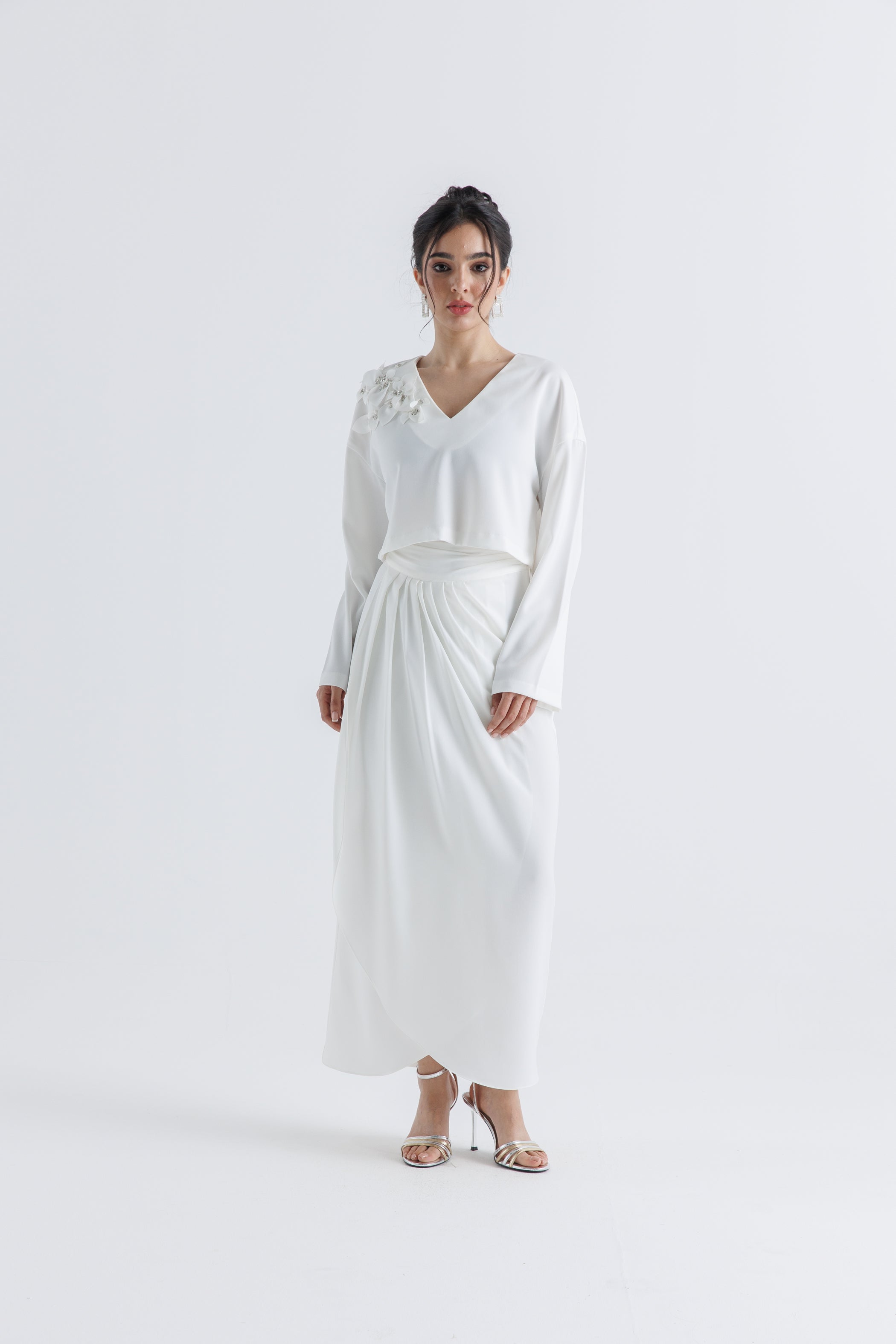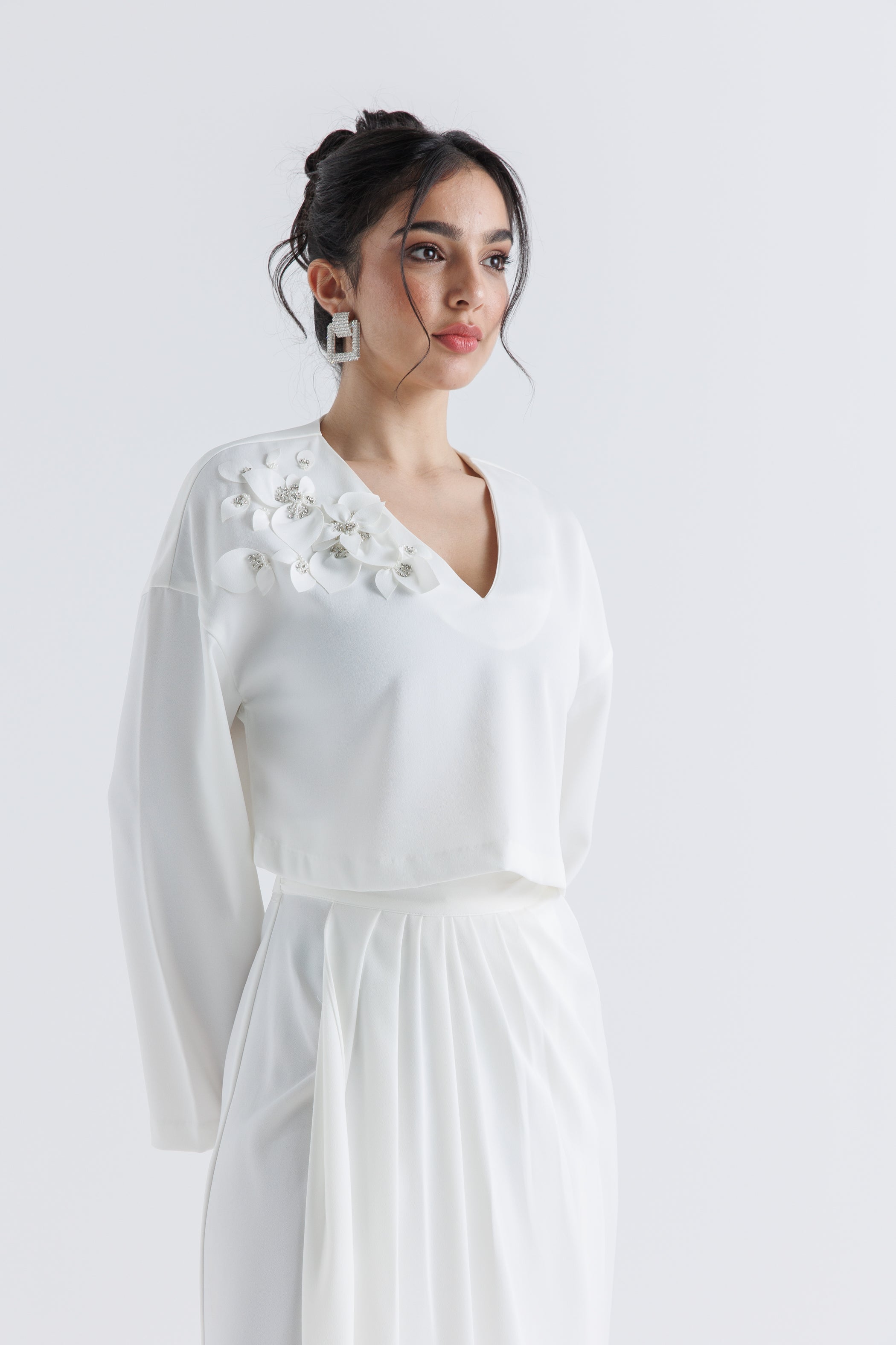 أضيفي لمسة راقية إلى إطلالتك مع هذا التوب القصير المصمم بعناية وأناقة. يتميز بياقة على شكل V وقصة مريحة بأكمام طويلة وواسعة، ويُلفت الأنظار بالتفاصيل الوردية البارزة على الكتف والمزينة بتطريز لؤلؤي أنيق. صُنع من قماش كريب متوسط الوزن بلمسة ناعمة غير لامعة، ما يمنحه انسيابية وأناقة في الوقت نفسه. يمكنك تنسيقه بكل سهولة مع التنورة ذات الطيات (رقم الموديل: 2501005) لإطلالة متكاملة.