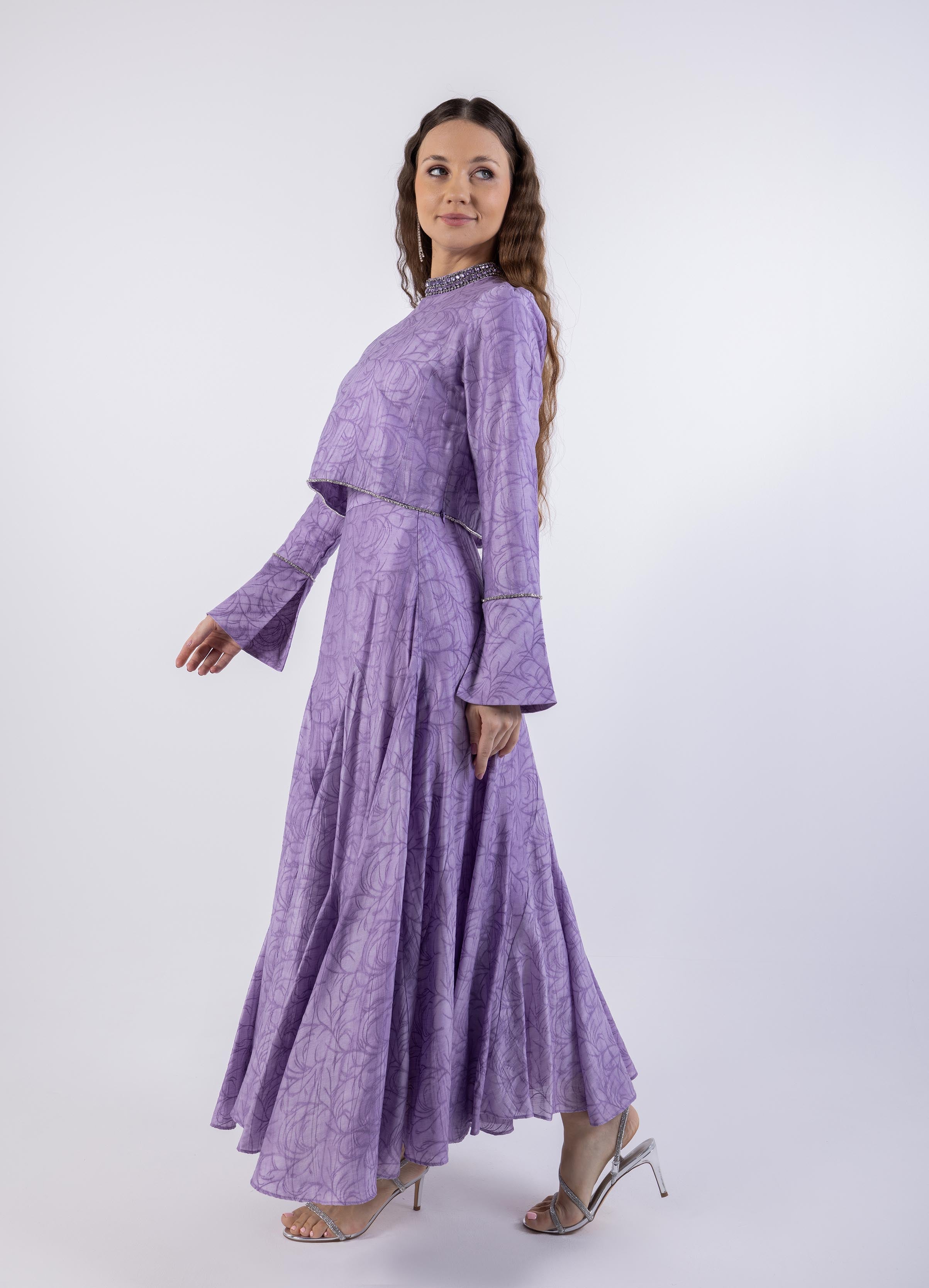 • الرقبة: ياقة دائرية مزينة بكريستالات لامعة