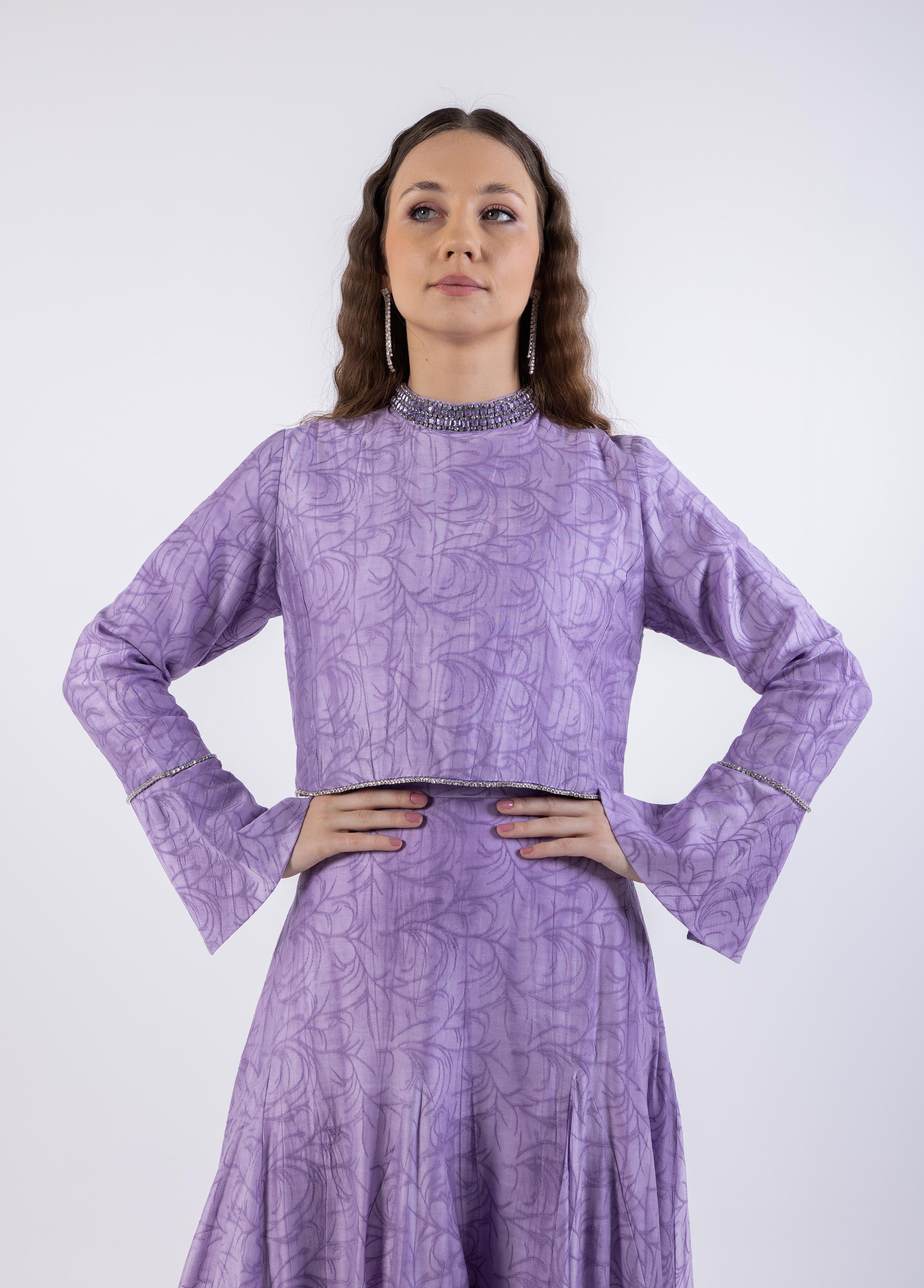 أبرزي أناقتك الراقية مع هذا التوب القصير المصمم بنقشة فنية ناعمة ولمسات كريستالية لامعة تزين الياقة، الأكمام، والحافة السفلية. يتميز بقصة هيكلية أنيقة وياقة مستديرة محافظة، بينما تضيف الأكمام الواسعة قليلاً لمسة أنثوية ناعمة. يمكن ارتداؤه مع التنورة المطابقة لإطلالة متناسقة أو تنسيقه بشكل منفصل لإطلالة عصرية فريدة. يُمكن تنسيقه مع التنورة كود 2501007 للحصول على مظهر متكامل.