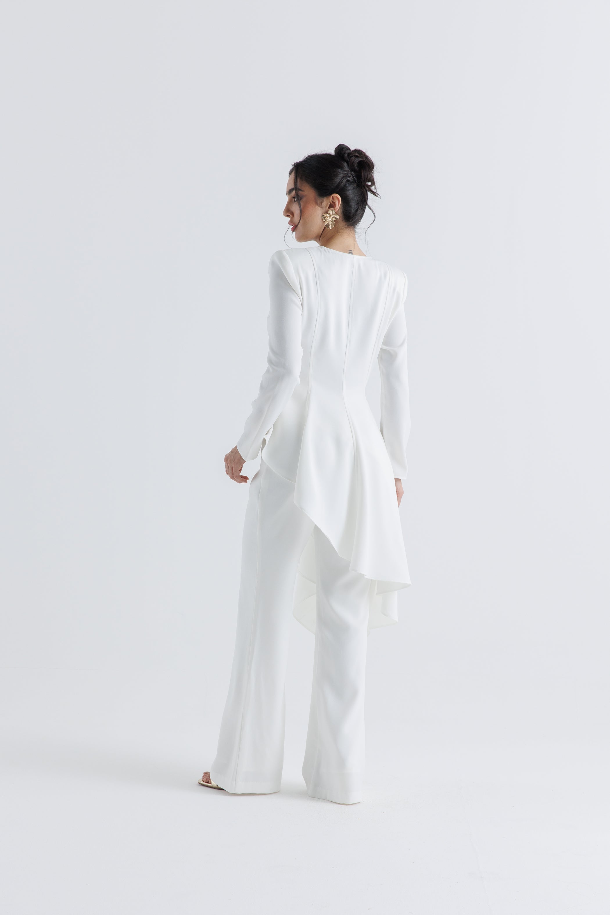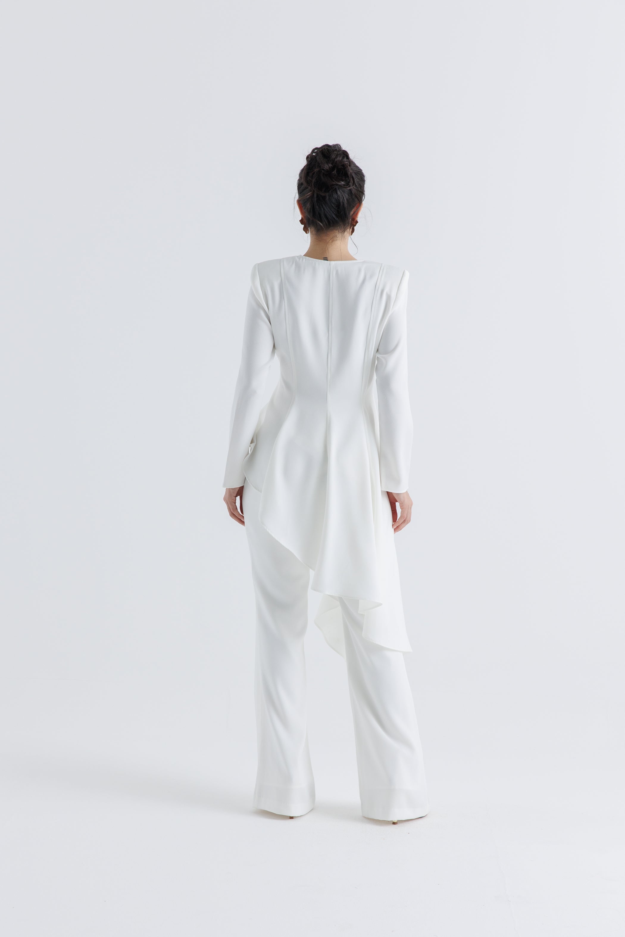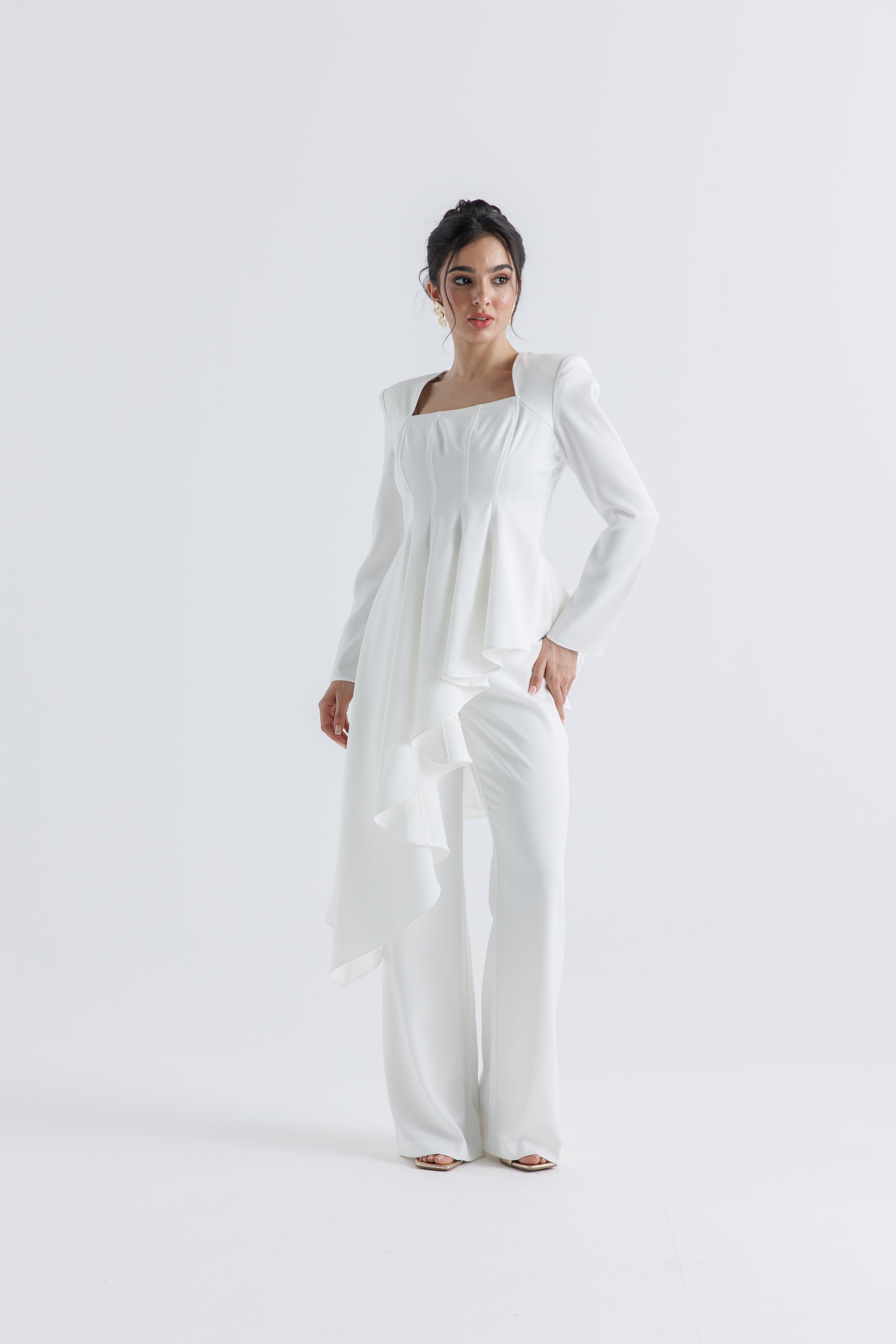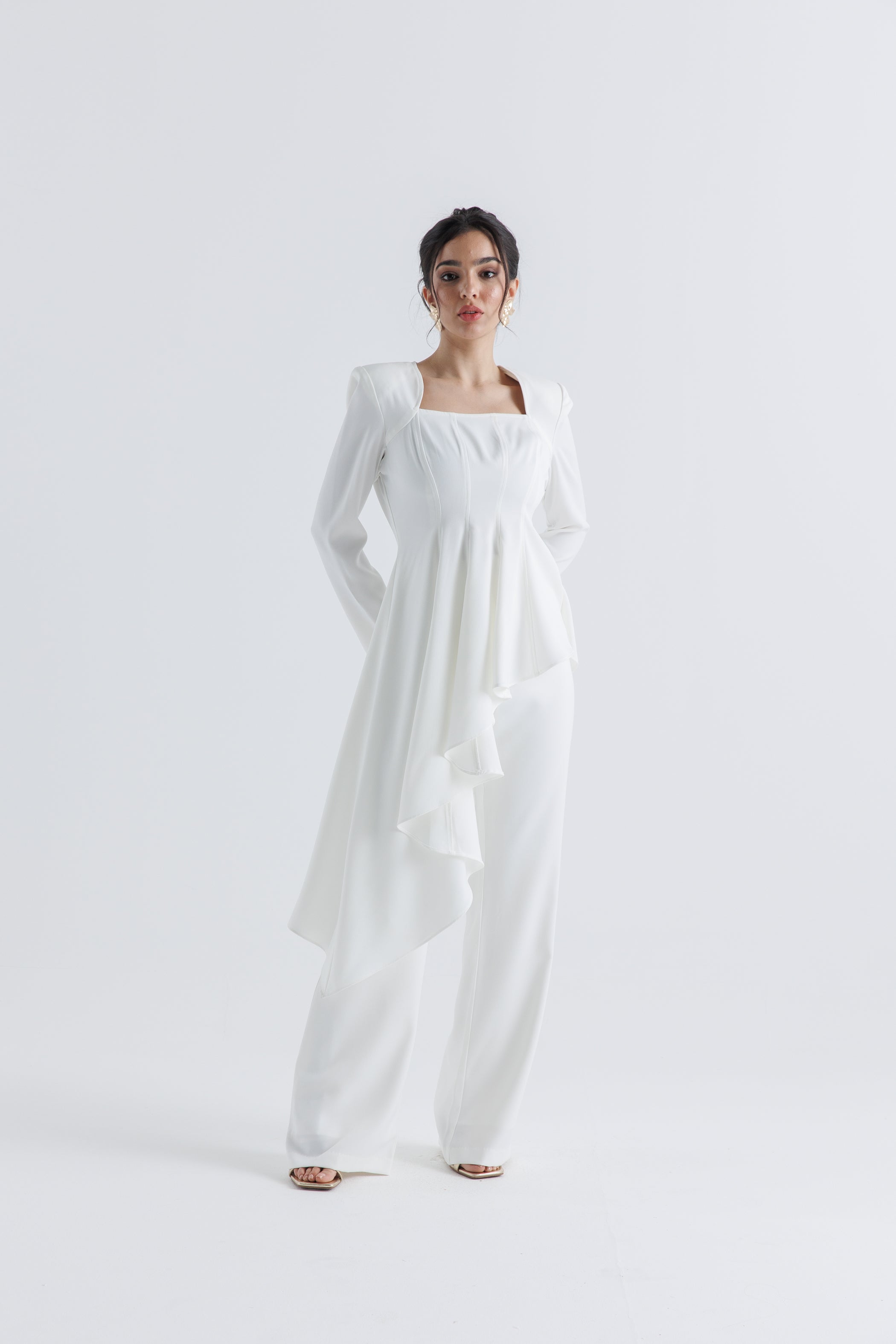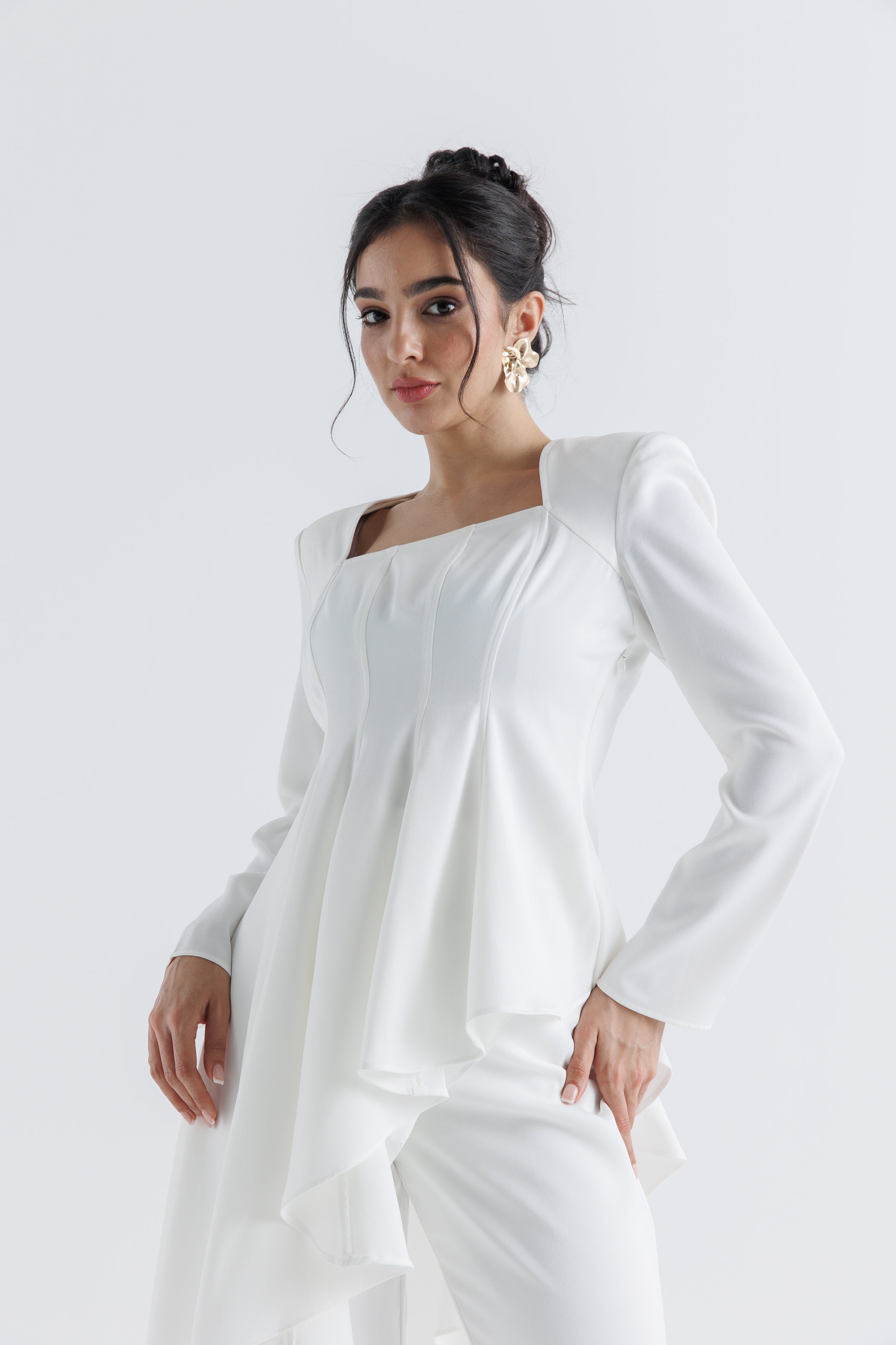 تميّزي بإطلالة أنثوية راقية مع هذه البلوزة المصممة من قماش الكريب عالي الجودة، الذي يجمع بين البنية والانسيابية. تتميز بياقة مربعة وخطوط خياطة ناعمة تمنح الجسم مظهراً محدداً، بينما تنسدل الحافة غير المتماثلة من الأمام والخلف بانسيابية أنيقة تضيف لمسة عصرية. الأكمام الطويلة والتفصيل المصمم بعناية يجعلها مثالية للإطلالات الرسمية أو المناسبات. يمكن تنسيقها بكل سهولة مع البنطال المطابق (كود 2504006) لإطلالة متكاملة وعصرية.