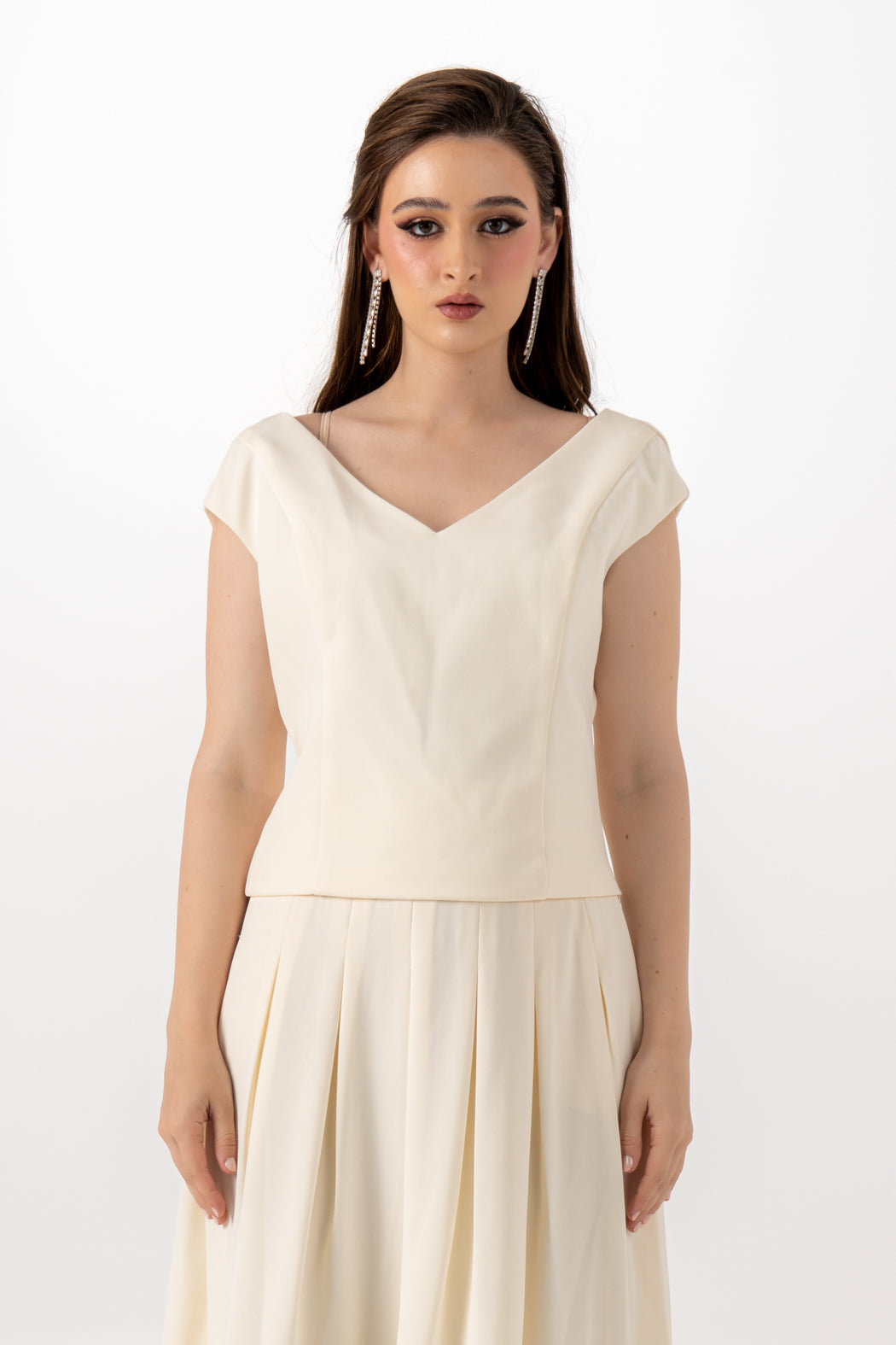 ارتقي بإطلالتك مع هذا التوب الأنثوي الأنيق المصمم بياقة على شكل قلب وأكمام قصيرة كاب تضيف لمسة ناعمة. يتميز بقصة محددة تبرز الخصر وتمنحك مظهراً أنيقاً وجذاباً يناسب الإطلالات الرسمية وشبه الرسمية. يبلغ طول التوب تقريباً 48 سم، مما يجعله مثالياً لإطلالة راقية ومتقنة.