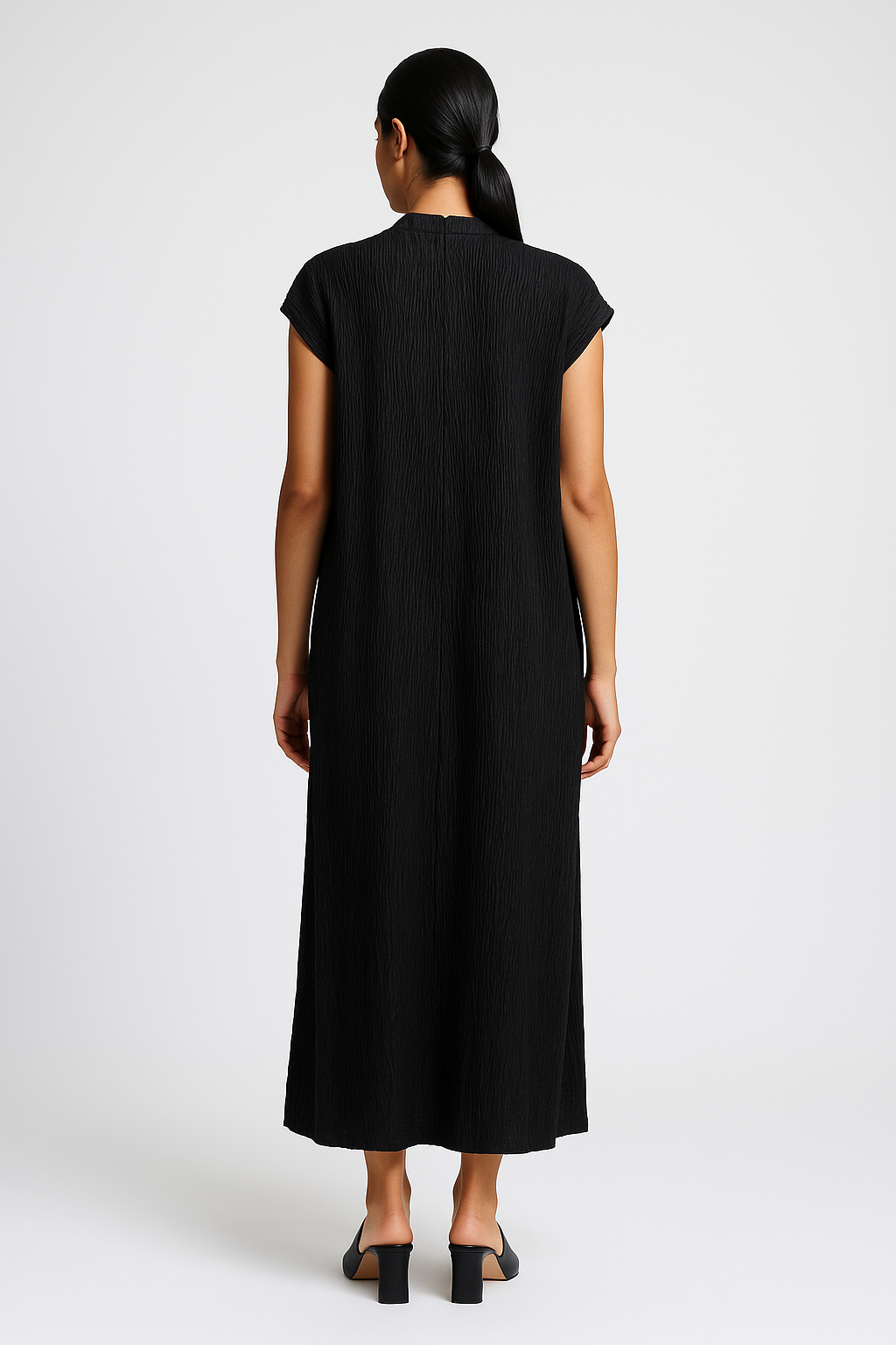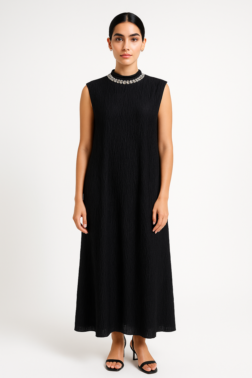 طقم أنيق يجمع بين الرقي والراحة في تصميم واحد. يتكوّن من فستان ماكسي بلا أكمام بقماش مكسّر...