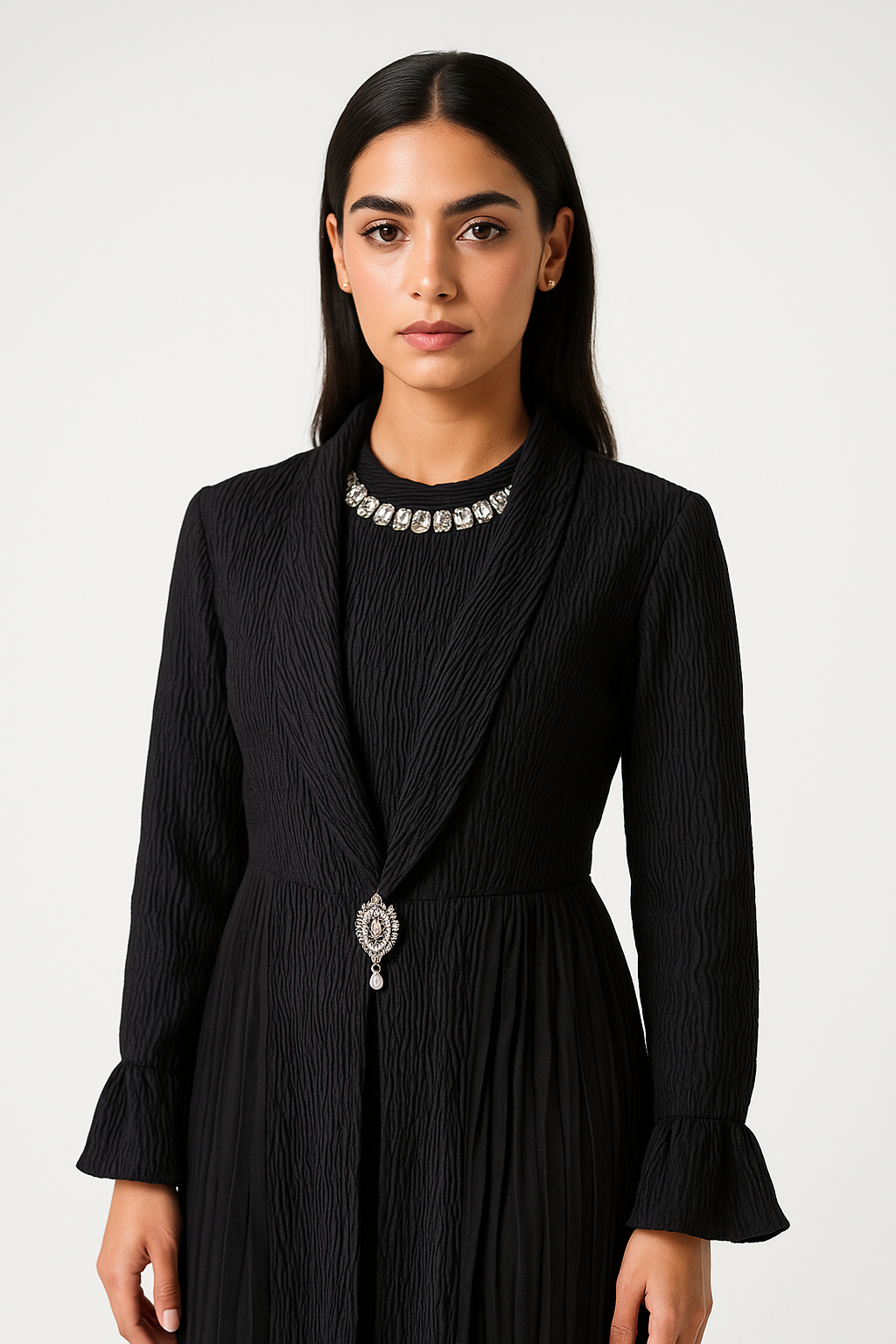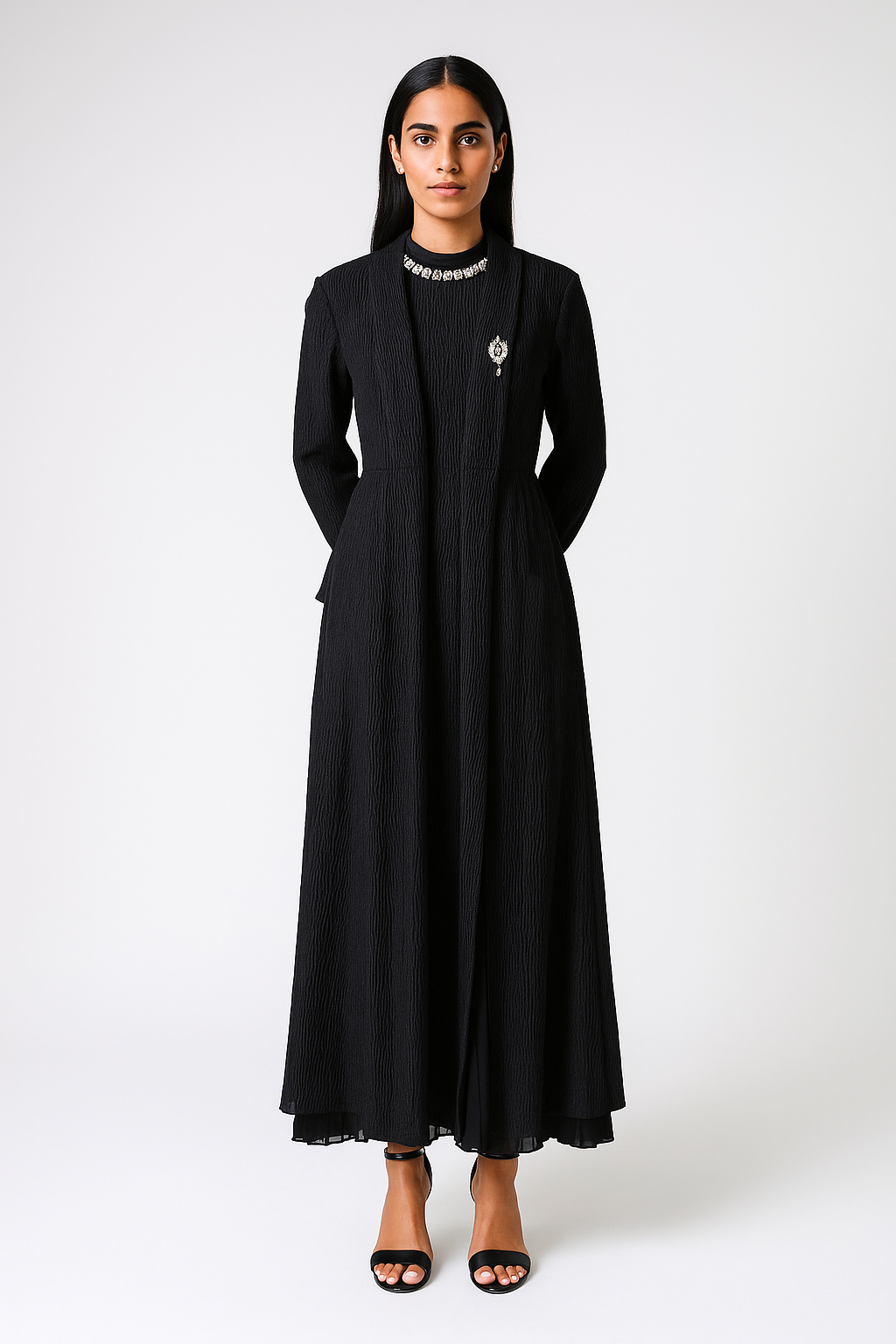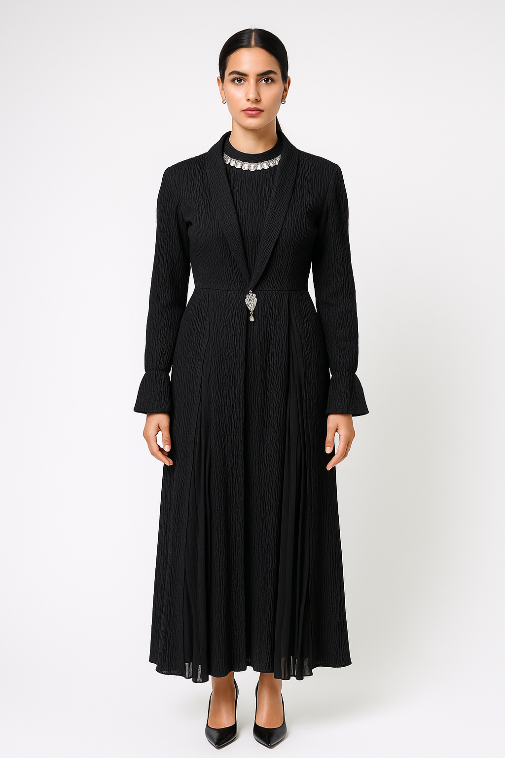 طقم أنيق يجمع بين الرقي والراحة في تصميم واحد. يتكوّن من فستان ماكسي بلا أكمام بقماش مكسّر جميل، مع كارديغان طويل بنفس الخامة ليمنحك إطلالة متناسقة ومثالية للمناسبات والزيارات والإطلالات المحتشمة الراقية.