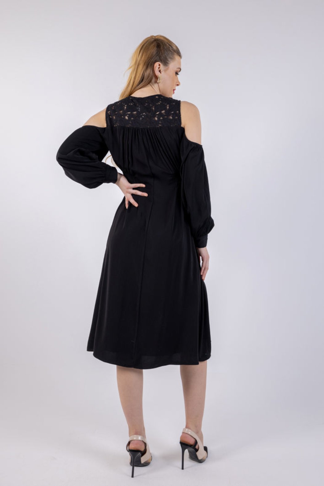أضفي لمسة من الأناقة إلى خزانة ملابسك مع فستان ميدي بأكمام مكشوفة وتفاصيل دانتيل أنيقة، فهو قطعة خالدة تجمع بين الأناقة العصرية والسحر الكلاسيكي. يتميز هذا الفستان بياقة من الدانتيل المزخرف بتصميم دقيق، مما يضفي لمسة راقية وفريدة. كما تضيف الأكمام المكشوفة لمسة من الجاذبية، بينما توفر الأكمام الطويلة الواسعة ذات الأساور المطاطية مزيجًا مثاليًا من الراحة والأناقة. ويبرز التصميم المجمع عند الخصر جمال القوام، مما يجعله خيارًا مثاليًا للمناسبات غير الرسمية أو الخاصة.