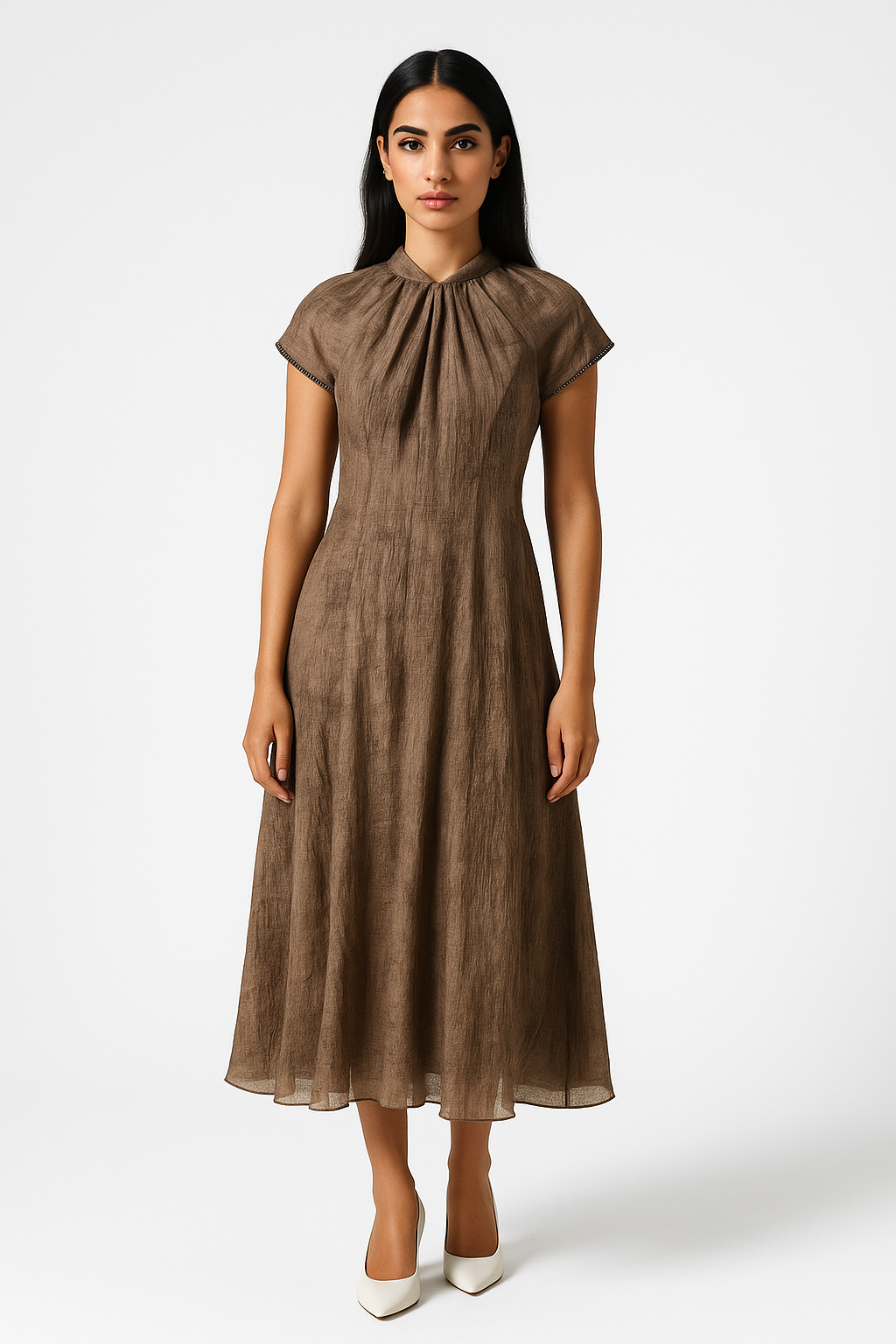فستان أنيق يجمع بين البساطة الراقية والتفاصيل الناعمة. يتميز بياقة مجمعة برقة وأكمام قصيرة مزخرفة، مع قصة على شكل A تنسدل بانسيابية لتعطي إطلالة أنثوية راقية. يبلغ طول الفستان حوالي 128 سم، مما يجعله مناسبًا لإطلالات النهار المميزة والمناسبات المسائية الأنيقة.