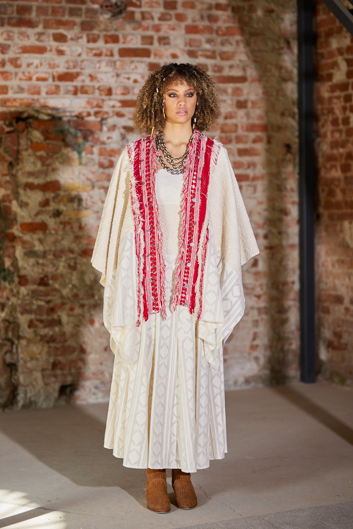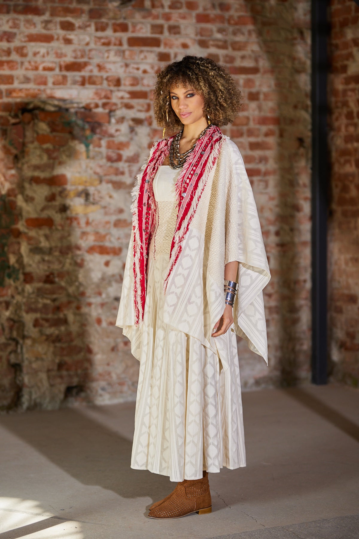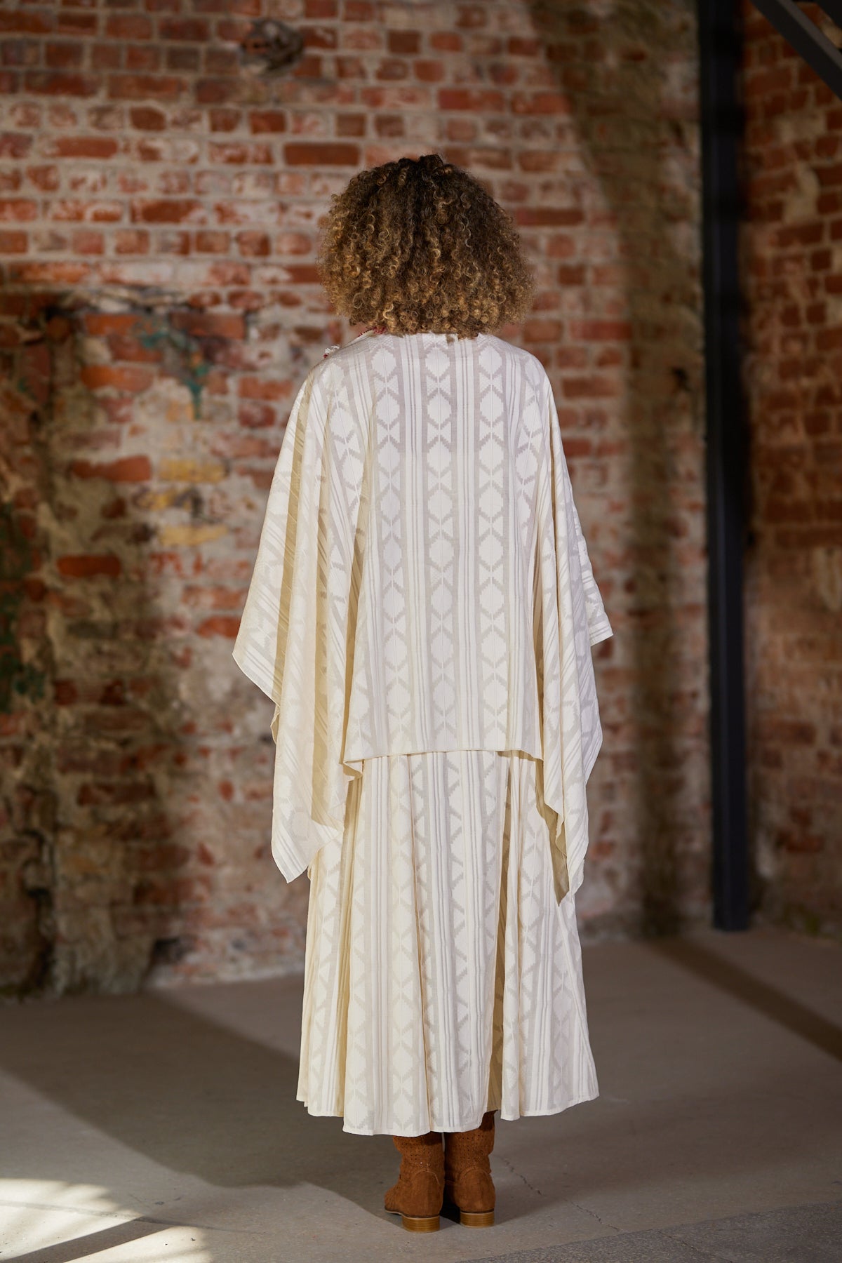 يتميز هذا الفستان بحمّالات بتصميم أنيق وانسيابي، مصنوع من قماش منسوج بنسيج ناعم مع نقشة جاكار هندسية خفيفة تضفي لمسة فاخرة وراقية. ينسدل الفستان بطول تقريبي يبلغ 140 سم ليمنح حركة ناعمة ومظهراً ممشوقاً بشكل طبيعي. ويكتمل التصميم بـ شال متناسق مصنوع من قماش منسوج خفيف بملمس غني وانسيابية لطيفة، صُمّم ليوضع بسهولة على الكتفين ويضفي عمقاً وأناقة دون مبالغة، مع تفاصيل نسج دقيقة تعزز الطابع الراقي للإطلالة.