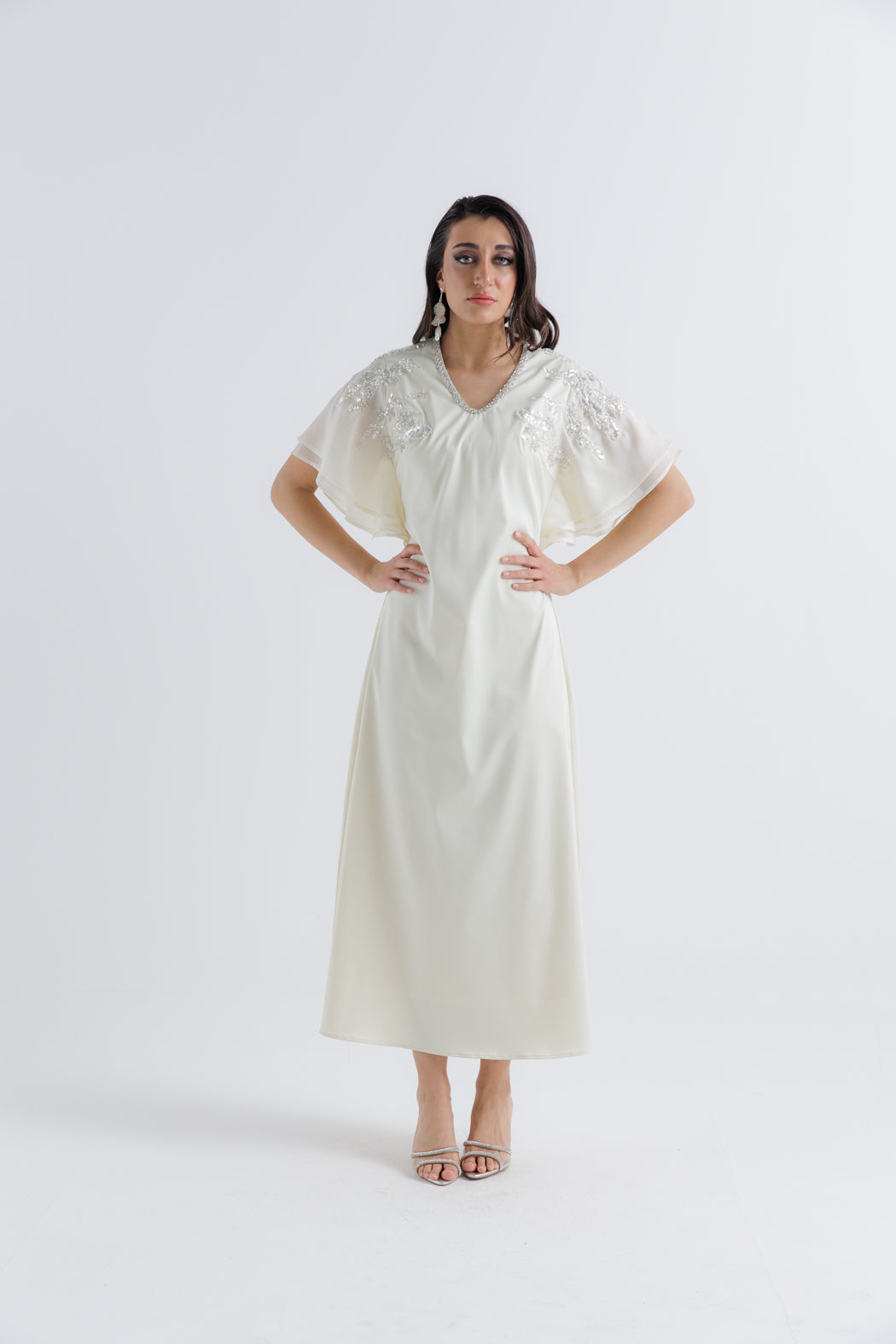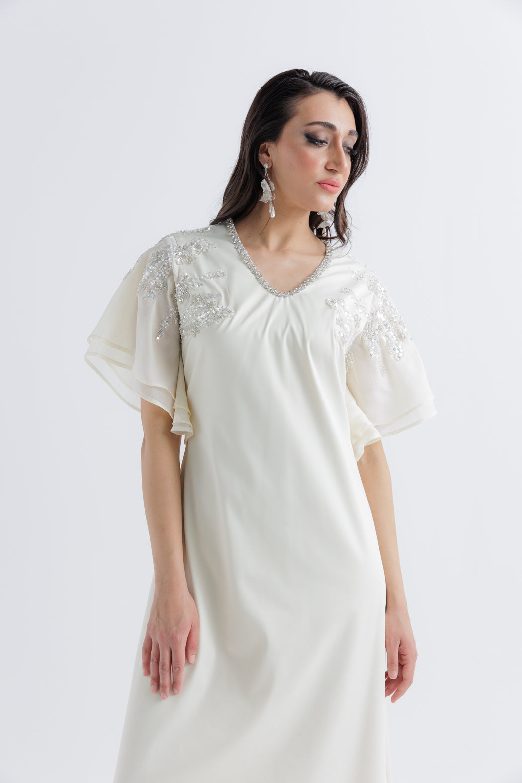 يتميز هذا الفستان الماكسي بتصميم أنيق وانسيابي، مع أكمام فلوتر ناعمة تضيف لمسة أنثوية ساحرة. الجزء العلوي والكتفان مزينان بتطريزات دقيقة من الترتر والخرز على شكل زهور، تضفي لمعة ناعمة وأناقة راقية. كما أن فتحة الرقبة على شكل V مزينة يدوياً بالخرز، مما يعزز من جمال التصميم ويجعله مثالياً للسهرات والمناسبات الخاصة.