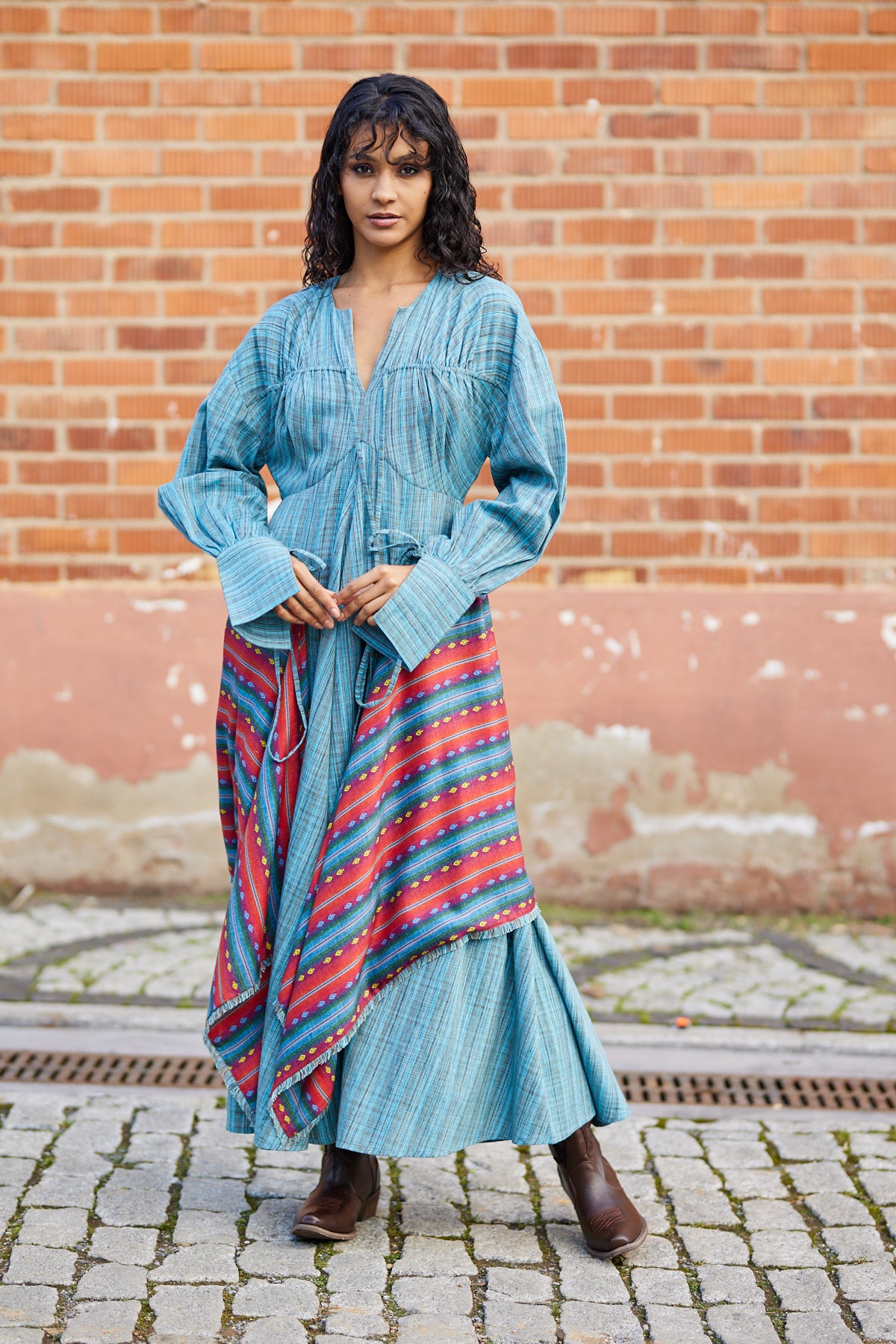 ✔️ التنورة: تصميم طويل بطبقات متدرجة مع لوحة جانبية مزينة بخطوط جريئة وزخارف أنيقة تضيف لمسة نابضة بالحياة.
