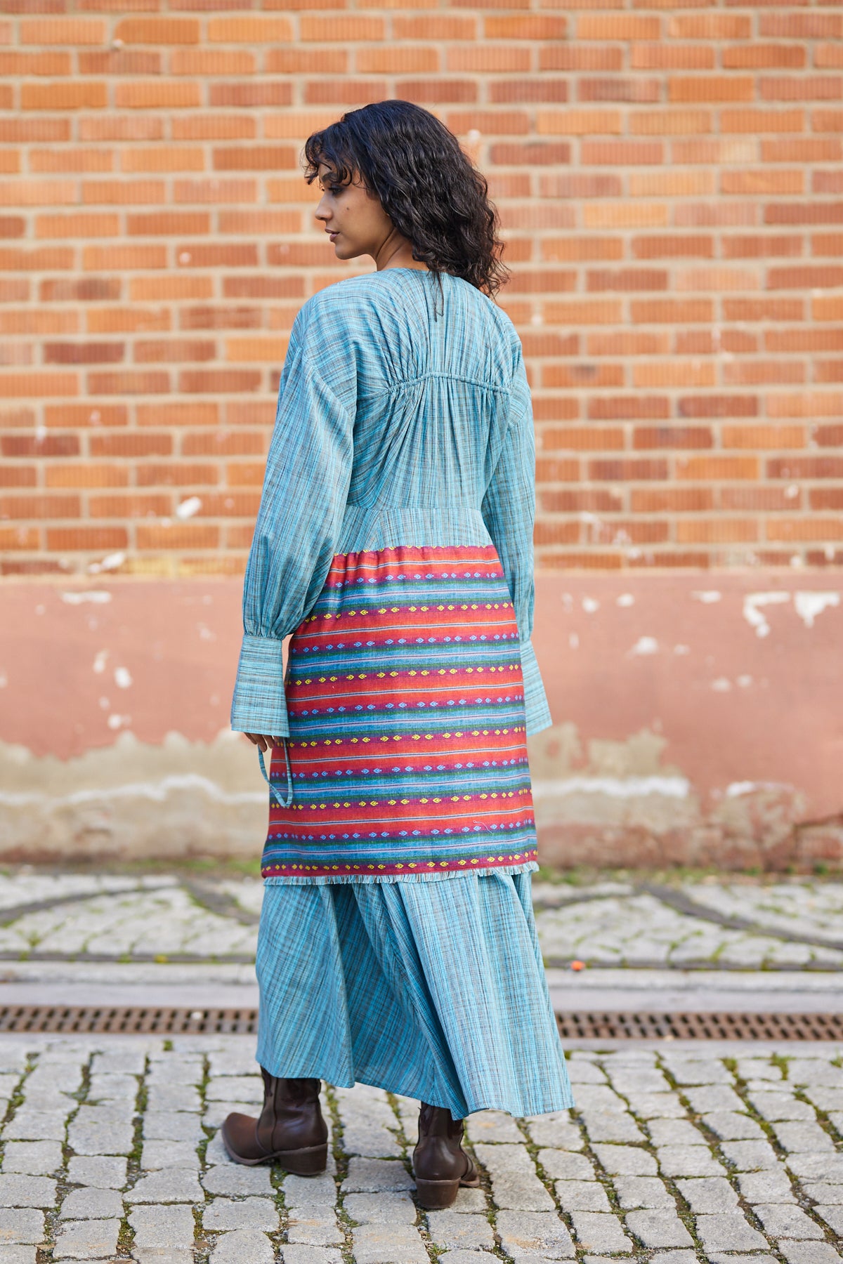 من تصميم أبرار المبارك، يتميز هذا الفستان الأنيق بطول كامل بمزيج متناغم من الحرفية التقليدية والرقي العصري. مثالي لاحتفالات رمضان والعيد، حيث يعكس الرقي والانسيابية من خلال تصميمه الفريد وتفاصيله الدقيقة.