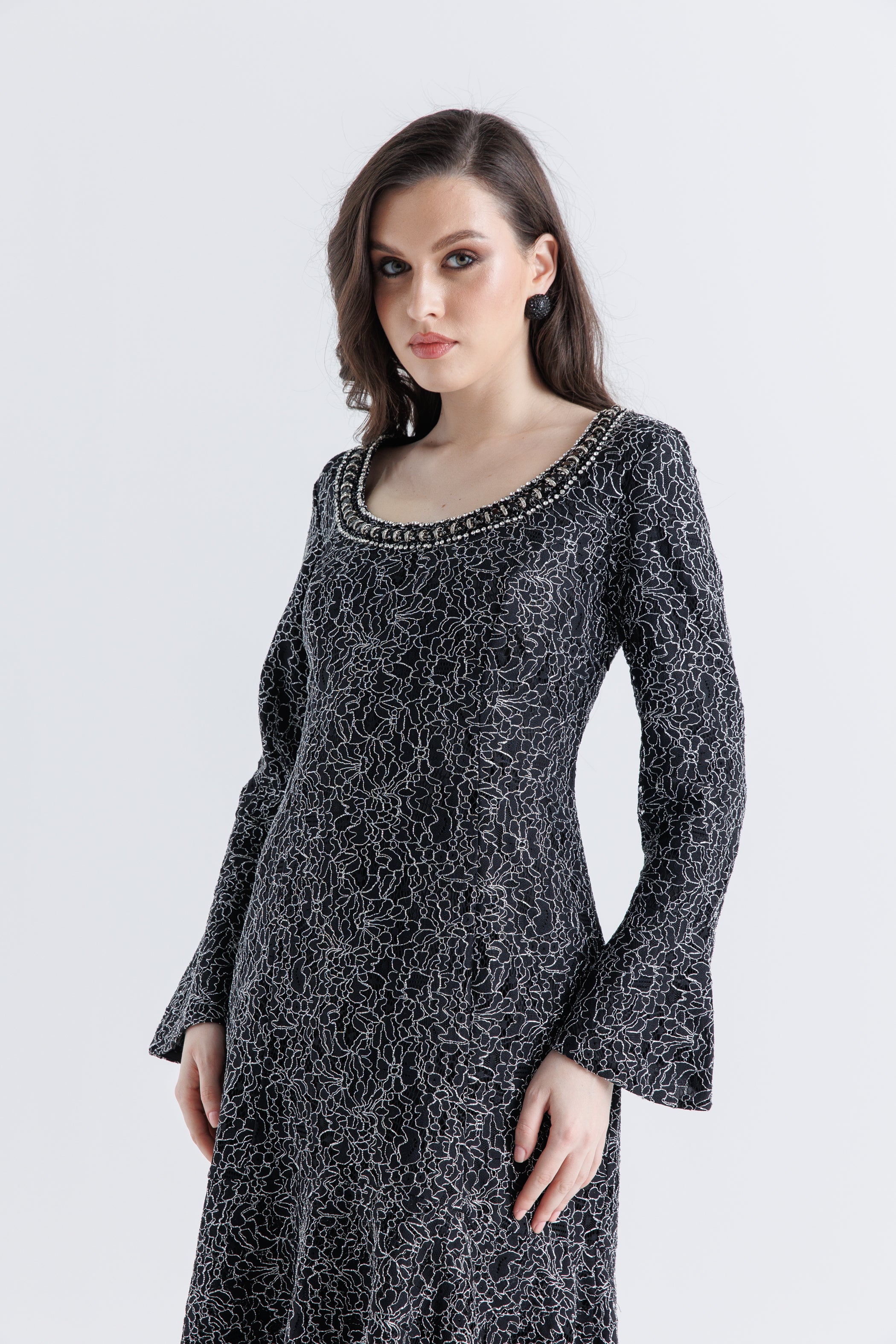 تألقي بإطلالة ساحرة مع هذا الفستان الماكسي المصنوع من الدانتيل المزخرف، المصمم خصيصًا للمناسبات الراقية مثل رمضان وعيد الفطر. يتميز بفتحة رقبة دائرية مزينة بفصوص براقة تضيف لمسة من الفخامة، بينما تمنحك الأكمام الطويلة الواسعة مظهرًا أنيقًا وانسيابيًا. تضفي طبقات قماش الدانتيل الفاخر لمسة فاخرة، كما أن التصميم الخلفي المربوط بأسلوب الكورسيه يمنحك ملاءمة مثالية. أما تصميم الحافة غير المتساوي فيضفي حركة ورشاقة على إطلالتك.
