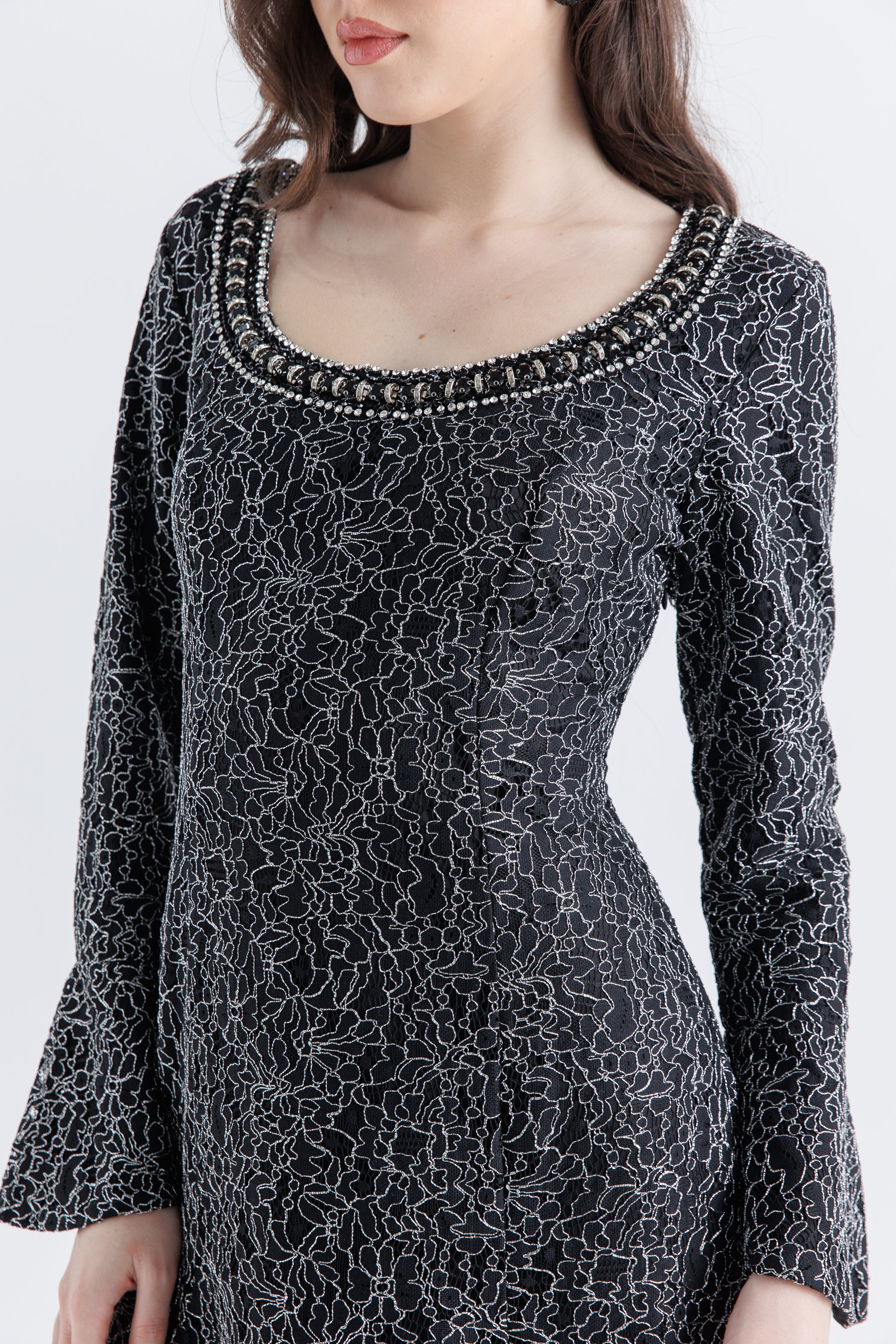 ✔ فتحة الرقبة: دائرية مزينة بالفصوص البراقة