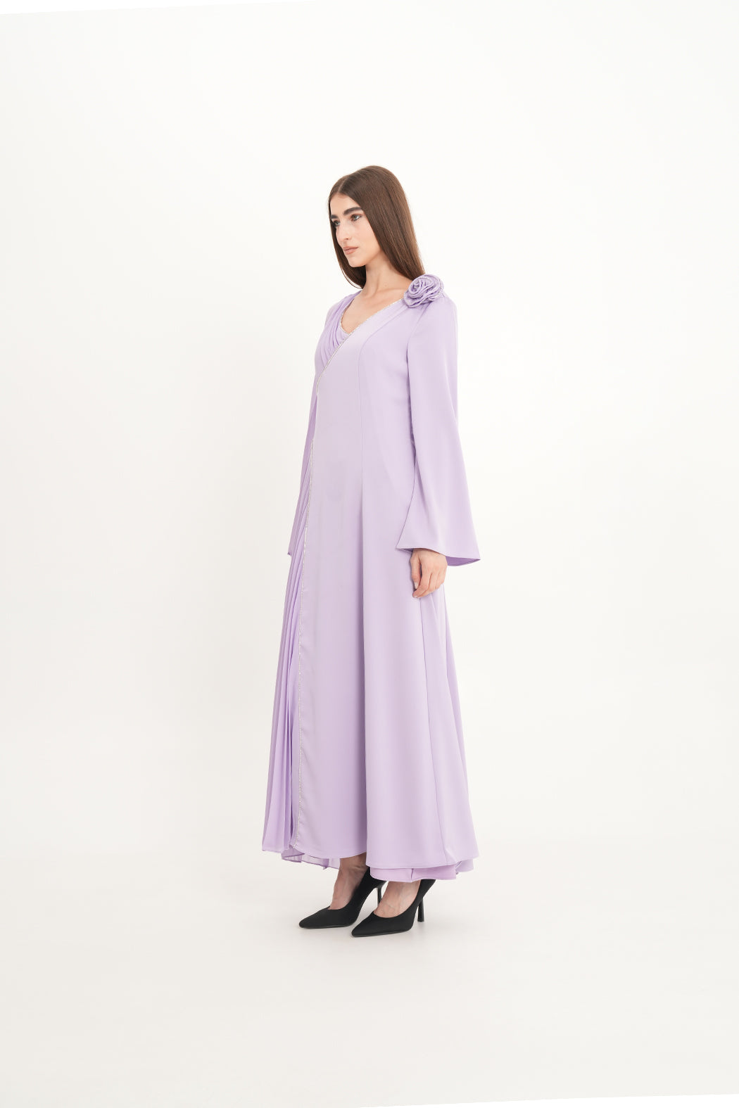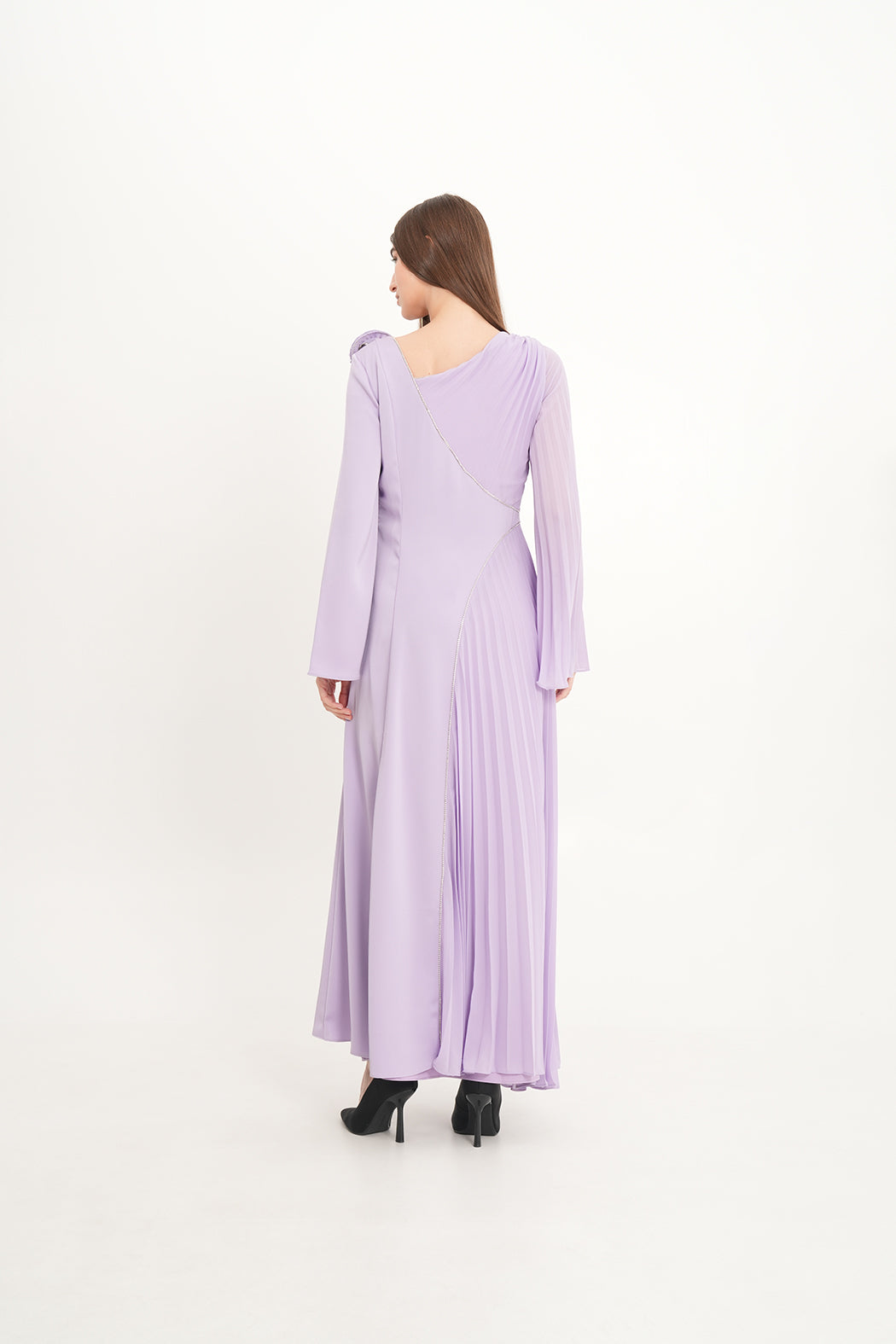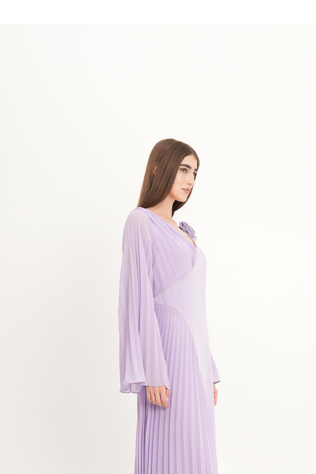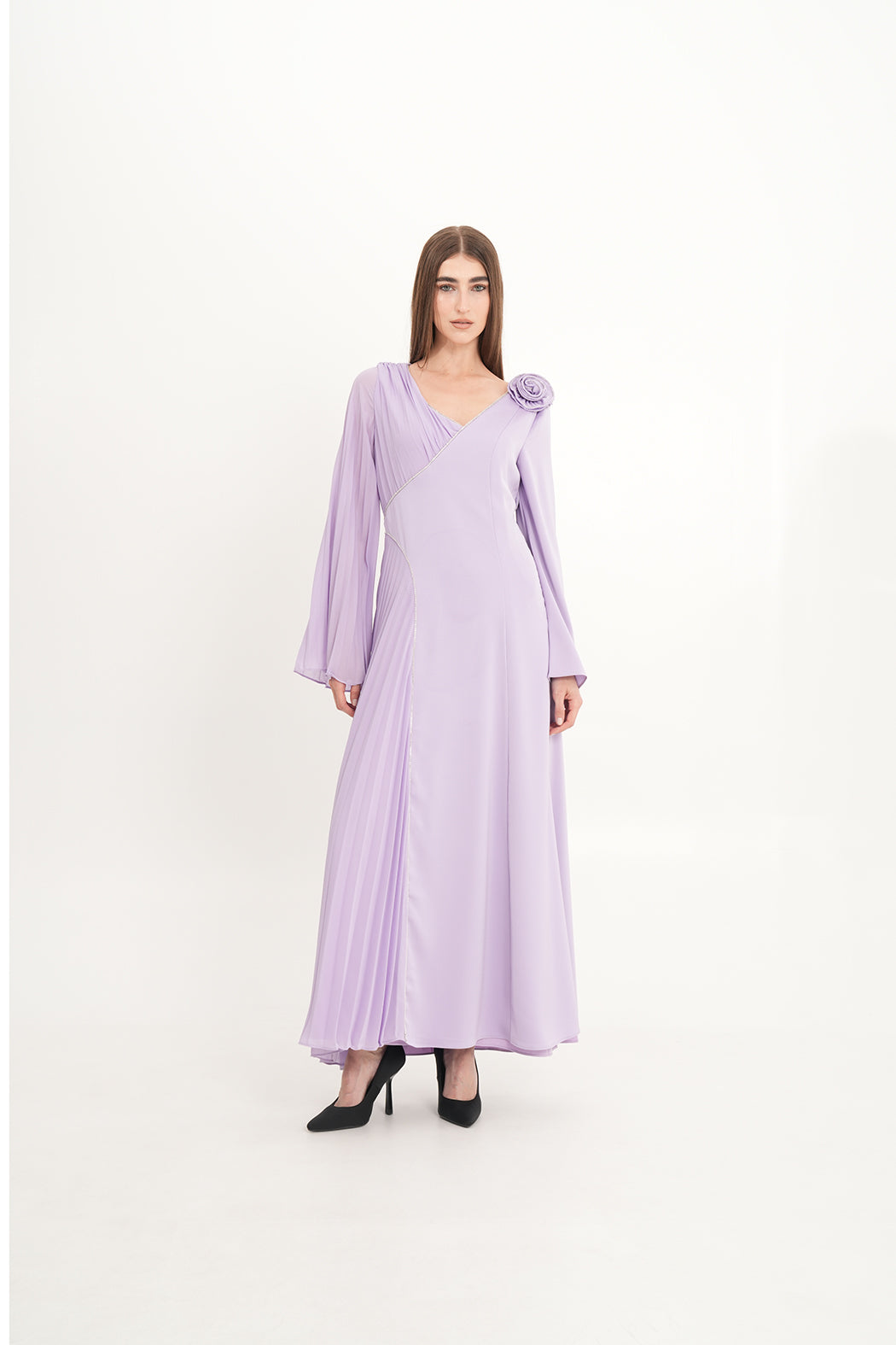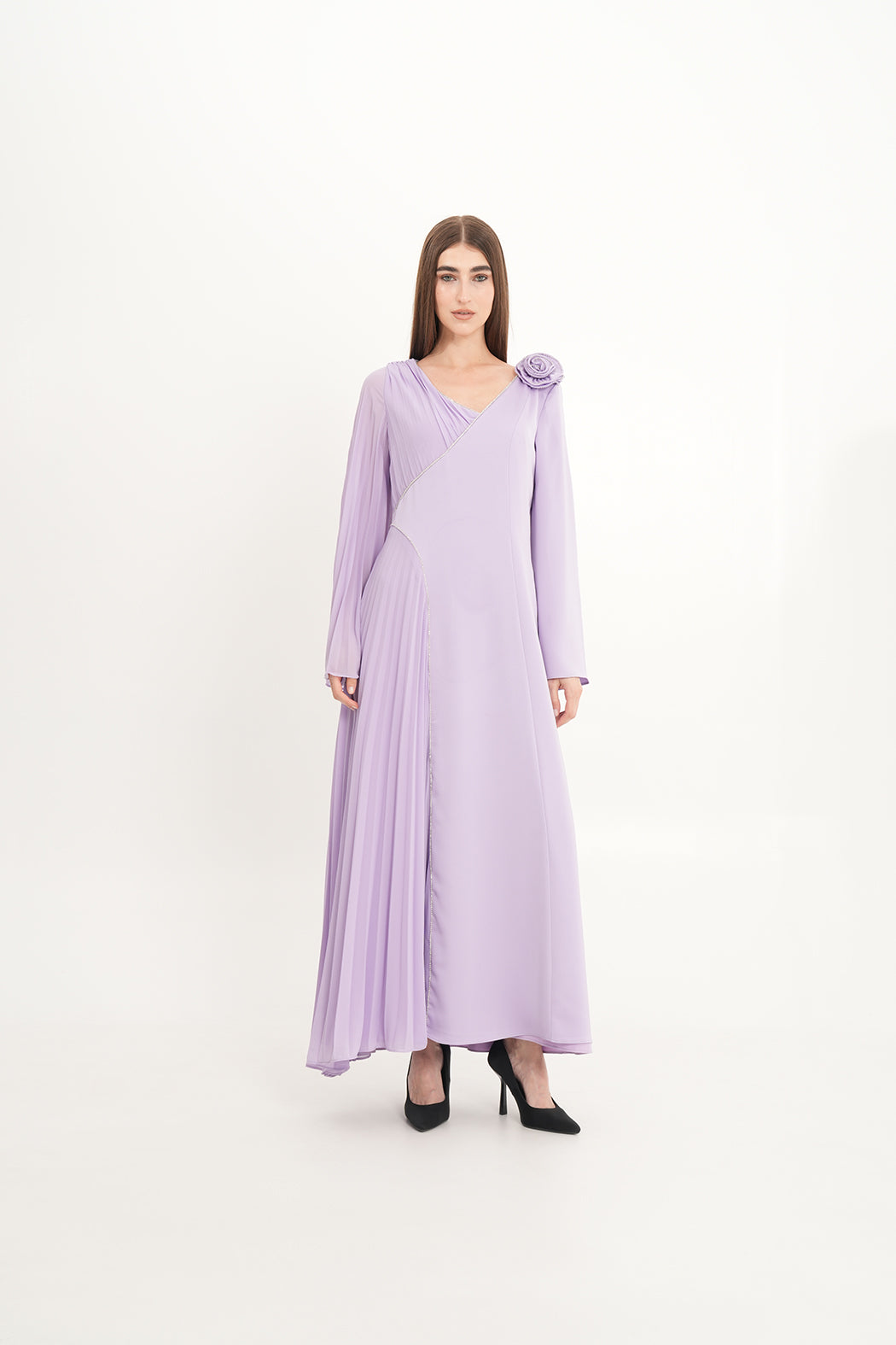 فستان أنيق بطول كامل مصنوع من مزيج ناعم من الشيفون والساتان، يتميز بتصميم غير متماثل يضفي لمسة انسيابية أنثوية مع كسرات جانبية تضيف حركة راقية. يأتي بياقة على شكل V بطيات ناعمة تضفي لمسة فاخرة، وتكتمل أناقته بوردة مزينة على الكتف تضيف لمسة رومانسية. كما تبرز خطوط التصميم بزخارف كريستالية ناعمة تضيف بريقًا رقيقًا. مثالي للمناسبات الرسمية والسهرات الراقية. الطول التقريبي: 145 سم.