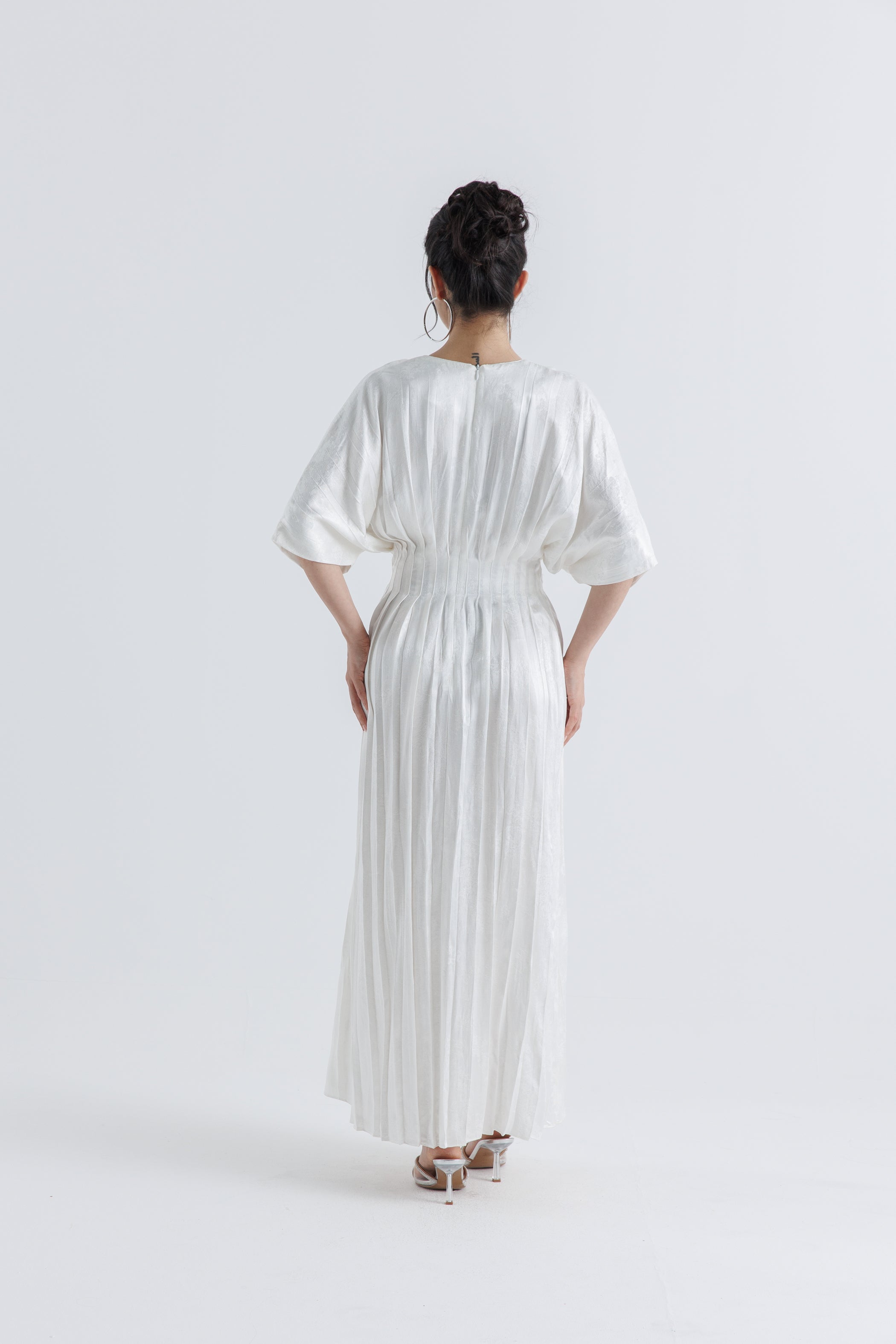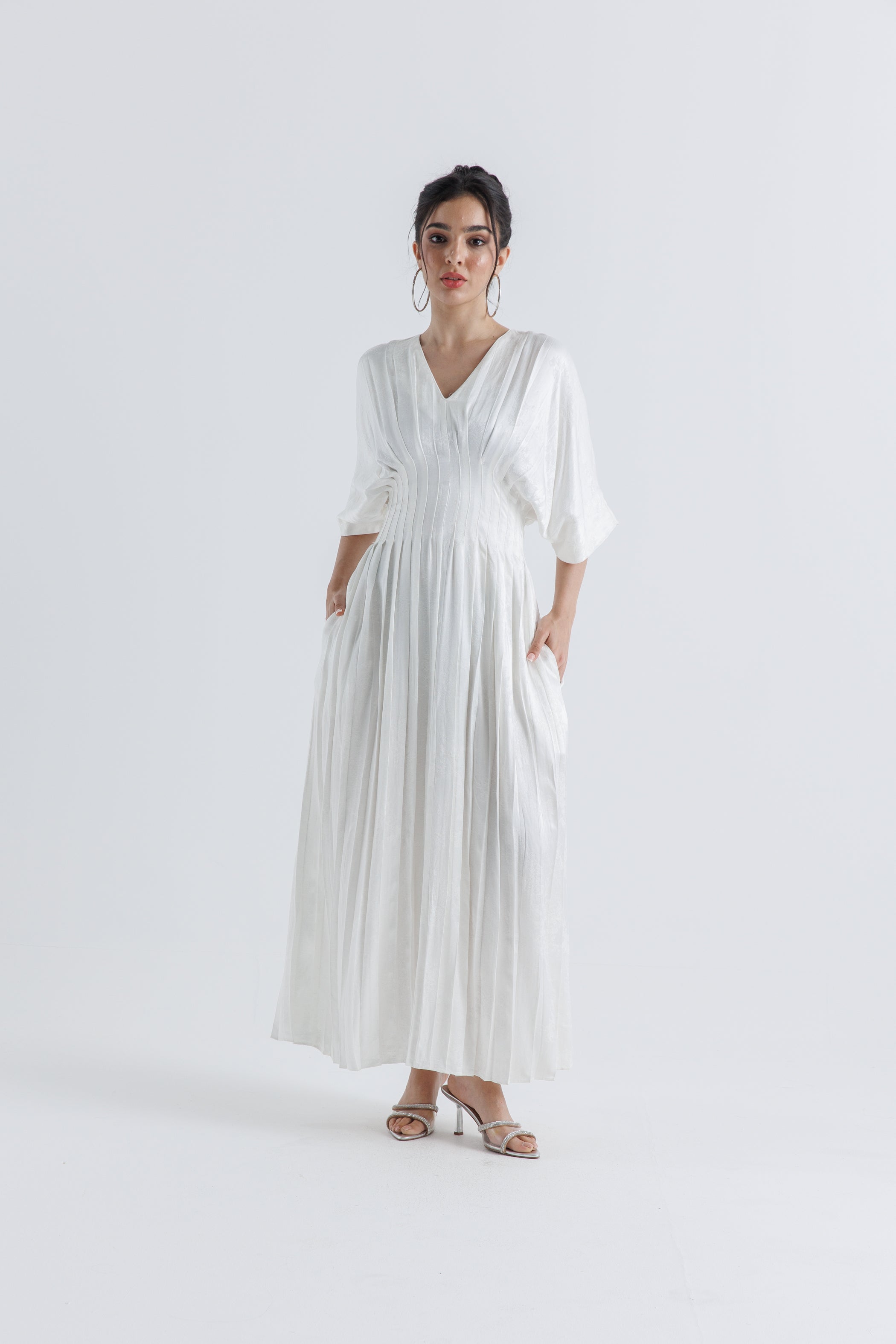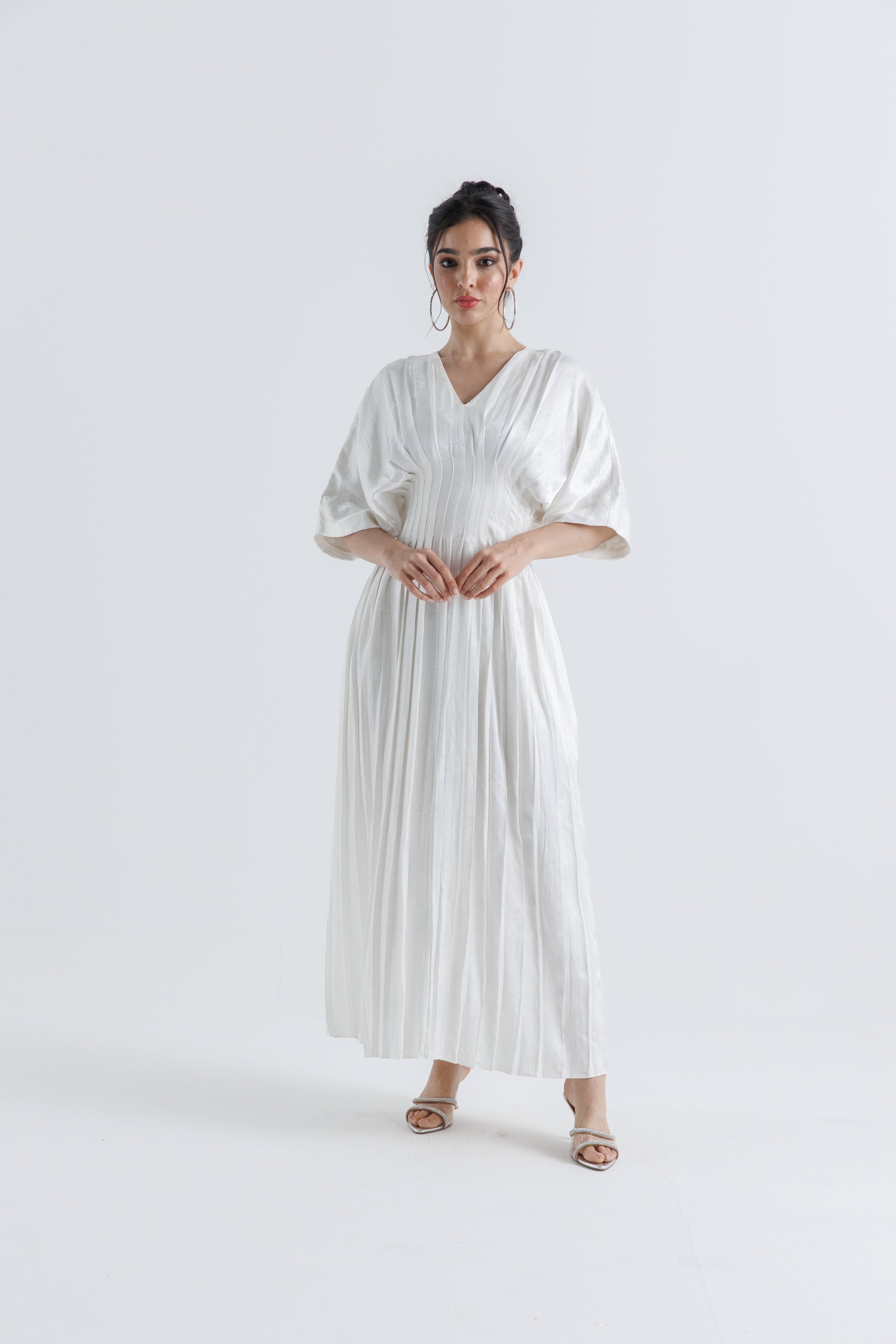 يجمع هذا الفستان الأنيق بين الرقي والراحة المعاصرة، بتصميم مطوي عمودي يمنح القوام طولاً وأناقة مع لمسة من الحيوية والانسيابية. يتميز بقصة مريحة مع ياقة على شكل V وأكمام قصيرة بتصميم الأجنحة (بات وينغ) تضيف لمسة ناعمة وعصرية. الحافة غير المتساوية تضفي لمسة حديثة وجذابة، ما يجعله خياراً مثالياً للمناسبات الخاصة أو الإطلالات النهارية الراقية. الطول التقريبي للفستان 140 سم عند النقطة الأطول.