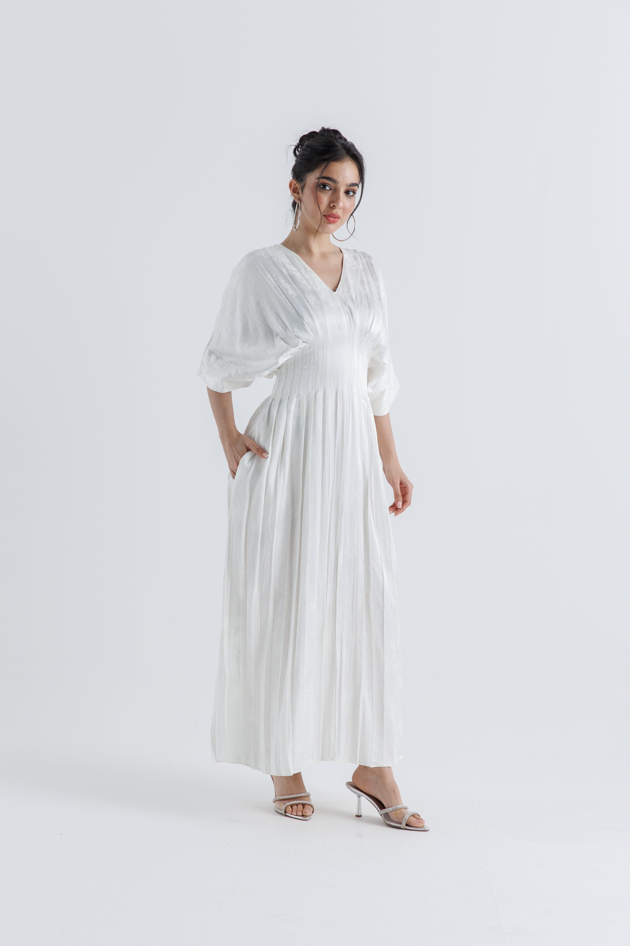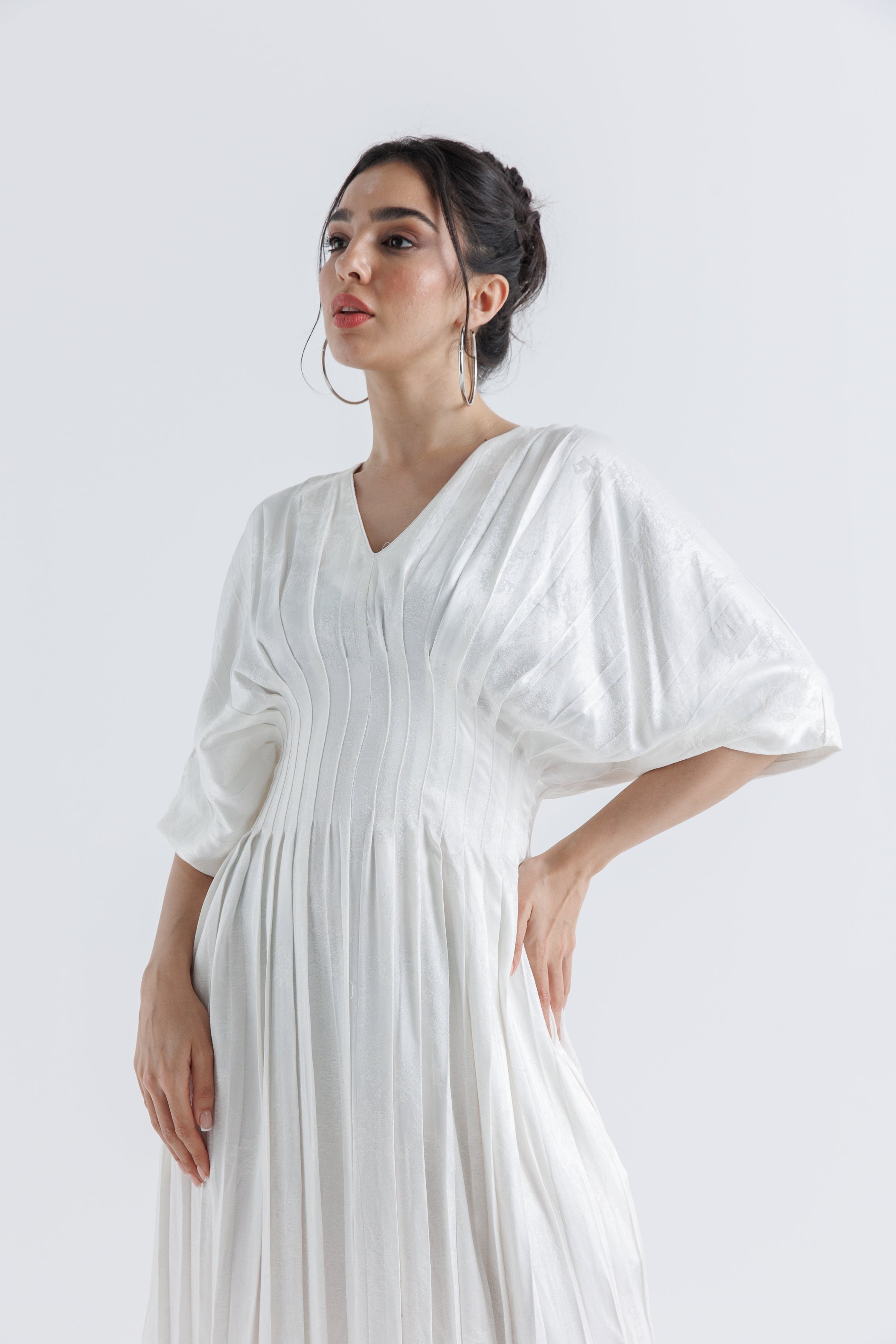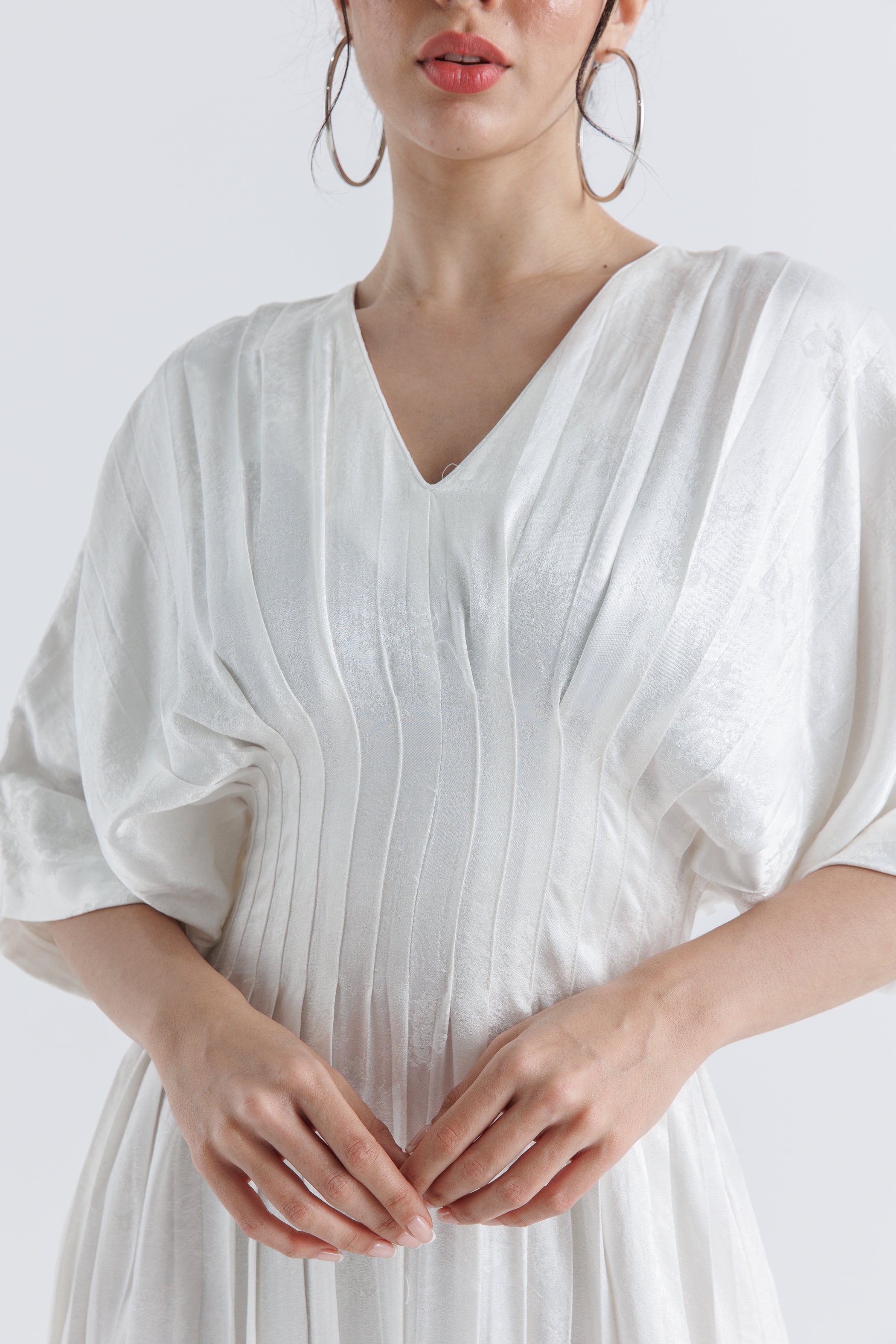 يجمع هذا الفستان الأنيق بين الرقي والراحة المعاصرة، بتصميم مطوي عمودي يمنح القوام طولاً وأناقة مع لمسة من الحيوية والانسيابية. يتميز بقصة مريحة مع ياقة على شكل V وأكمام قصيرة بتصميم الأجنحة (بات وينغ) تضيف لمسة ناعمة وعصرية. الحافة غير المتساوية تضفي لمسة حديثة وجذابة، ما يجعله خياراً مثالياً للمناسبات الخاصة أو الإطلالات النهارية الراقية. الطول التقريبي للفستان 140 سم عند النقطة الأطول.