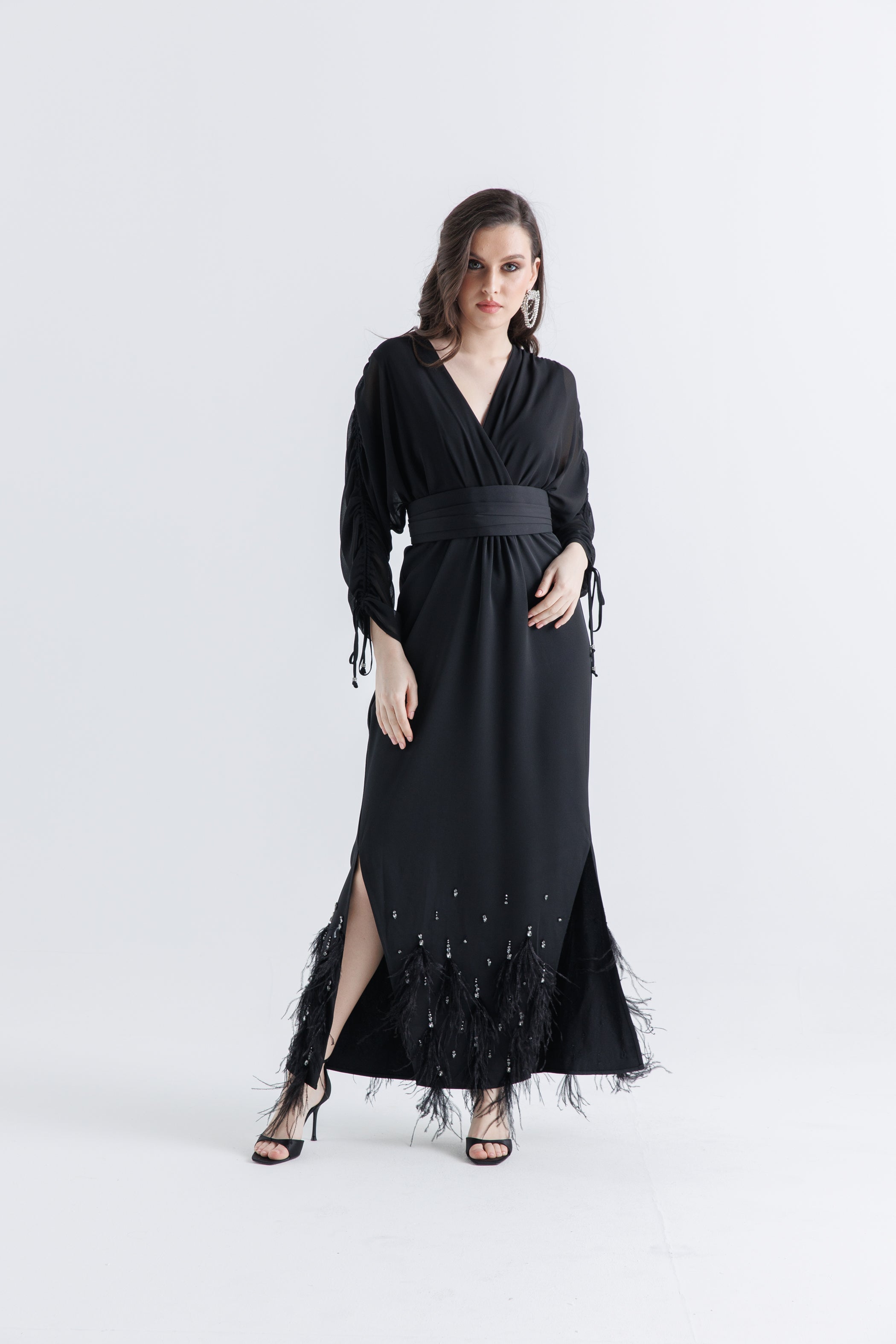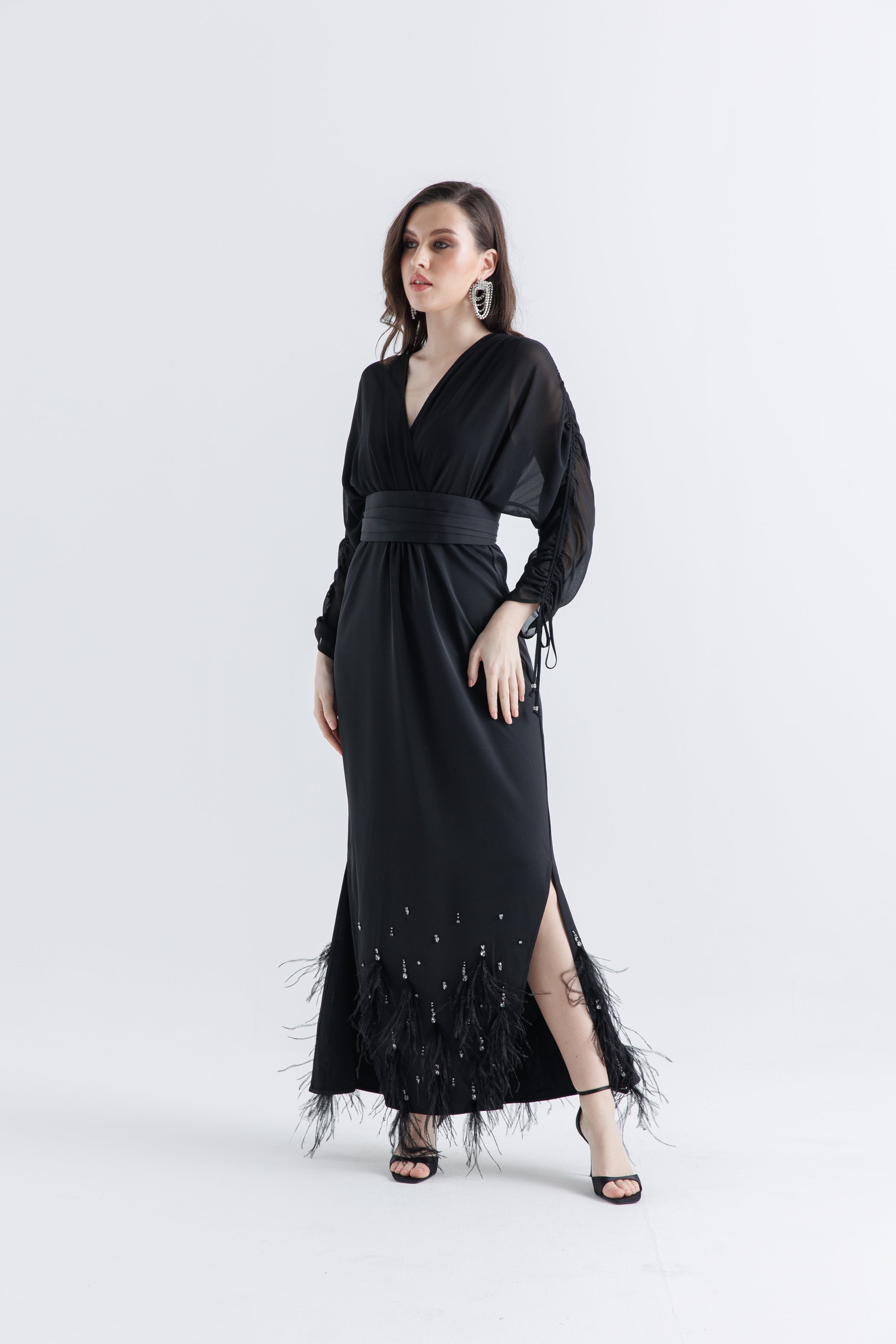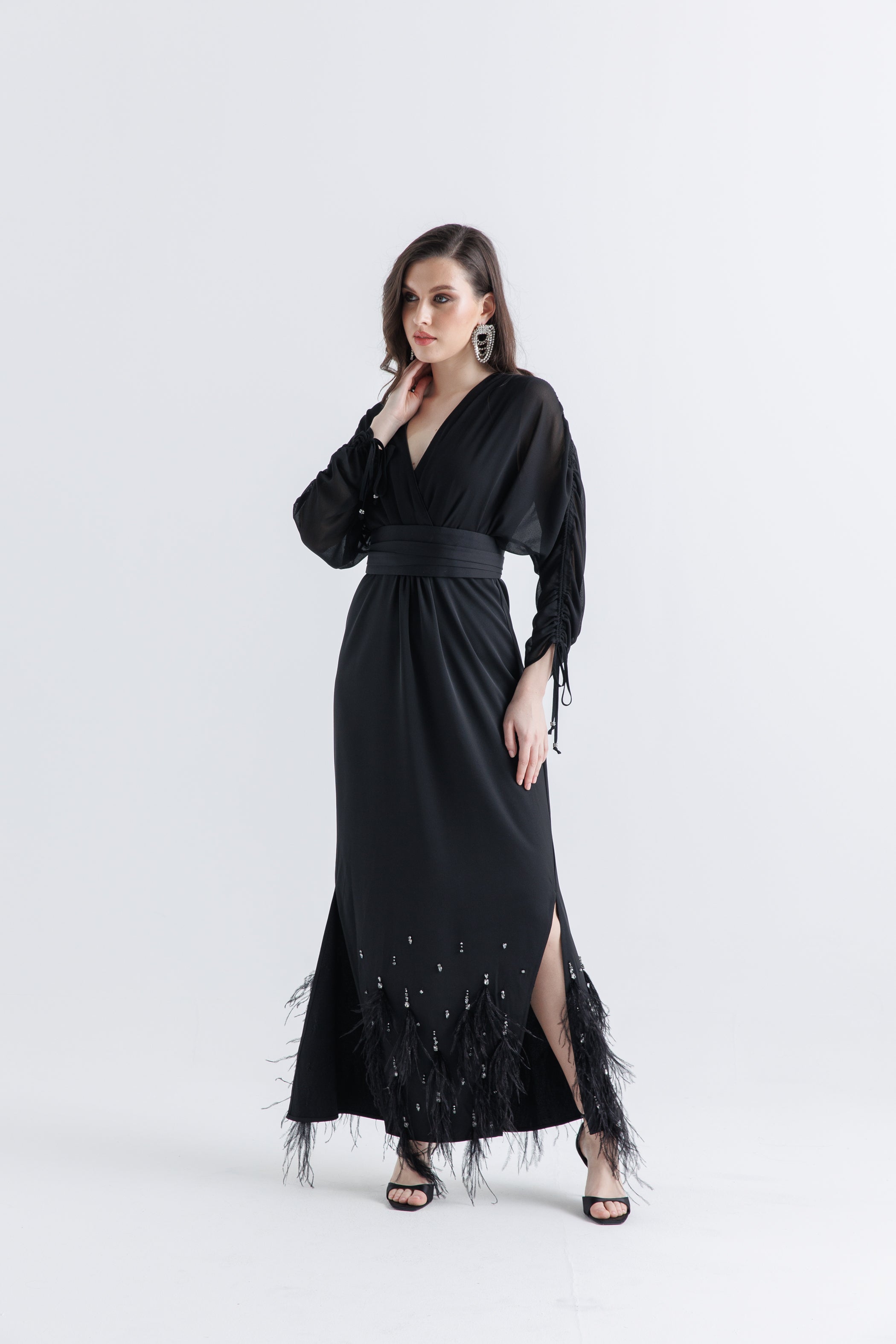 تألقي بإطلالة فاخرة مع هذا الفستان الماكسي الرائع الذي يتميز بتصميم أمامي ملتف يُبرز الخصر بحزام عريض ومثبت. الأكمام الطويلة مزينة بكشكشة أنيقة وأربطة قابلة للتعديل لمنحك لمسة تصميم قابلة للتخصيص. يزدان أسفل الفستان بتفاصيل فاخرة من الريش والكريستال، مع شقين جانبيين يضيفان حركة انسيابية ورقي للإطلالة. مصنوع من قماش خفيف غير مبطن، مما يمنحك انسيابية طبيعية ومظهرًا أنثويًا مثاليًا للمناسبات المسائية والاحتفالات الخاصة.