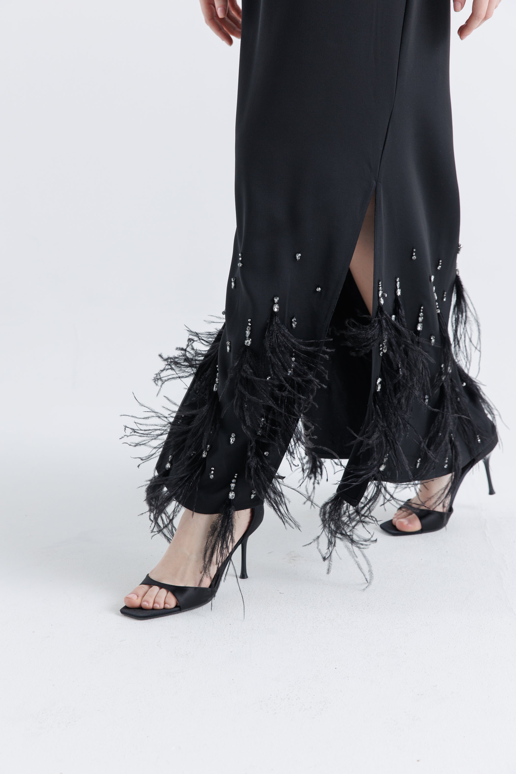 أسفل الفستان: مزين بالريش والكريستال مع شقين جانبيين
