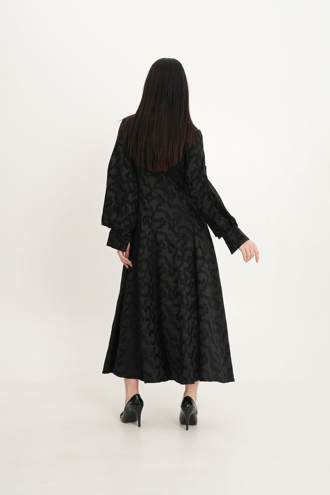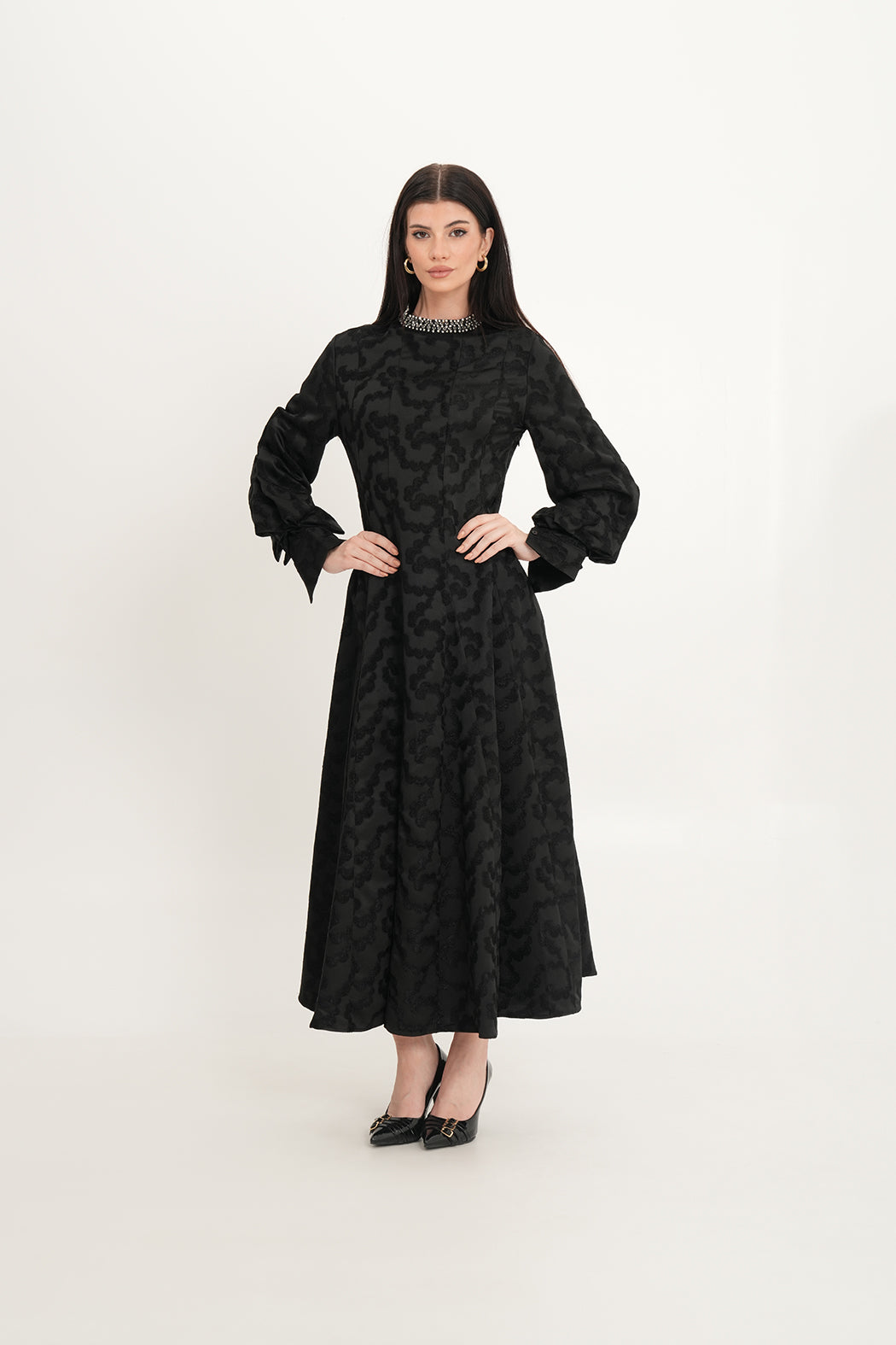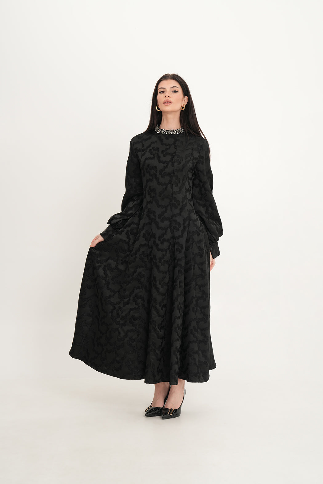 يلتقي الفخامة بالتفصيل في هذا الفستان الأنيق المصنوع من قماش الجاكار الفاخر، والمصمم خصيصًا للمناسبات الراقية. يتميز بقصة A واسعة تنسدل بانسيابية بطول تقريبي 135 سم، مع نقشات بارزة تضيف عمقًا ولمعانًا ناعمًا. أما الرقبة العالية فهي مزينة بتفاصيل براقة تضفي لمسة فاخرة. الأكمام الطويلة والمنفوخة مع الأساور الهيكلية تضيف طابعًا ملكيًا عصريًا لتصميم خالد.