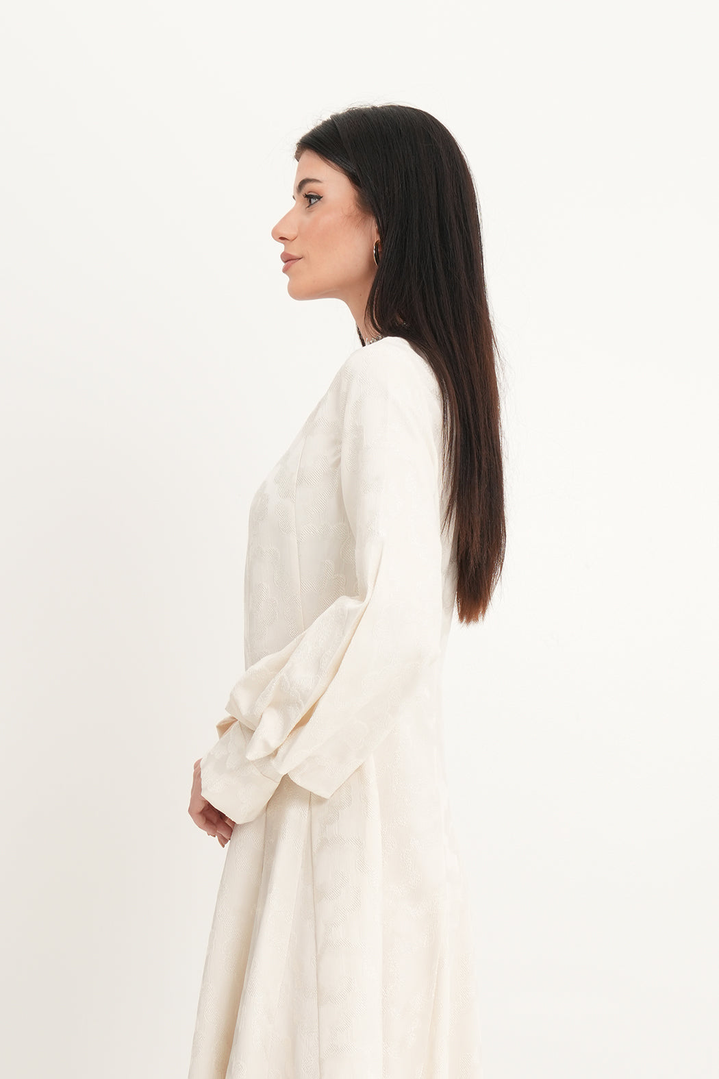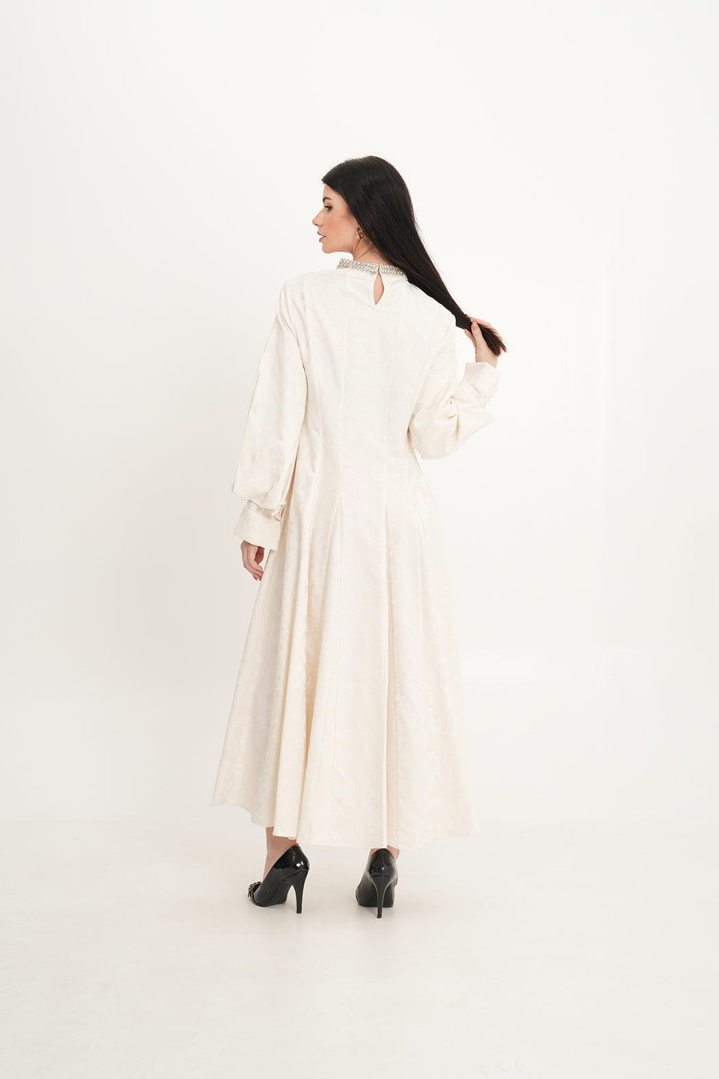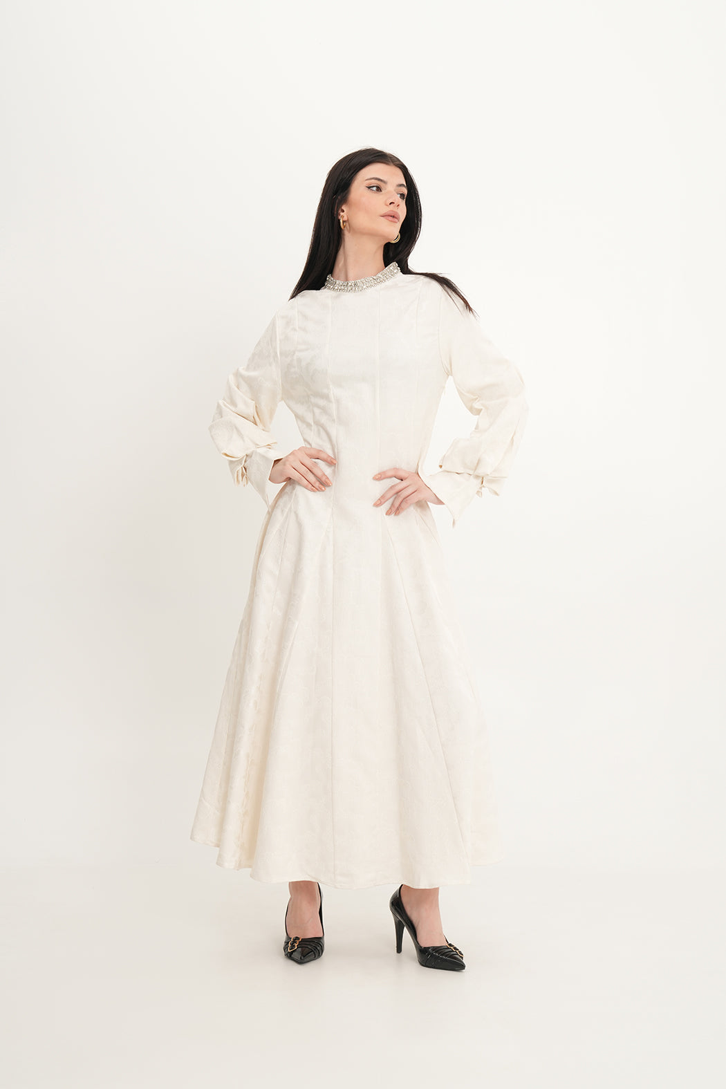 يلتقي الفخامة بالتفصيل في هذا الفستان الأنيق المصنوع من قماش الجاكار الفاخر، والمصمم خصيصًا للمناسبات الراقية. يتميز بقصة A واسعة تنسدل بانسيابية بطول تقريبي 135 سم، مع نقشات بارزة تضيف عمقًا ولمعانًا ناعمًا. أما الرقبة العالية فهي مزينة بتفاصيل براقة تضفي لمسة فاخرة. الأكمام الطويلة والمنفوخة مع الأساور الهيكلية تضيف طابعًا ملكيًا عصريًا لتصميم خالد.