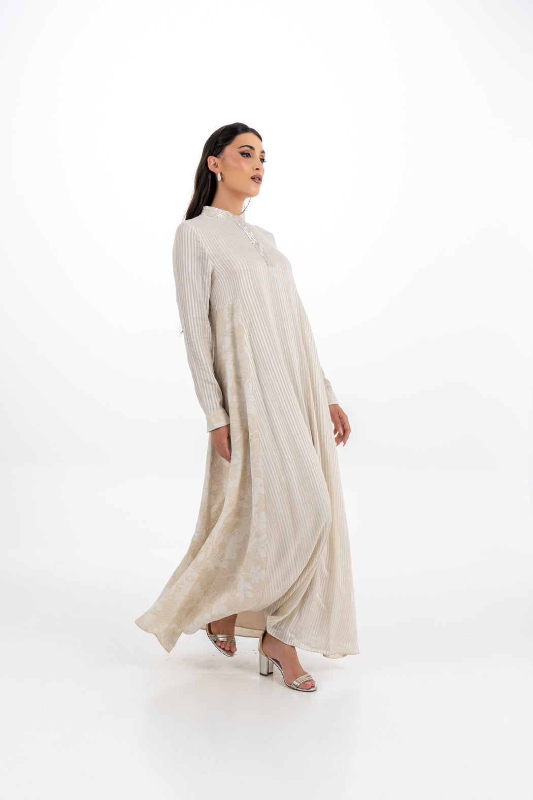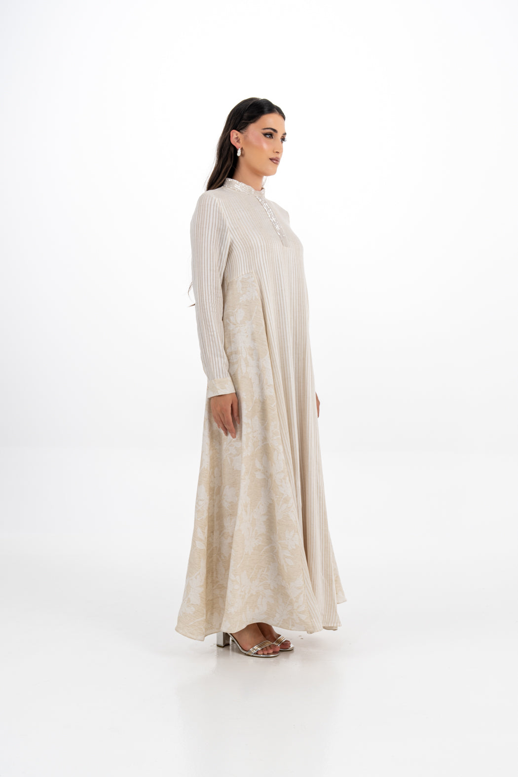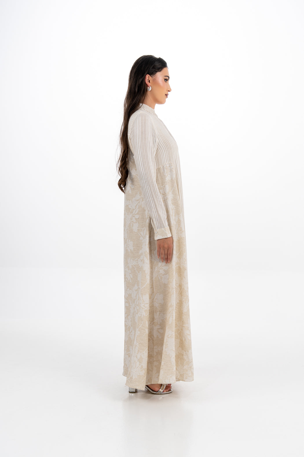 تألقي بأناقة كلاسيكية مع هذا الفستان الماكسي المصمم بعناية، والذي يجمع بين الخطوط الطولية الرقيقة في الأمام ونقشة الزهور الهادئة في الجوانب والخلف. مصنوع من مزيج القطن والفيسكوز الناعم، وينساب بسلاسة ليمنحك مظهراً أنثوياً ومريحاً. تضيف ياقة الماندرين المزينة بالترتر لمسة من الرقي، مما يجعل هذا الفستان مثالياً للمناسبات غير الرسمية أو اللقاءات الخاصة. قصّته الواسعة تناسب مختلف أشكال الجسم وتمنحك شعوراً بالراحة طوال اليوم.