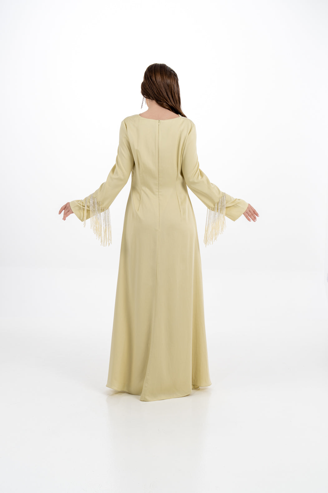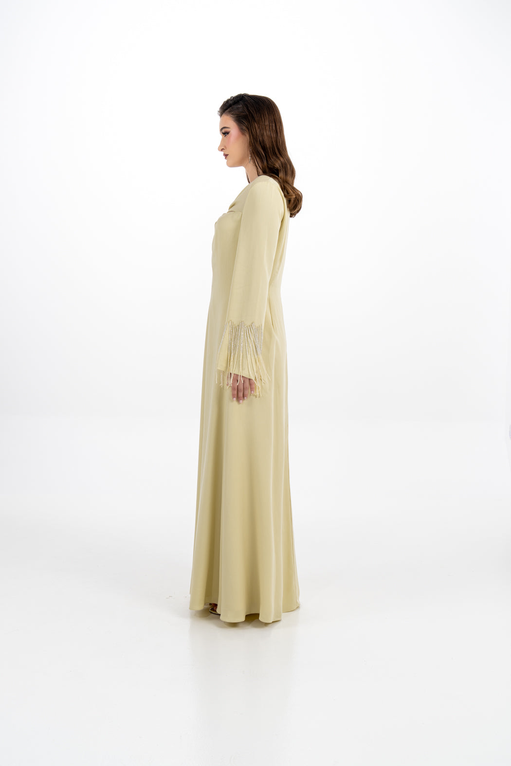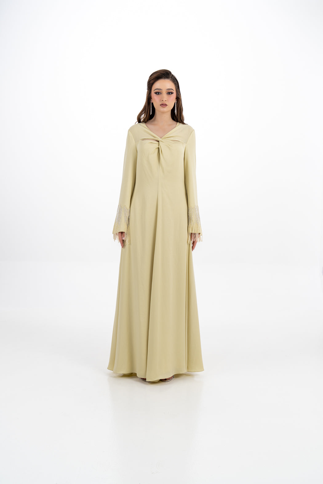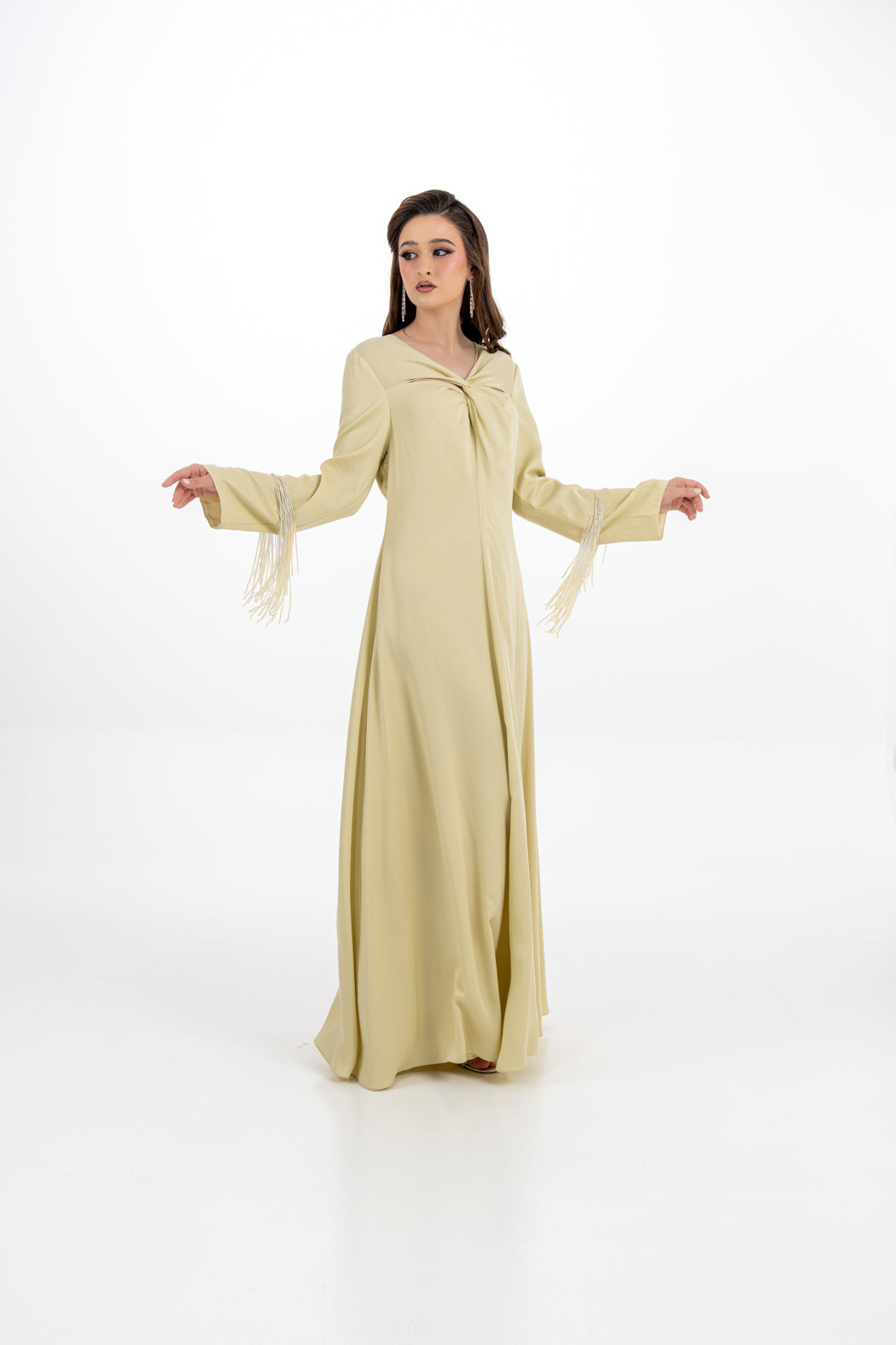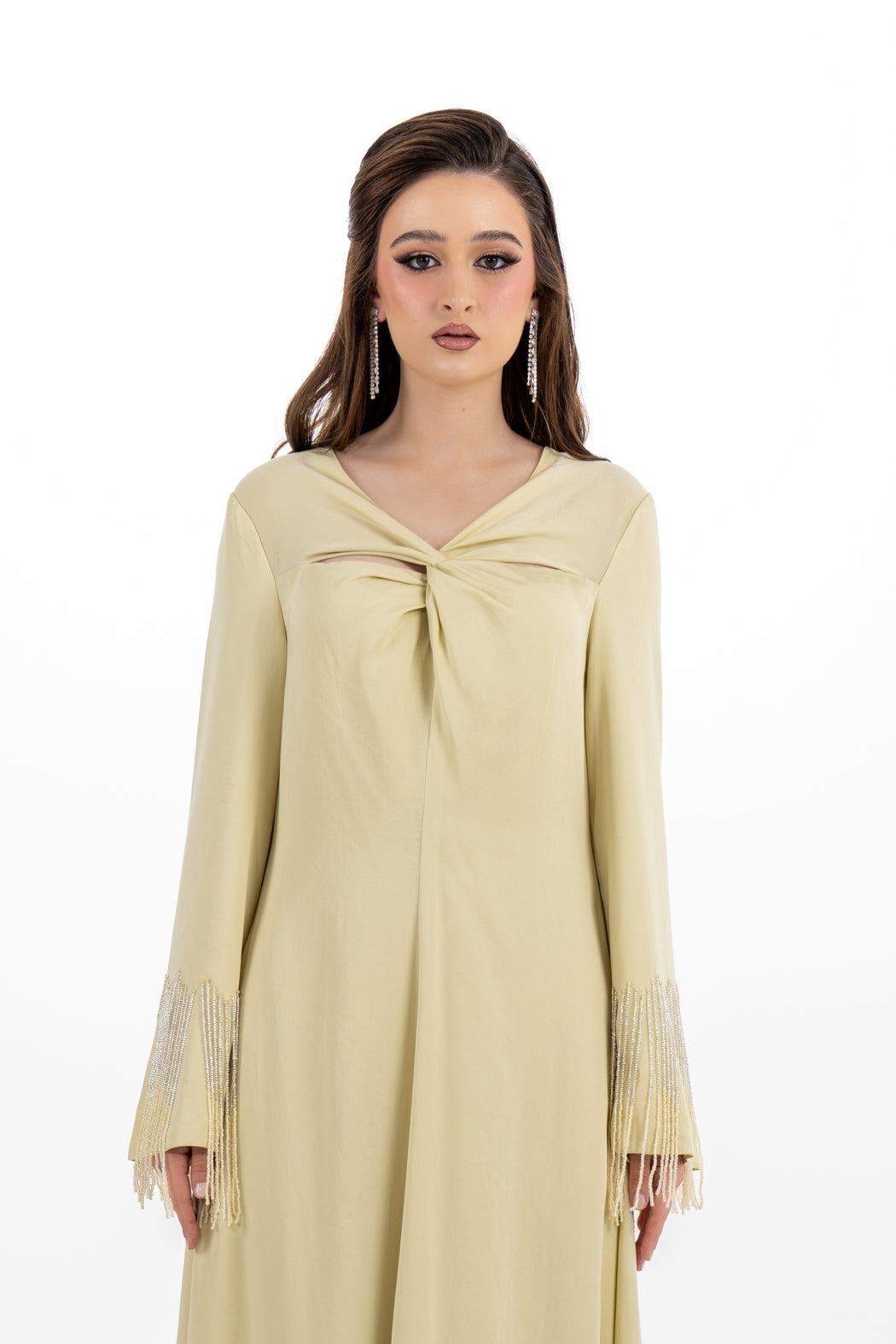 التصميم: فتحة ملتفة مع تفصيلة مفتوحة ناعمة عند الصدر، أكمام طويلة مزينة بشراريب من الأحجار