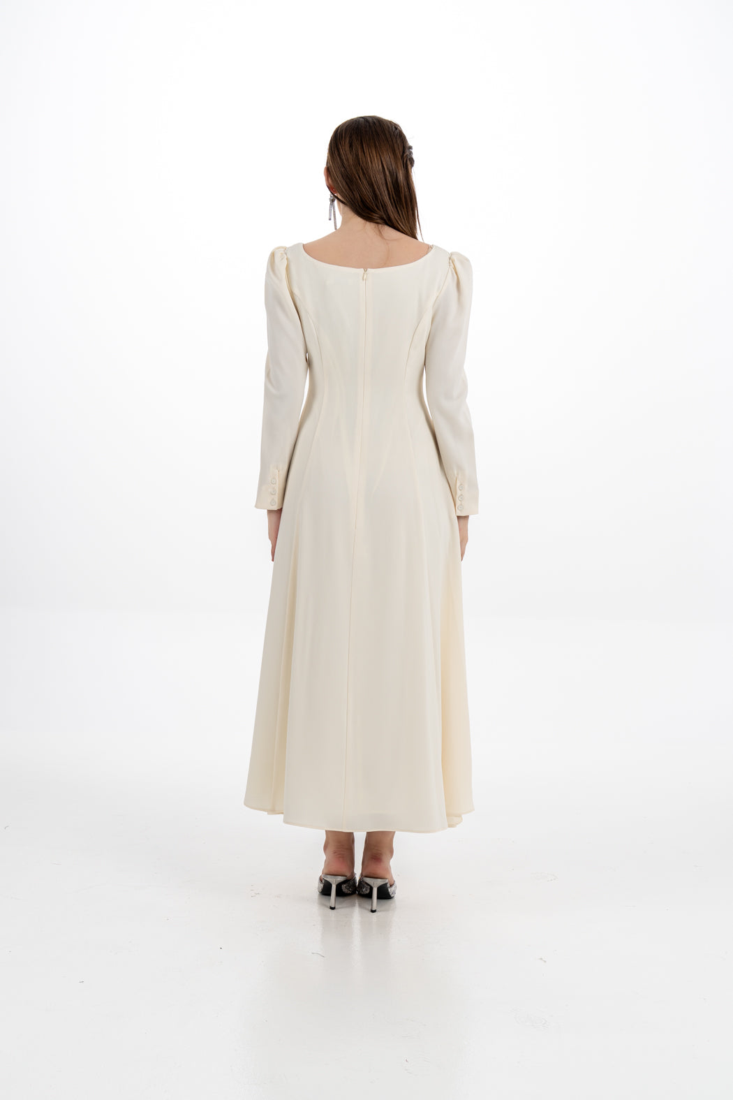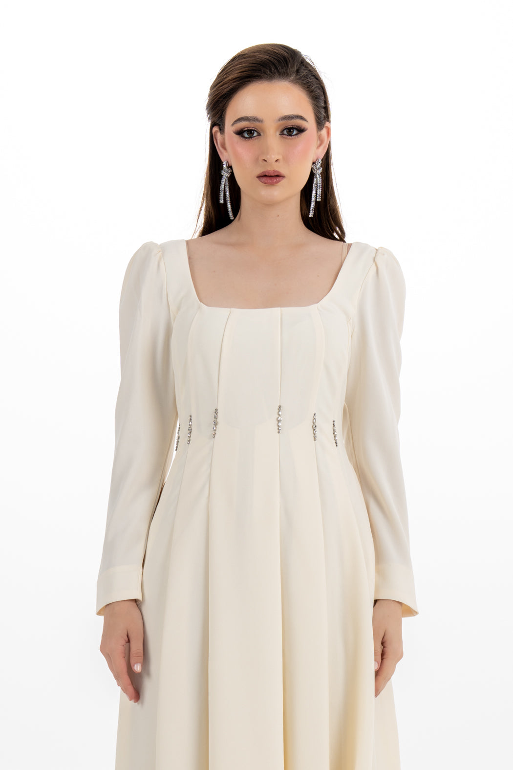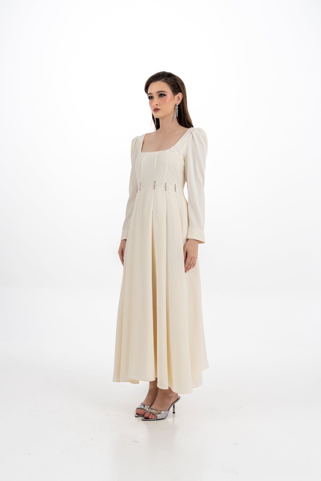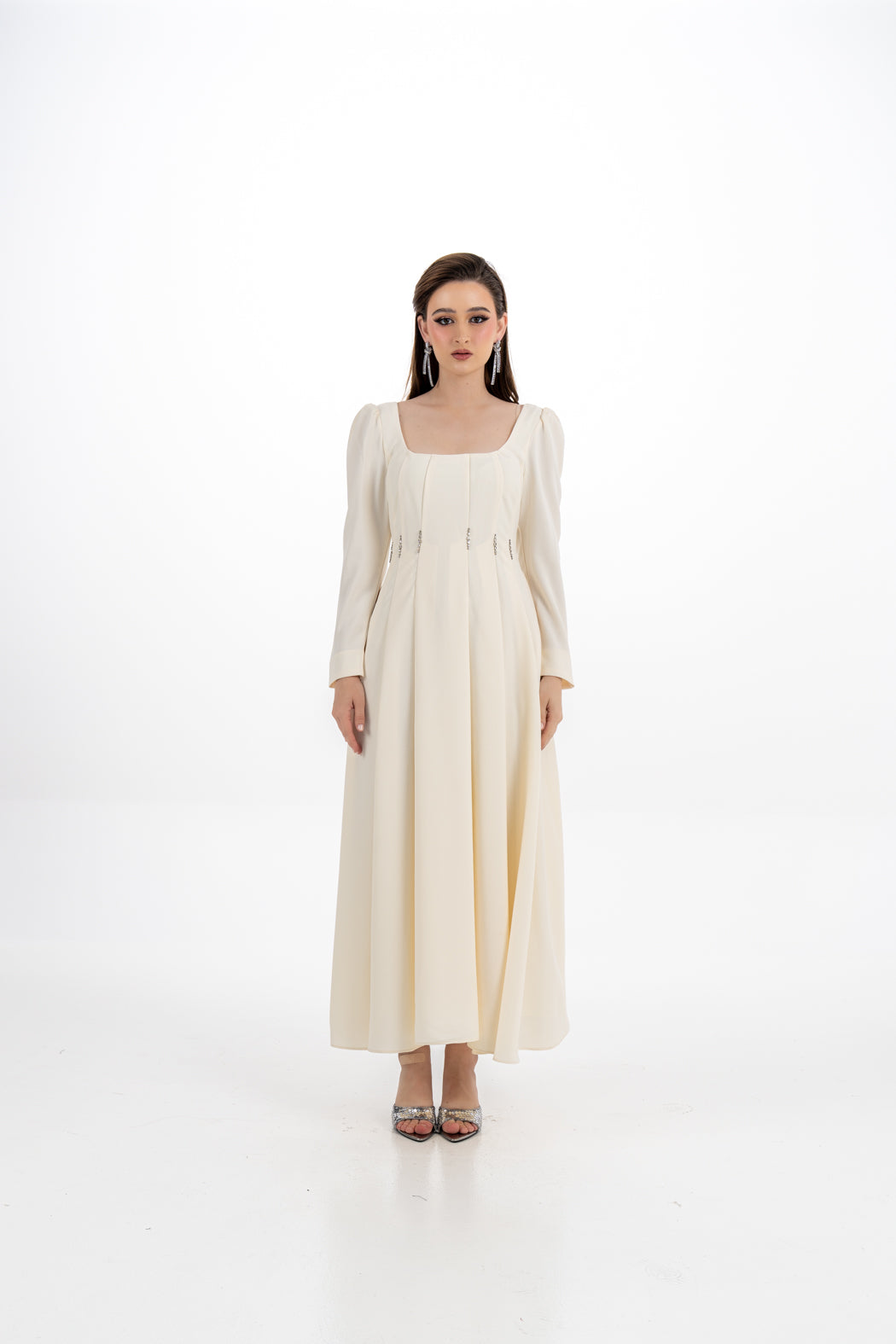 فستان ماكسي أنيق يجمع بين الرقي والبساطة، مثالي للمناسبات الخاصة. يتميز بياقة مربعة جذابة وطيات ناعمة تنسدل من الخصر لتمنحك إطلالة أنثوية راقية. يضفي التطريز البراق على الطيات لمسة من الفخامة، بينما تضيف الأكمام الطويلة بأزرار على الأساور لمسة كلاسيكية أنيقة. بقَصّة انسيابية بطول حوالي 136 سم، يمنحك الفستان حضورًا راقيًا ومميزًا.