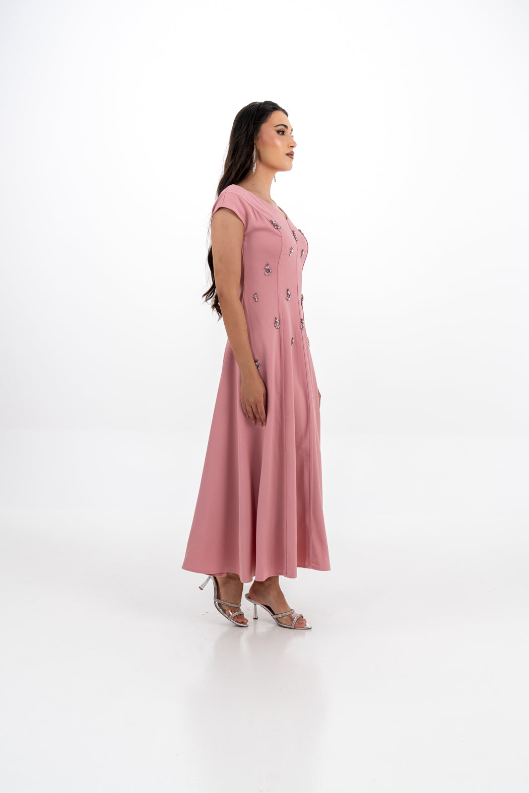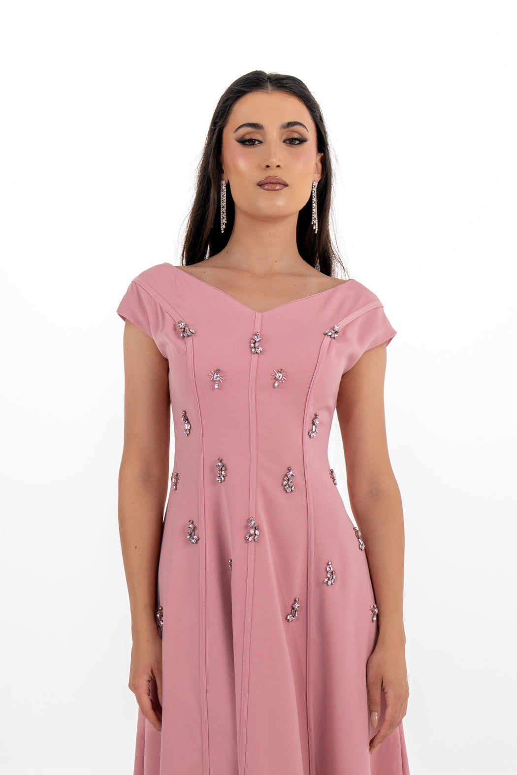 تألقي بإطلالة فاخرة مع هذا الفستان الطويل المصمم بقصة A المميزة، والمصنوع بدقة من قماش كريب مطاطي عالي الجودة يمنحك مزيجًا من الأناقة والراحة. يتميز بياقة أنيقة مكشوفة من الكتفين تُبرز جمال العنق والكتفين، مع أكمام قصيرة ناعمة لإطلالة أنثوية راقية. زُيّن الجزء الأمامي بتطريزات متلألئة من الكريستال والخرز تضفي لمسة فاخرة. ينحت القَصّ الأمامي الجسم بنعومة قبل أن ينسدل بتنورة واسعة تنساب بانسيابية مع كل خطوة.