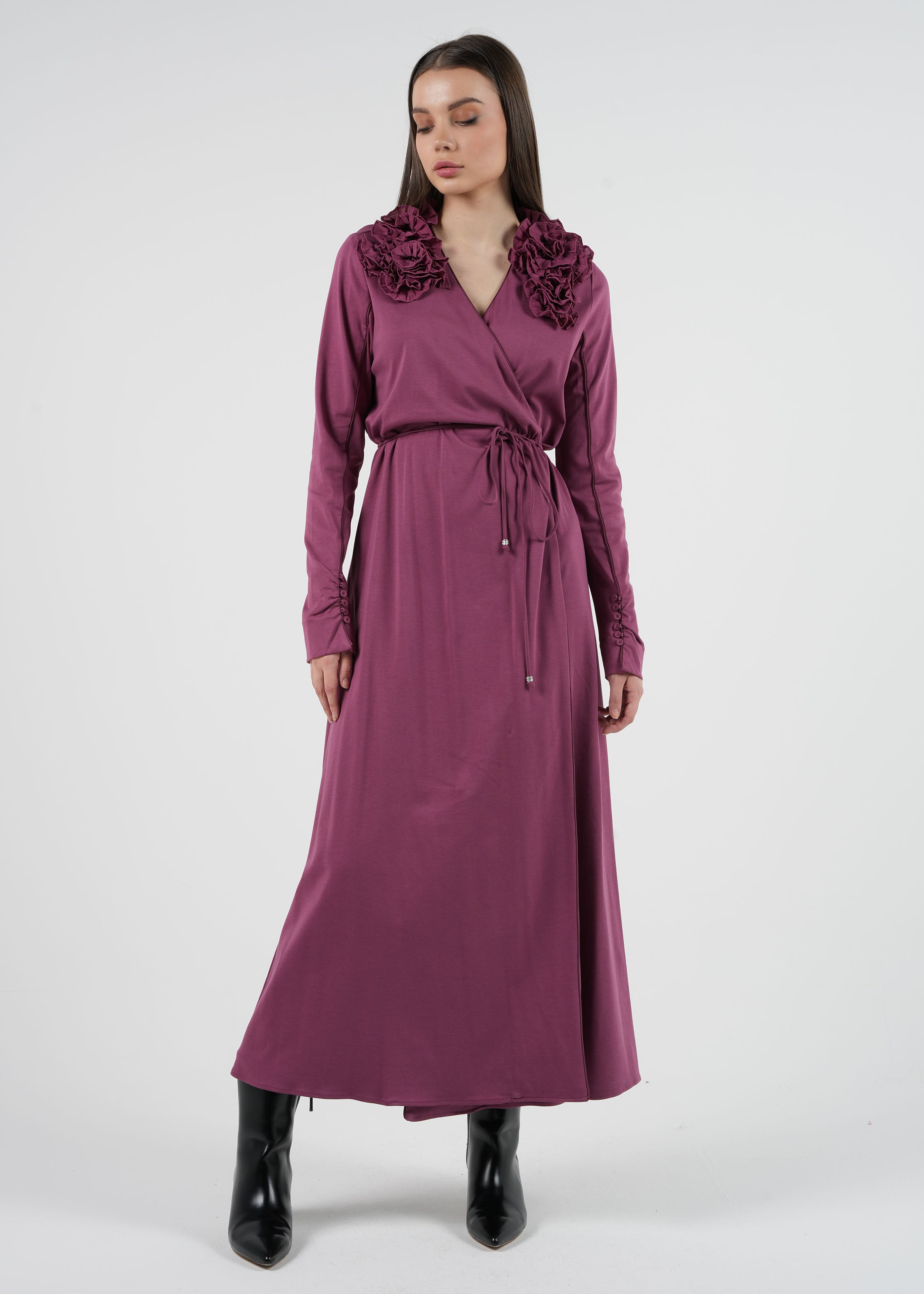 ارتقي بإطلالتك مع فستان ماكسي بتصميم ملفوف وزهور بارزة، الذي يجمع بين الأناقة والرقي. يتميز بقصة ملفوفة على الخصر بحزام رقيق لتحديد الشكل بشكل مثالي. تضيف الزهور البارزة المصممة بدقة على الأكتاف لمسة أنثوية ساحرة. وتكتمل الأناقة بالأكمام الطويلة مع تفاصيل أزرار أنيقة، مما يجعله الخيار المثالي للمناسبات الخاصة والتجمعات الفاخرة.