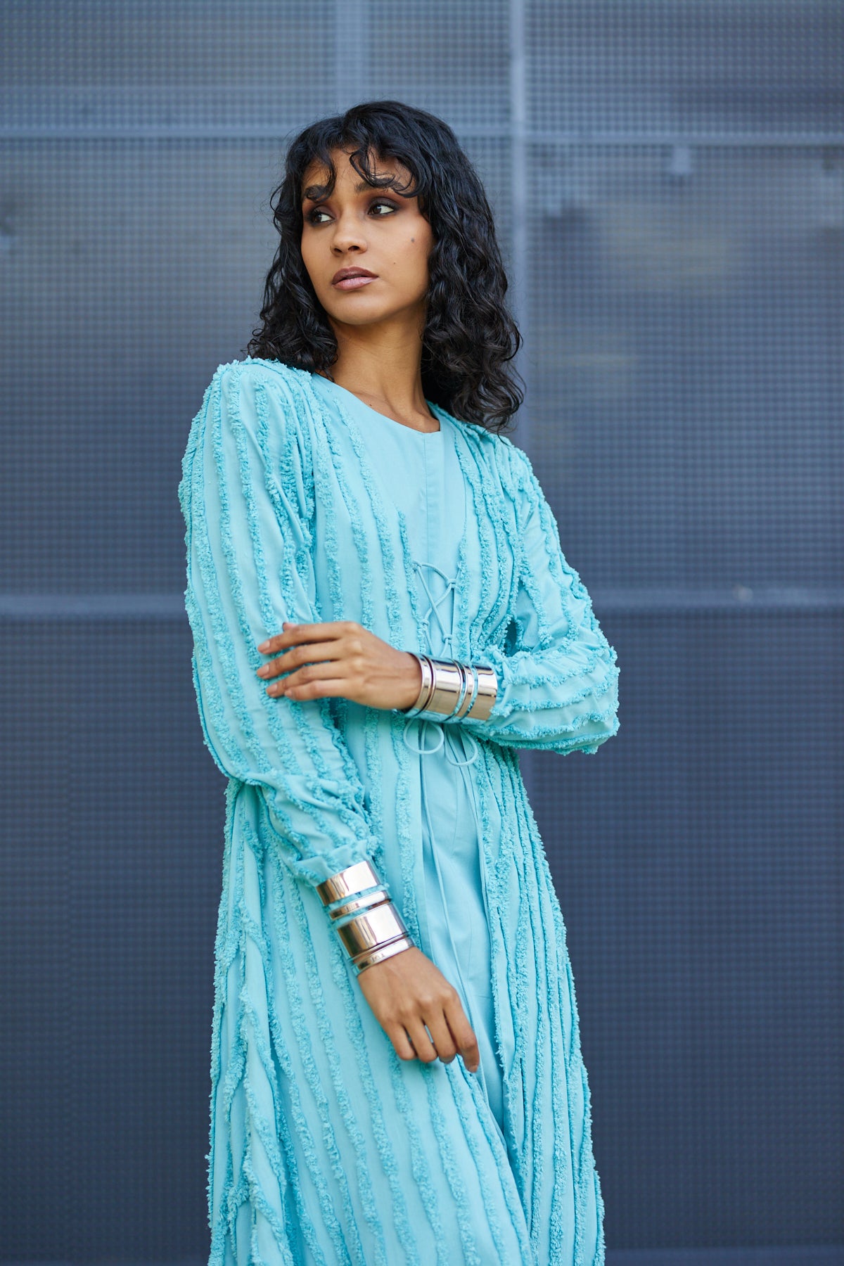 • الطبقة الخارجية: مزيج من الكريب الفاخر بنقوش بارزة لإطلالة أنيقة