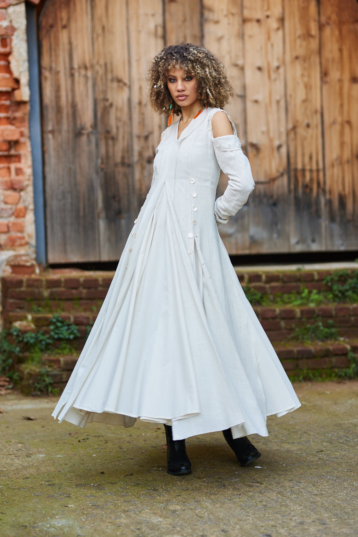 تألقي بإطلالة مميزة مع هذا الفستان الماكسي الواسع الفاخر، بتصميم حصري من أبرار المبارك. يتميز هذا الفستان بإغلاق بالأزرار على الكتف، مما يضفي لمسة عصرية فريدة على الأناقة الكلاسيكية. ينساب التصميم الهيكلي من الجزء العلوي إلى تنورة واسعة متدفقة، مما يمنحك إطلالة جذابة ومفعمة بالحركة. تضيف التطريزات المتباينة وتفاصيل الأزرار لمسات راقية، بينما يمنحك تصميم الأكمام الباردة لمسة جريئة وعصرية.