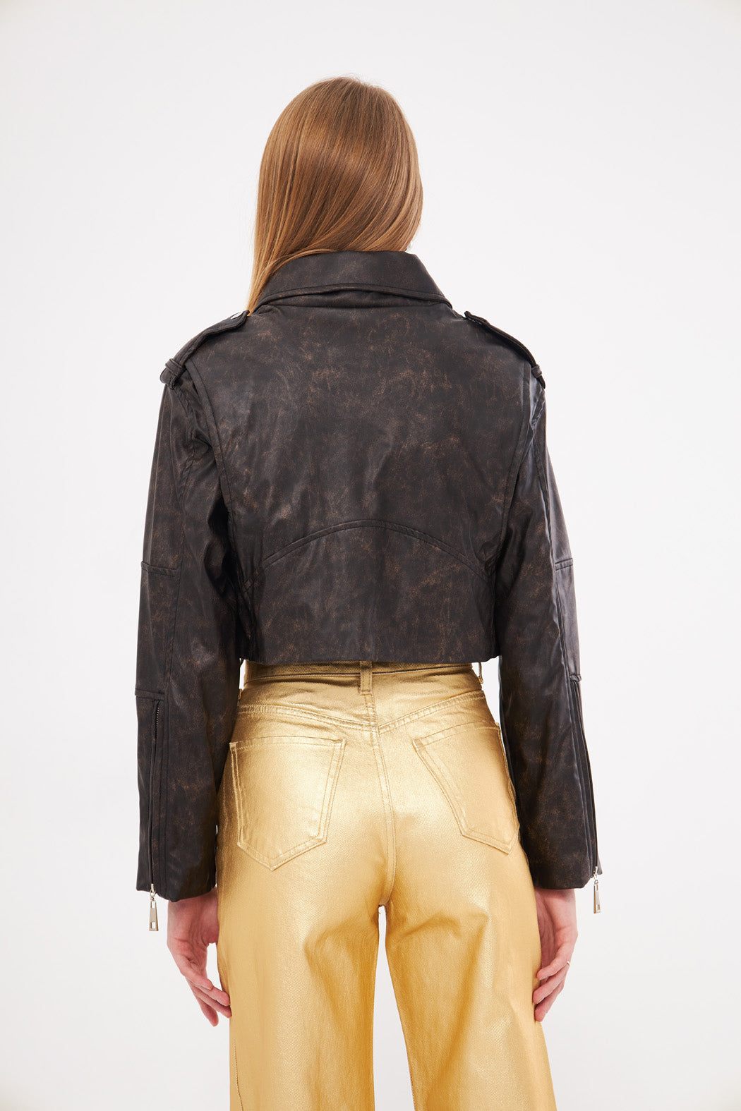 سترة جلدية مقصوصة متداخلة بسحاب متباين هي قطعة جريئة وعصرية تضفي لمسة عصرية على أي إطلالة. تتميز هذه السترة بتصميم أمامي متداخل فريد وقصة مقصوصة، وتجمع بين الأناقة والبنية. تضيف تفاصيل السحاب المتباينة لمسة غير متوقعة من اللون، مما يجعلها قطعة مميزة مثالية للارتداء فوق الملابس الكاجوال أو الرسمية.