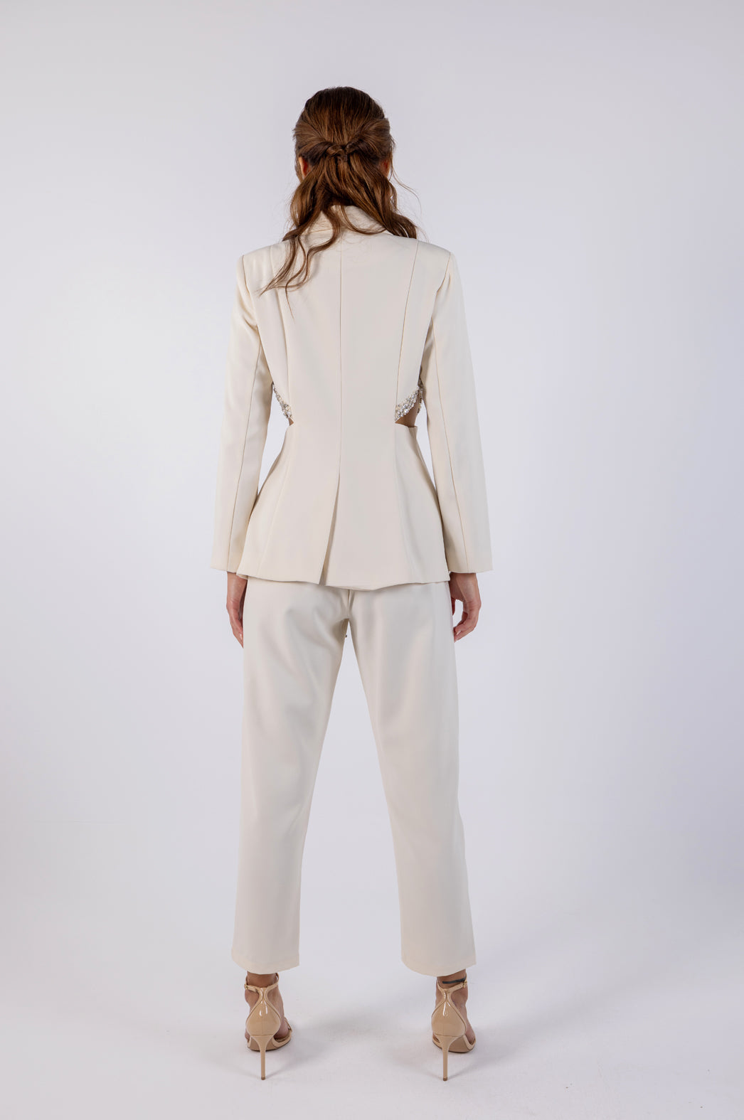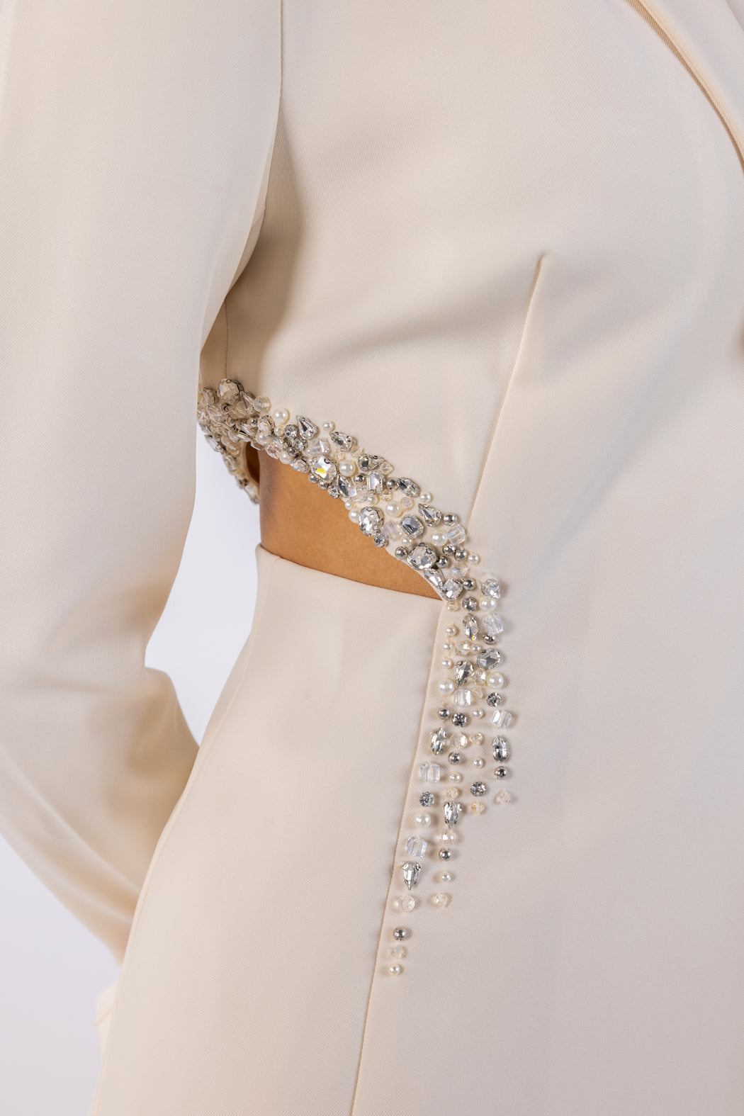 ارتقِ بخزانة ملابسك مع هذه السترة الأنيقة، المصممة لتترك انطباعًا مميزًا. تتميز القطعة بزخارف رائعة موضوعة يدويًا على طول اللحامات الجانبية، مما يضيف لمسة فاخرة إلى شكلها الهيكلي. بفضل قصتها المفصلة وطية صدرها البسيطة، توفر مظهرًا أنيقًا لا يتأثر بمرور الزمن، ومثاليًا للمناسبات الرسمية والتجمعات الراقية.