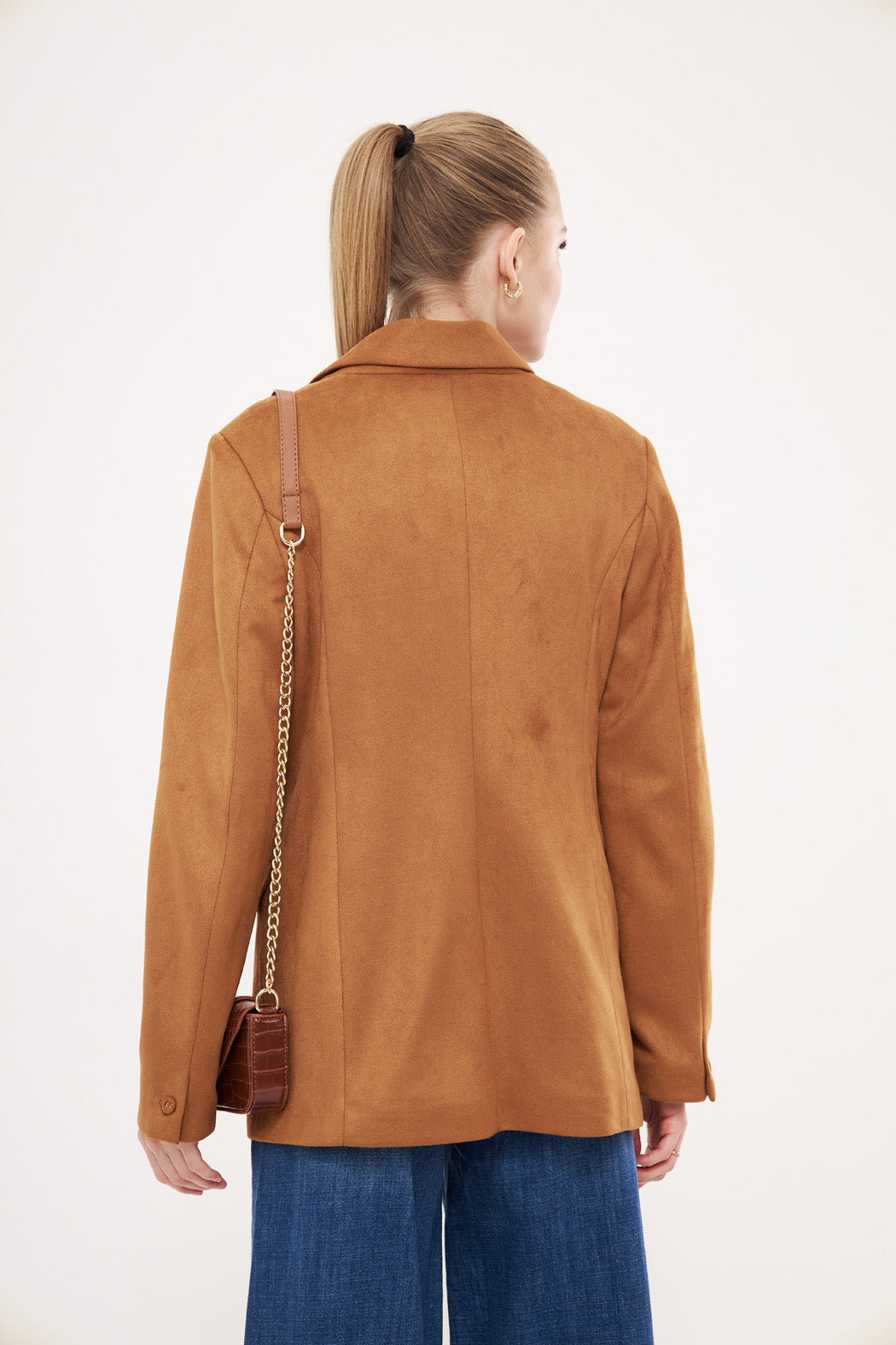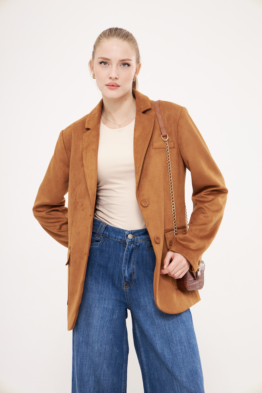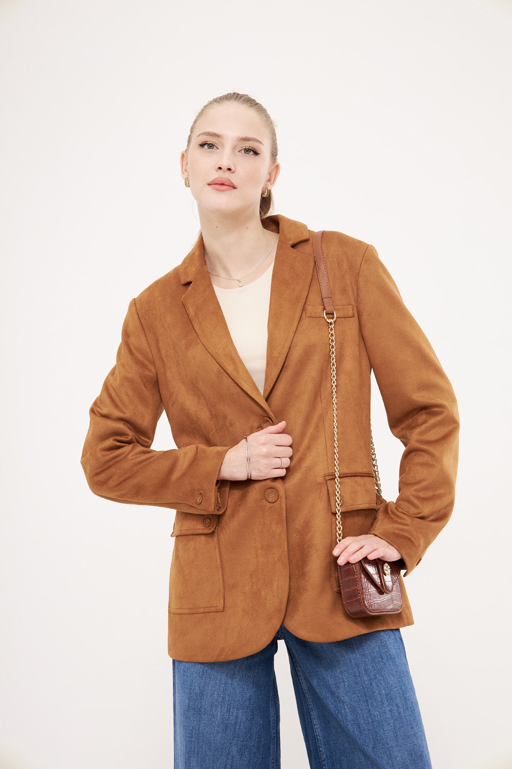 استمتعي بالرقي مع هذه السترة المصنوعة من جلد السويد باللون البني الفاتح، والتي تتميز بطية صدر كلاسيكية مدببة لإطلالة لا تتأثر بمرور الزمن. صُنعت هذه السترة من جلد السويد الناعم، وتوفر إحساسًا بالفخامة مع ملاءمة منظمة، وهي مثالية لرفع مستوى الملابس الكاجوال والرسمية. يمكنك ارتداؤها مع بنطلون أو جينز لإطلالة أنيقة ومتعددة الاستخدامات.