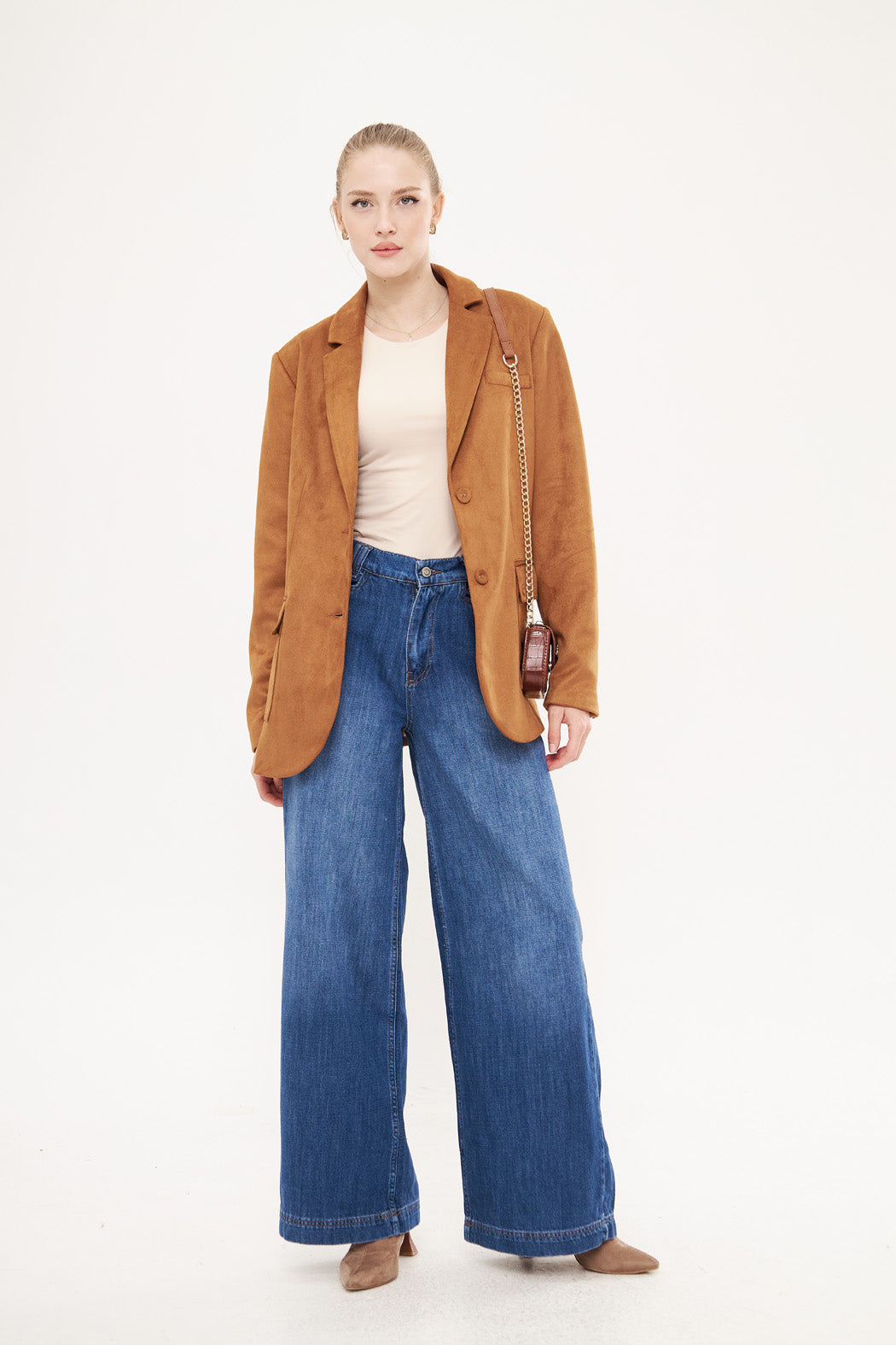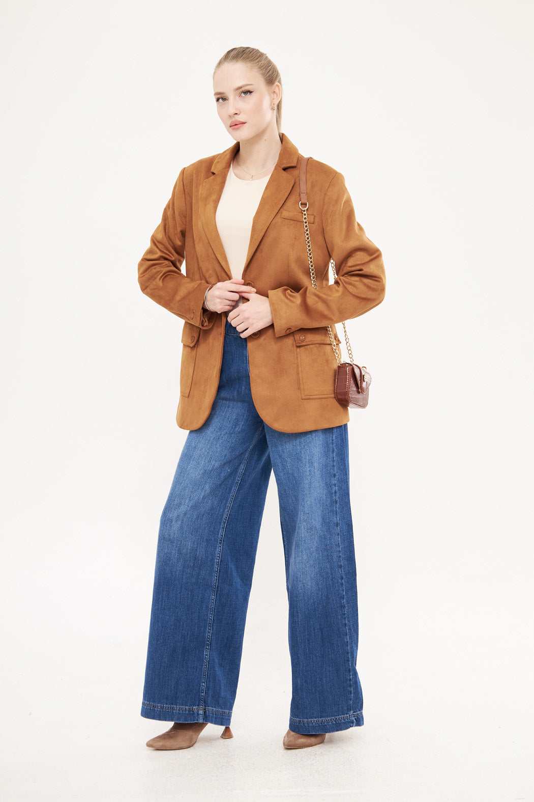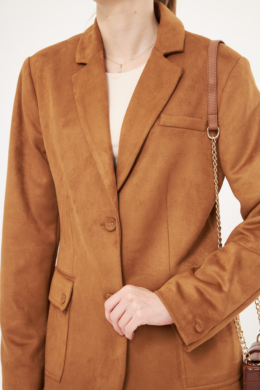استمتعي بالرقي مع هذه السترة المصنوعة من جلد السويد باللون البني الفاتح، والتي تتميز بطية صدر كلاسيكية مدببة لإطلالة لا تتأثر بمرور الزمن. صُنعت هذه السترة من جلد السويد الناعم، وتوفر إحساسًا بالفخامة مع ملاءمة منظمة، وهي مثالية لرفع مستوى الملابس الكاجوال والرسمية. يمكنك ارتداؤها مع بنطلون أو جينز لإطلالة أنيقة ومتعددة الاستخدامات.