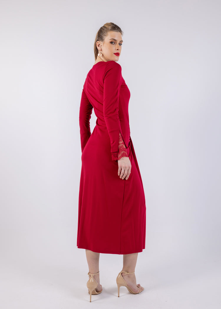 فستان ميدي أنيق سادة يتميز بجزء أمامي منسدل أنيق وأساور دانتيل رقيقة على أكمام طويلة. مثالي لإطلالة راقية لا تتأثر بمرور الزمن، يمكن تنسيق هذا الفستان بسهولة مع أحذية الكاحل لإطلالة أنيقة من النهار إلى الليل.