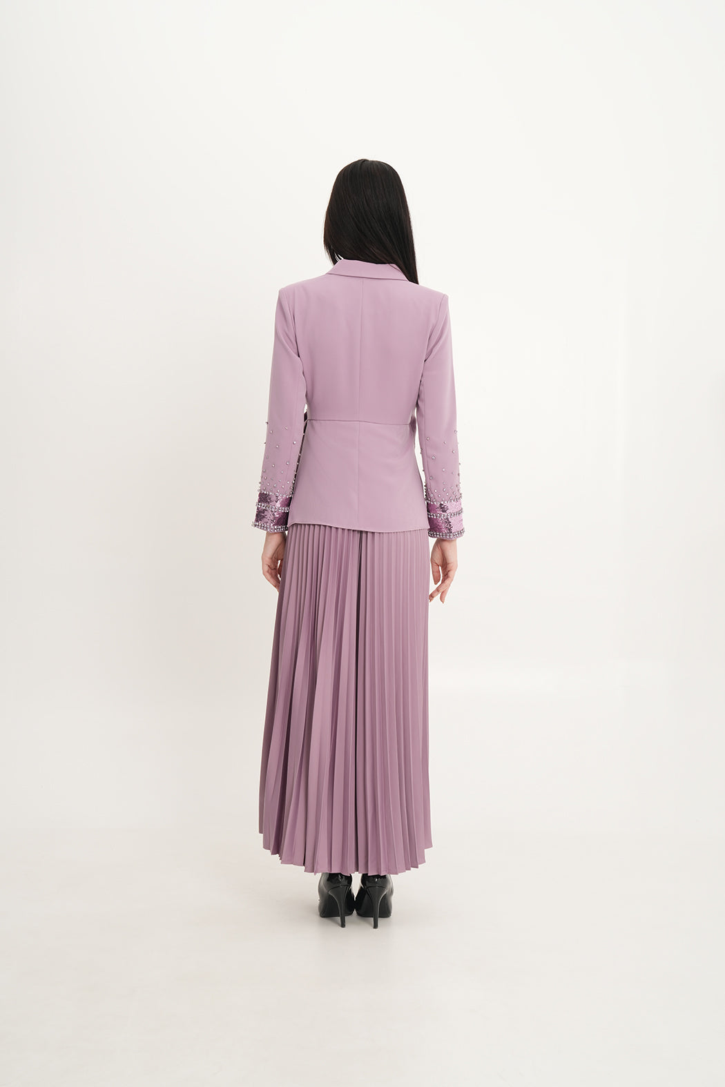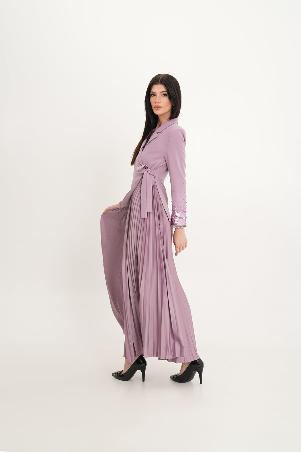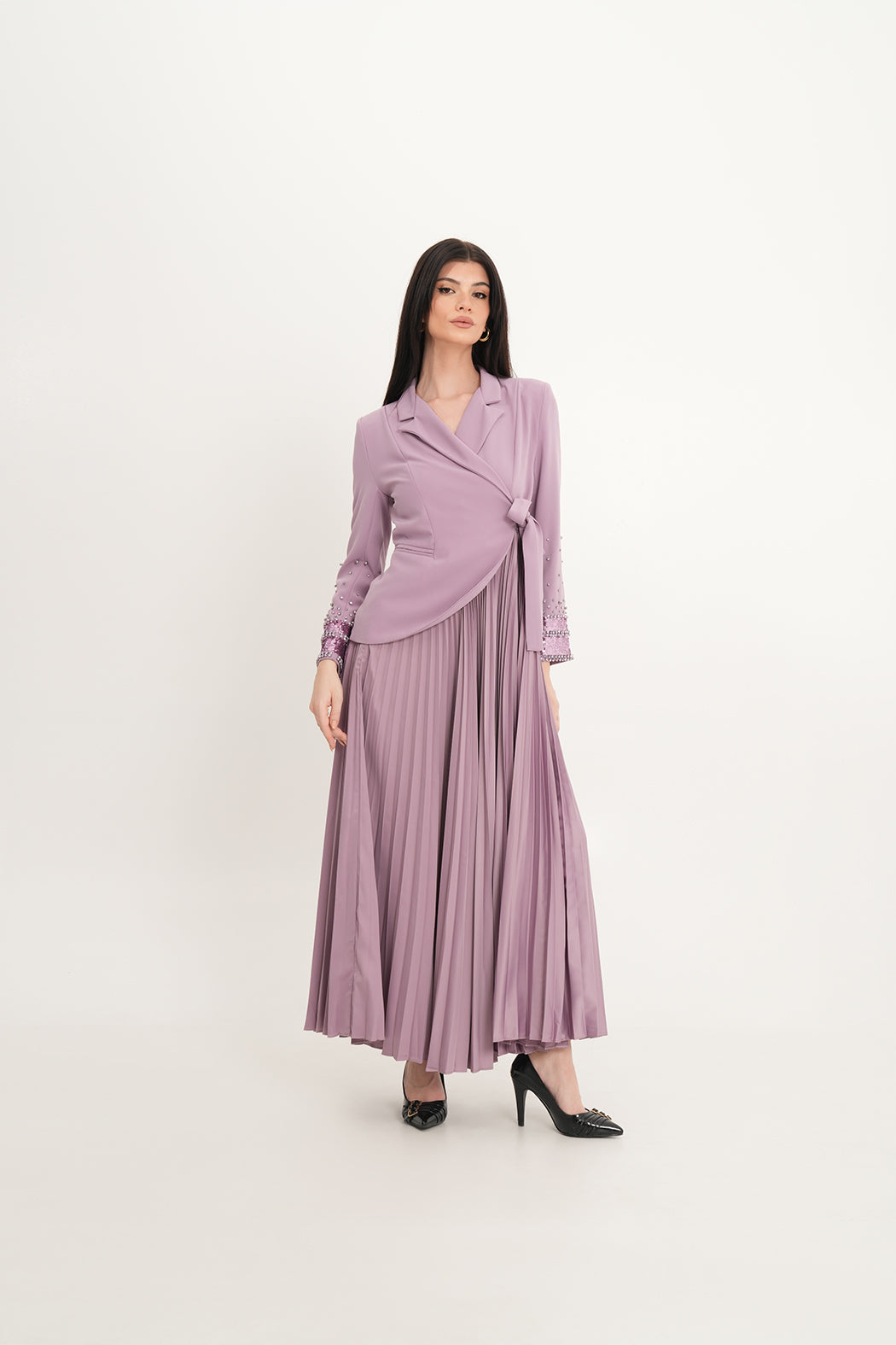 فستان أنيق يجمع بين طابع البلايزر العصري وقصة الفساتين الراقية، يتميز بجزء علوي مصمم على هيئة بلايزر بربطة جانبية أنيقة، ينسدل بسلاسة إلى تنورة بليسيه طويلة تمنح إطلالة أنثوية راقية. الأكمام مزينة بتطريز فاخر من اللؤلؤ والترتر، مما يجعله خيارًا مثاليًا للمناسبات الخاصة أو السهرات الراقية.