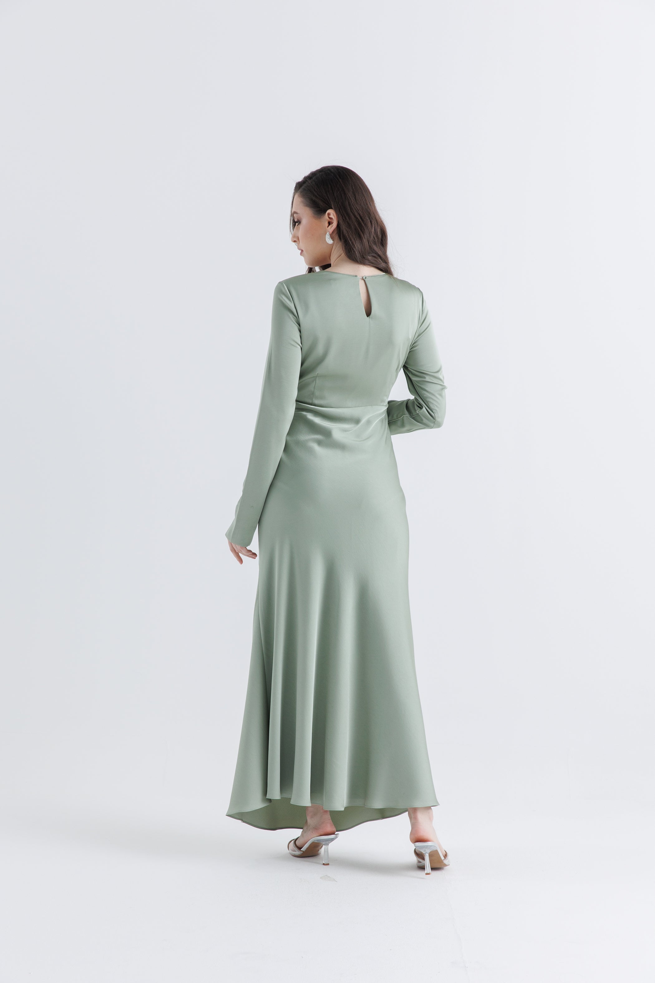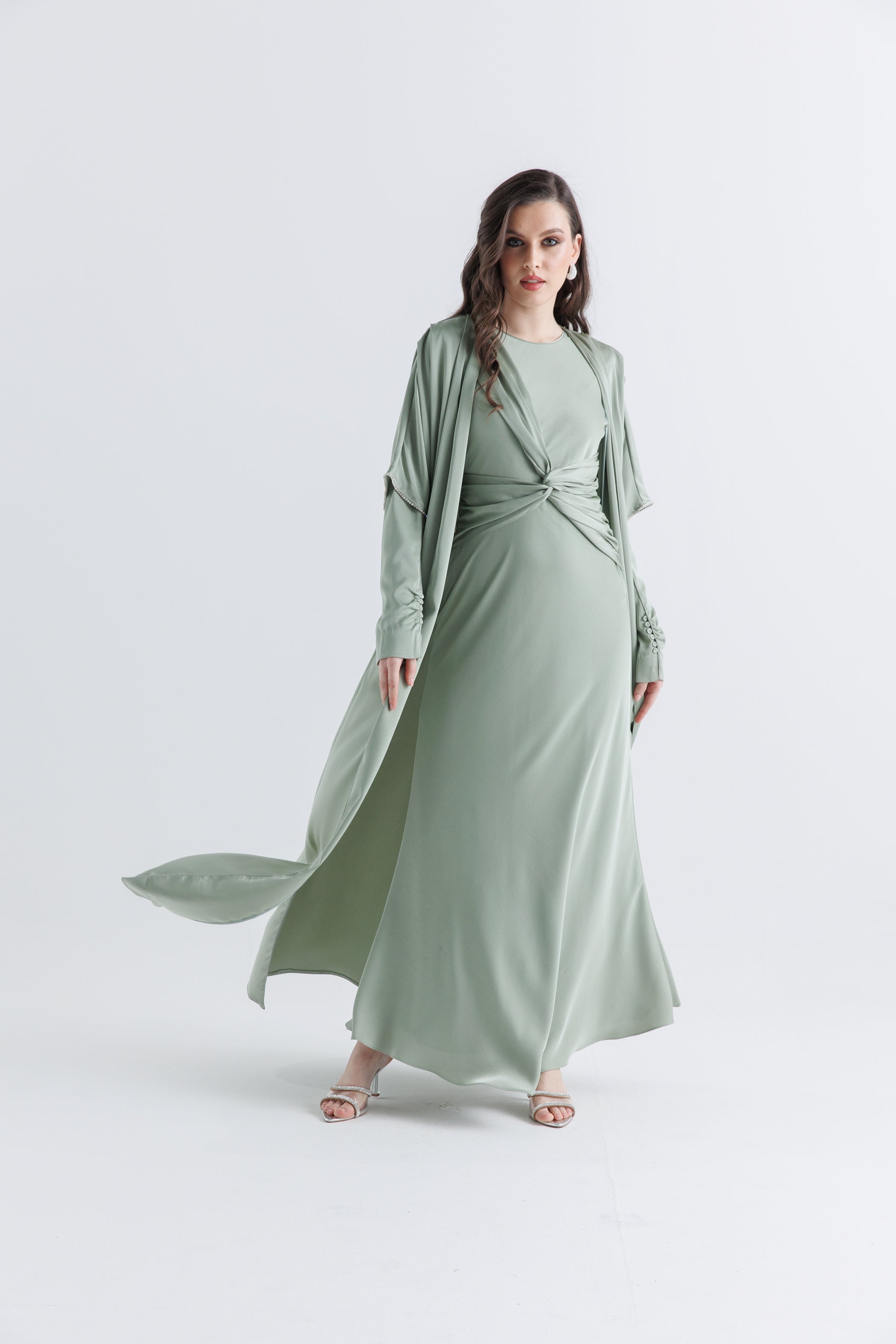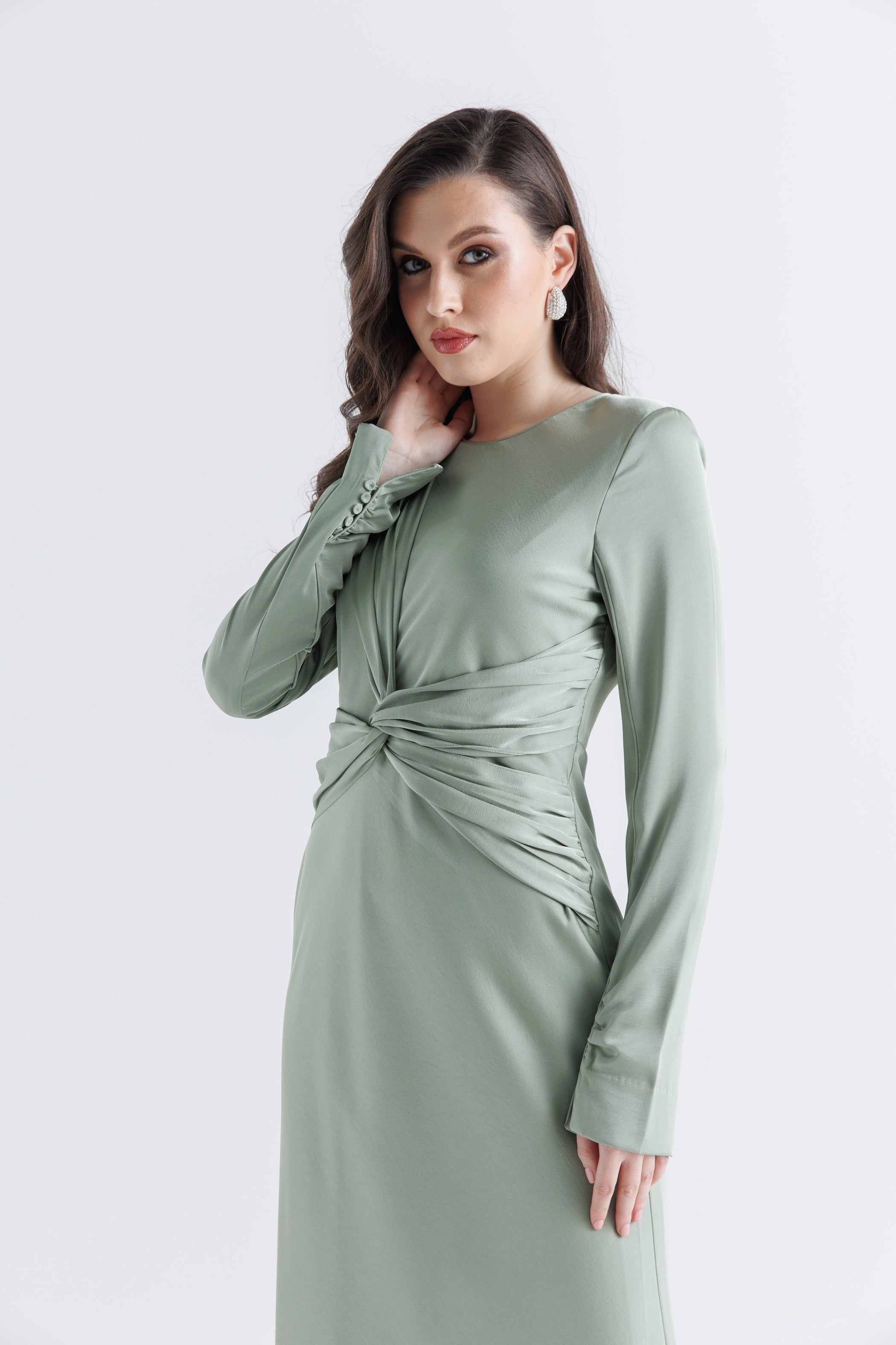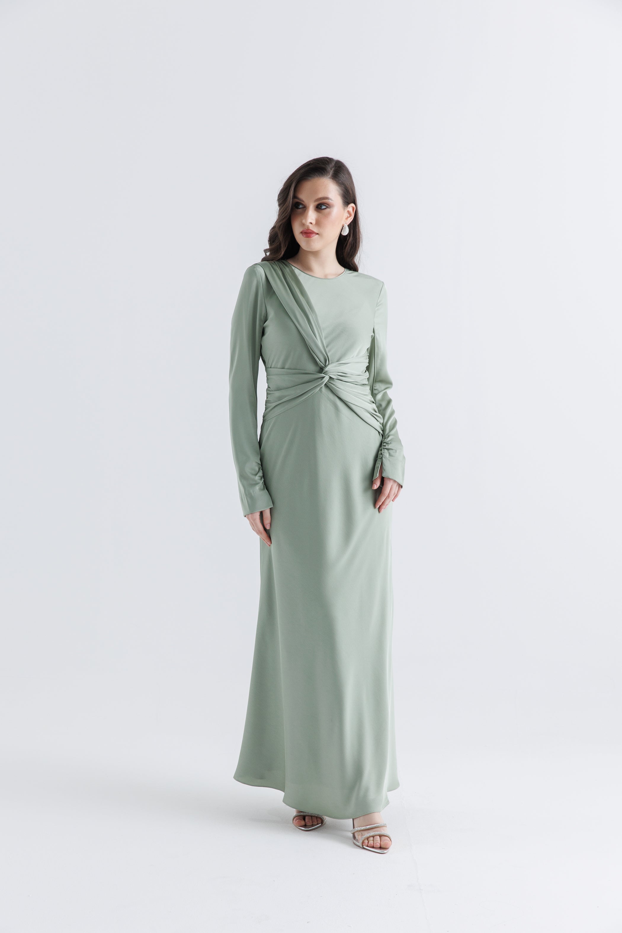 أناقة بسيطة بلمسة عصرية، يتميز هذا الفستان الماكسي بتفصيل درابي ملتف عند الخصر يُبرز القوام ويضفي إحساساً بالحركة والانسيابية. تأتي الأكمام الطويلة مزودة بأزرار على الأساور لإضفاء لمسة راقية، بينما تضيف الياقة المستديرة لمسة ناعمة ومحتشمة على الإطلالة. مصنوع من قماش خفيف وانسيابي، يُعد هذا الفستان خياراً مثالياً للمناسبات الرسمية وشبه الرسمية.