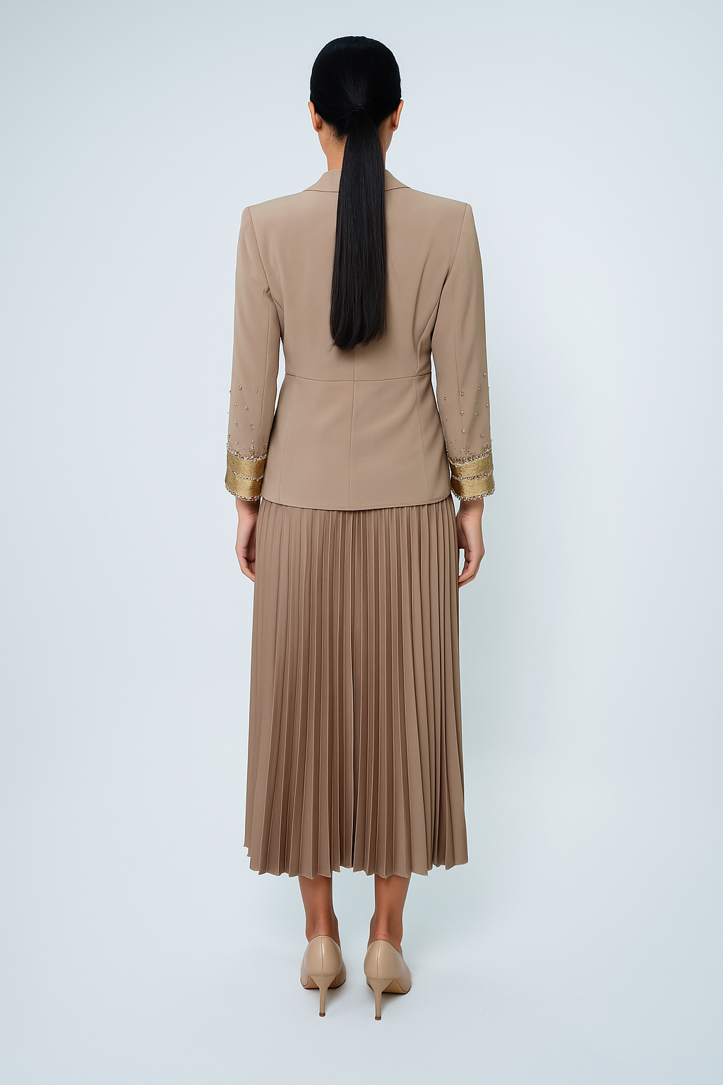 This elegant maxi dress is designed with a tailored blazer-inspired bodice, beautifully accented with a side tie for a feminine silhouette. The long sleeves feature dazzling stone and sequin embellishments at the cuffs, adding a glamorous sparkle. The pleated maxi skirt flows gracefully, offering movement and sophistication, perfect for evening occasions, weddings, or chic formal gatherings. With its refined tailoring and delicate details, this dress strikes the perfect balance between modesty and modern style.