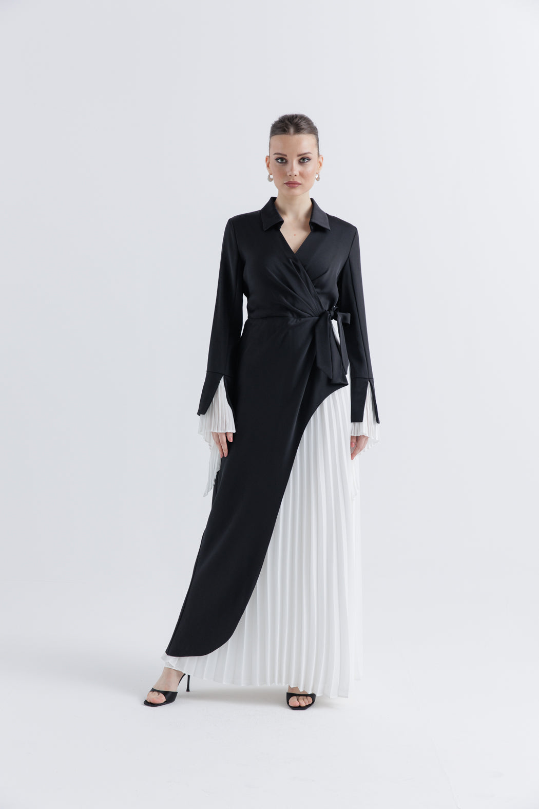 تألقي بأسلوب راقٍ مع فستان التفافة بكسرات الأناقة الأثيرية، وهو قطعة فاخرة مثالية لمجموعة العيد. يتميز هذا الفستان بتصميم التفافة غير المتماثل مع نسيج مكسر متباين يمنحك إطلالة أنثوية انسيابية ومميزة. تضيف أكمام مزينة بكسرات واسعة لمسة من الفخامة، بينما تمنحك التنورة المكسرّة حرية الحركة بأسلوب أنيق ومتألق.