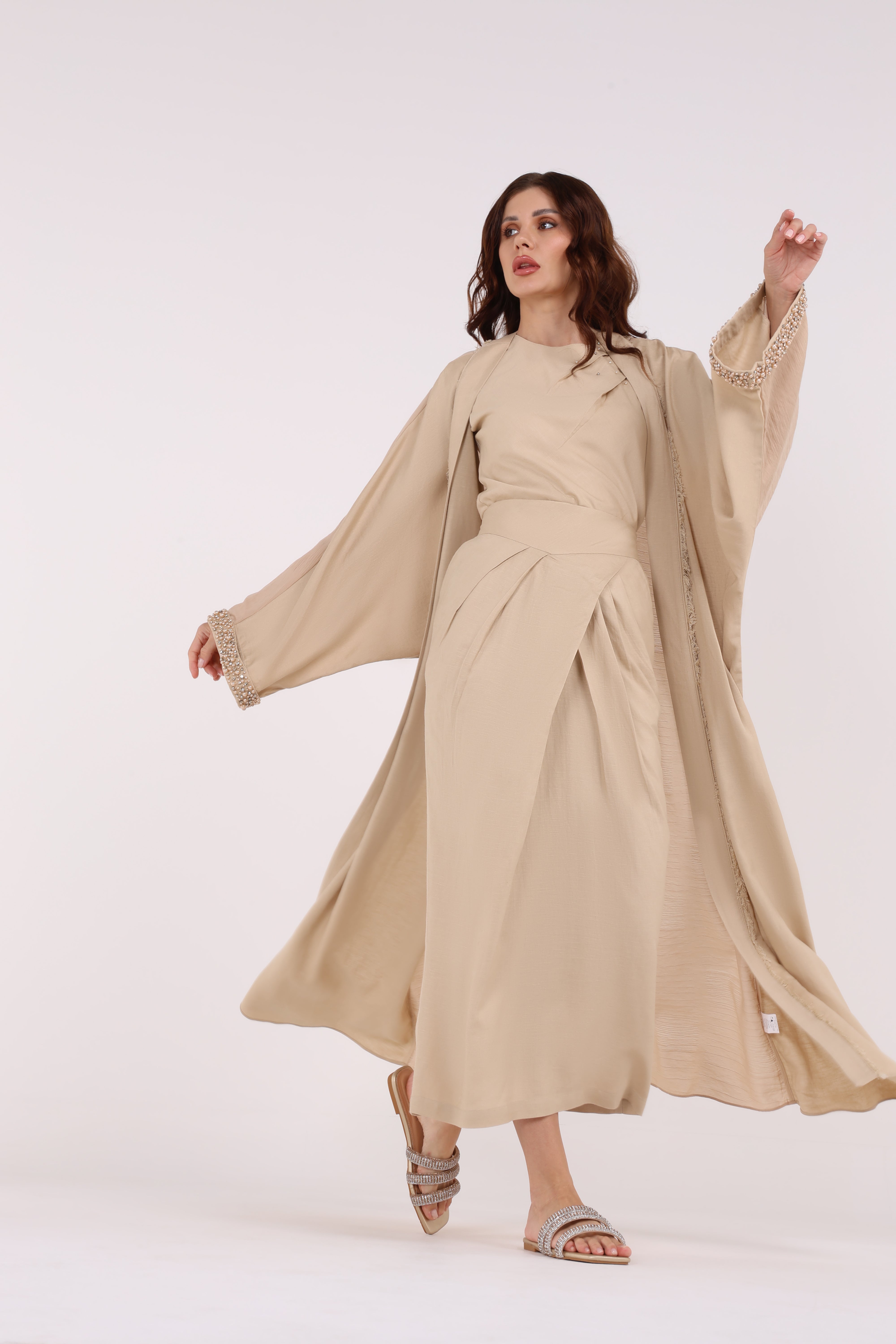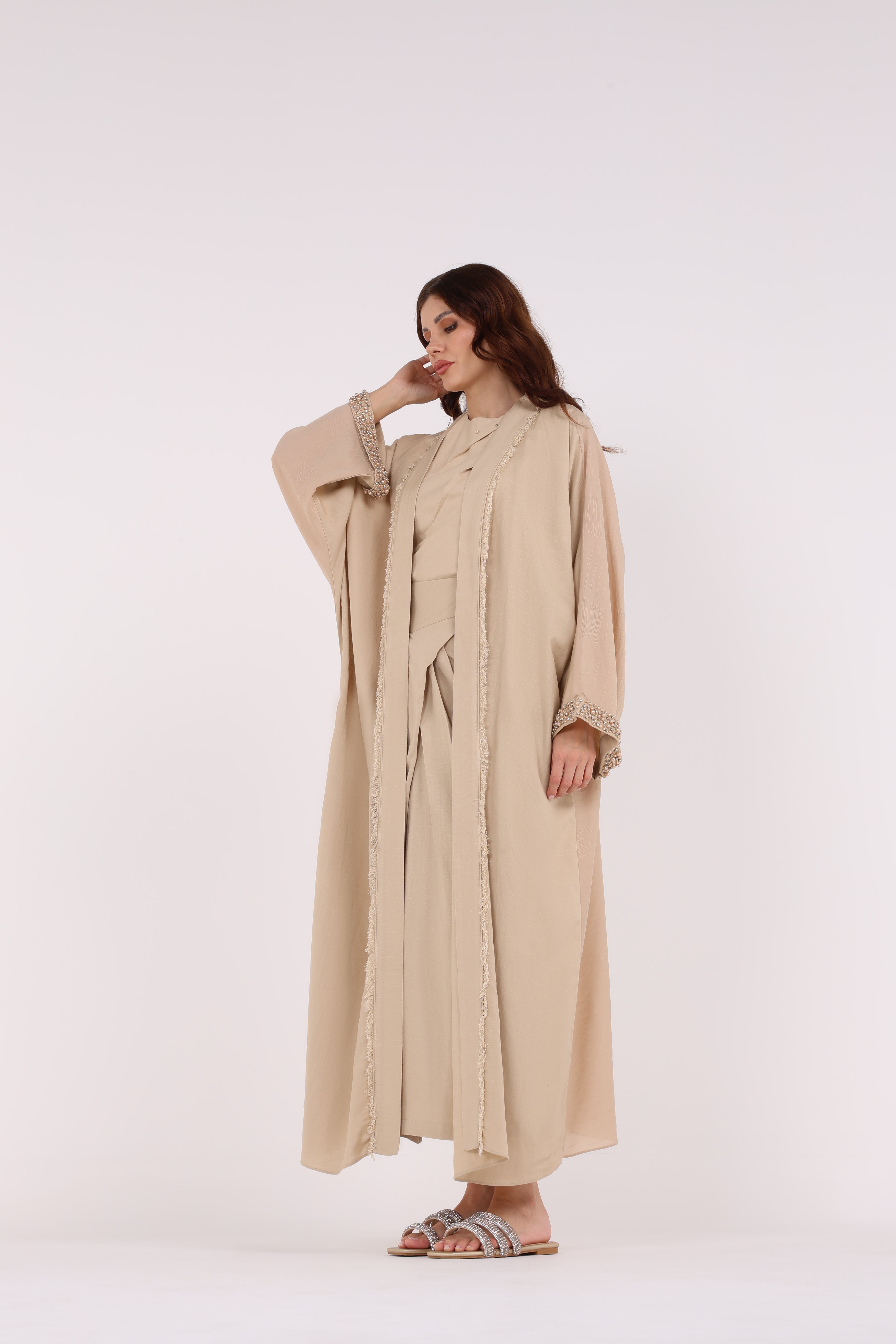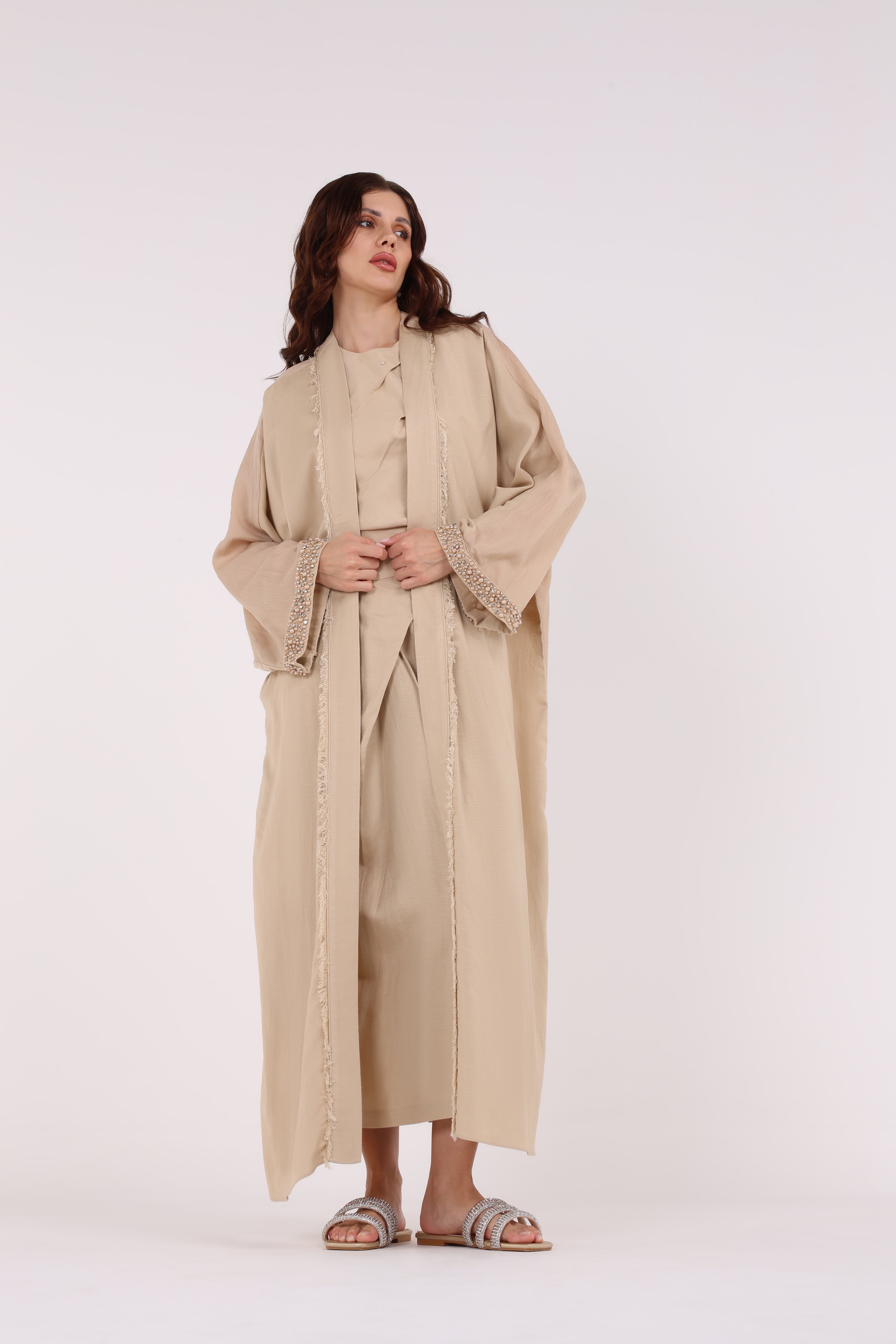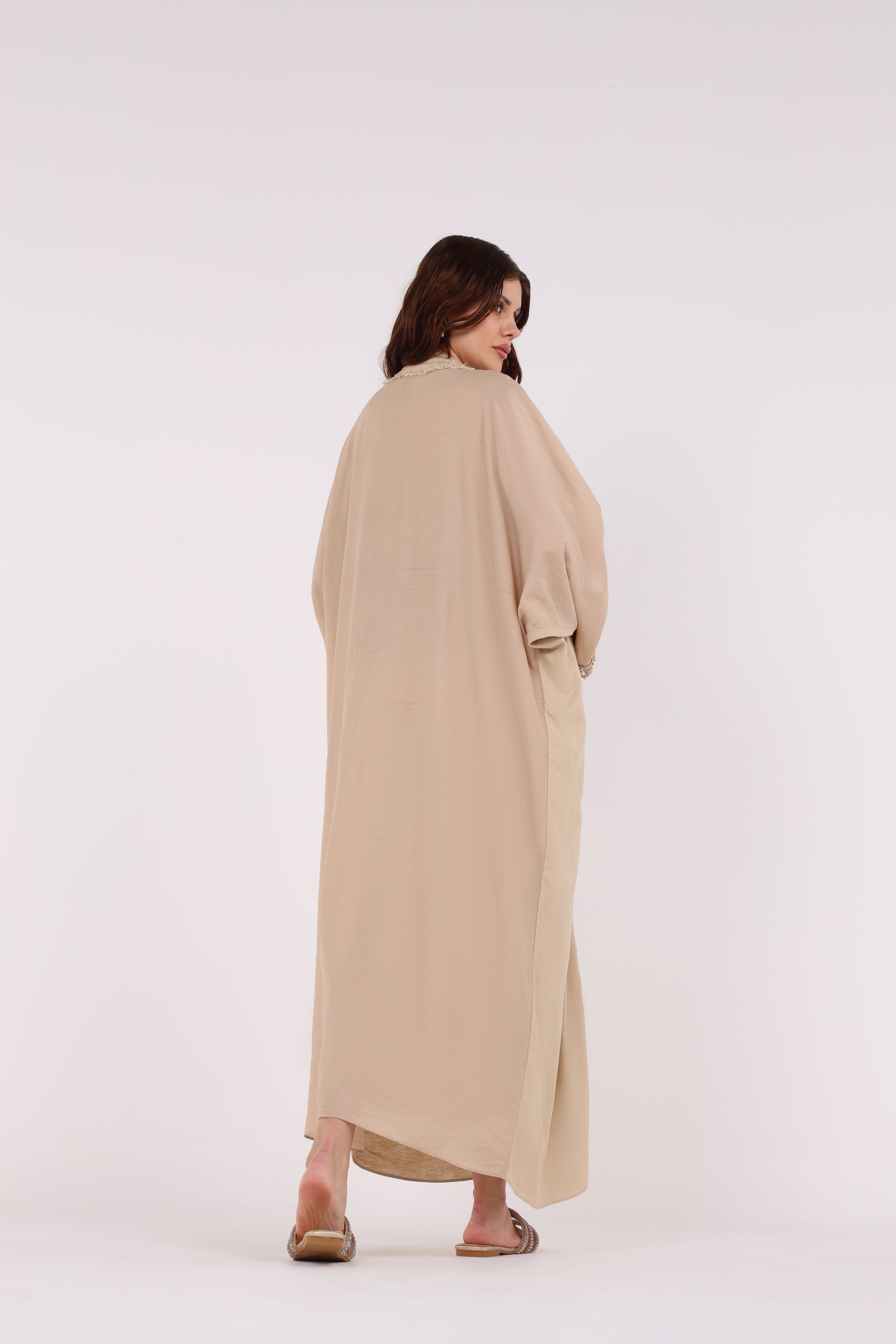 تتميز هذه العباءة الأنيقة بتفاصيل خياطة فضفاضة معقدة تضيف ملمسًا وعمقًا إلى شكلها الظلي المتدفق. مصنوعة من قماش خفيف الوزن وعالي الجودة، تتدلى بشكل جميل مع توفير الراحة وسهولة الحركة. يضيف الحاشية المزخرفة لمسة من الرقي، مما يبرز الحرفية الرائعة ويعزز التصميم العام. بفضل قصتها المريحة وقصتها المتواضعة، تعد هذه العباءة مثالية للمناسبات غير الرسمية والرسمية، مما يجعلها إضافة متعددة الاستخدامات لأي خزانة ملابس. يمكنك ارتداؤها مع إكسسوارات بسيطة لإطلالة أنيقة.
