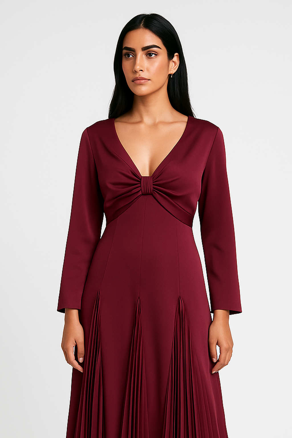 فستان طويل بتصميم راقٍ يجمع بين البنية الأنيقة والانسيابية الناعمة. يتميّز بفتحة رقبة على شكل V مع تفصيلة العقدة الأمامية التي تمنح القَصّة بعداً جمالياً يبرز شكل الجسم.