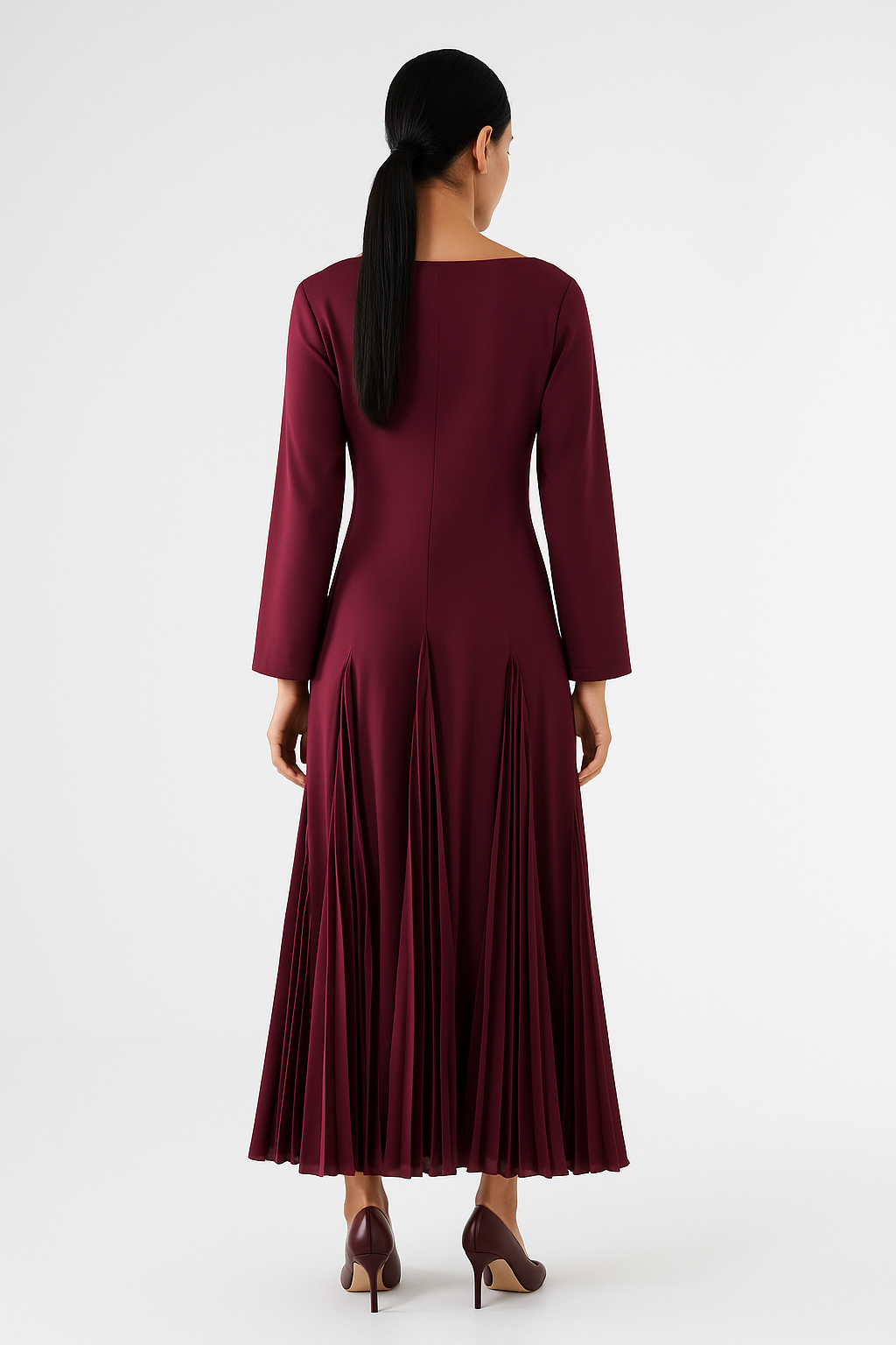 يأتي الفستان بأكمام دولمان التي تضيف خط كتف ناعماً وانسيابياً لإطلالة مريحة وراقية في الوقت نفسه. تنسدل التنورة بقصة A-line بطول كامل، مزودة بثنيات بنمط بانلز تمنح حركة جميلة وتفاصيل راقية مع كل خطوة. خيار مثالي للمناسبات الرسمية، السهرات، والطلعات الراقية.