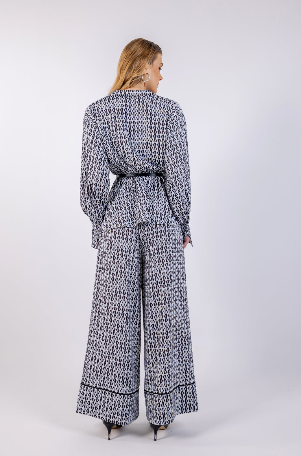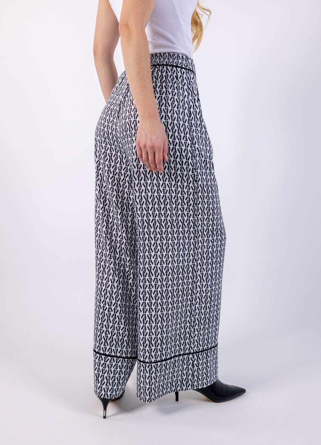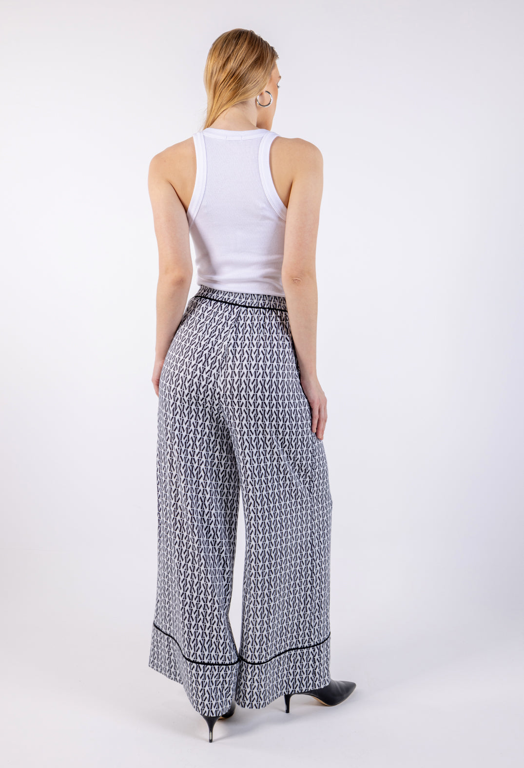 اجمع بين الراحة والأناقة مع بنطالنا الواسع متعدد الألوان والمزخرف بنقشة مونوجرام. تصميمه الأنيق يجعله مثاليًا لمختلف المناسبات.