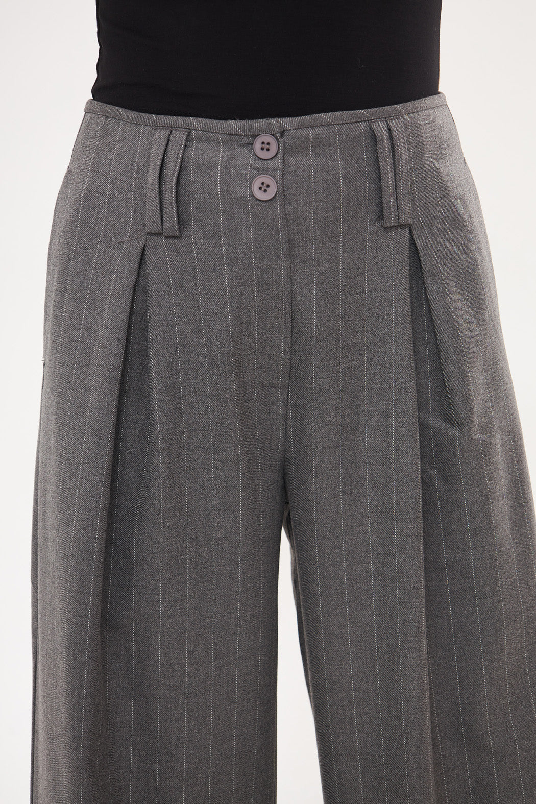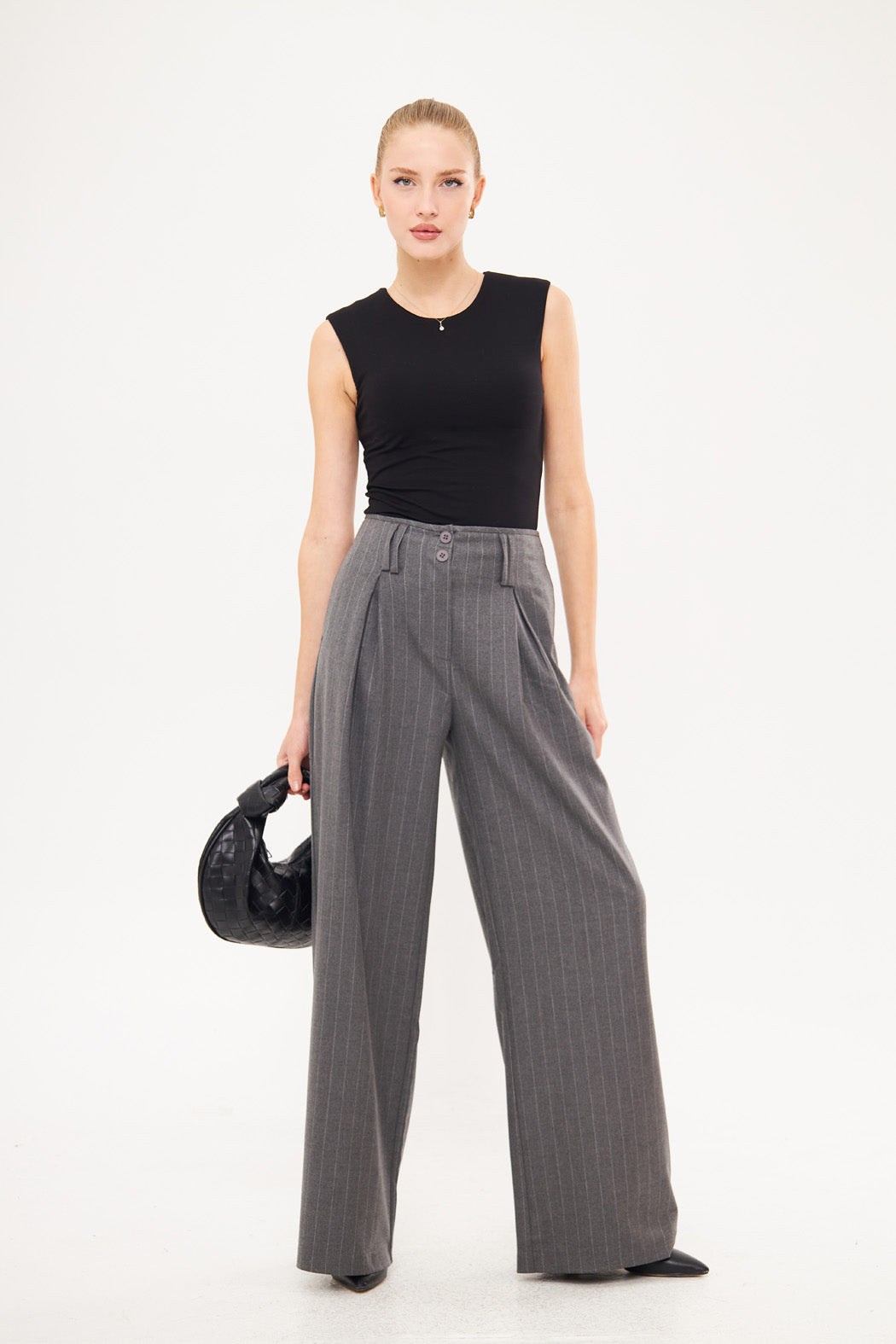 قم بتحديث خزانة ملابسك بهذه السراويل الواسعة ذات اللونين، والمصممة لإضفاء لمسة جريئة ومعاصرة. يخلق النمط المخطط الجذاب تباينًا بصريًا متطورًا، مما يجعل هذه السراويل مثالية للمناسبات غير الرسمية وشبه الرسمية. مع قصة ساق واسعة مريحة، توفر الراحة وحرية الحركة، بينما يعزز الخصر المرتفع من شكل جسمك للحصول على مظهر جذاب.