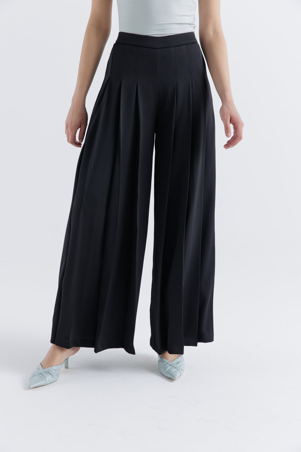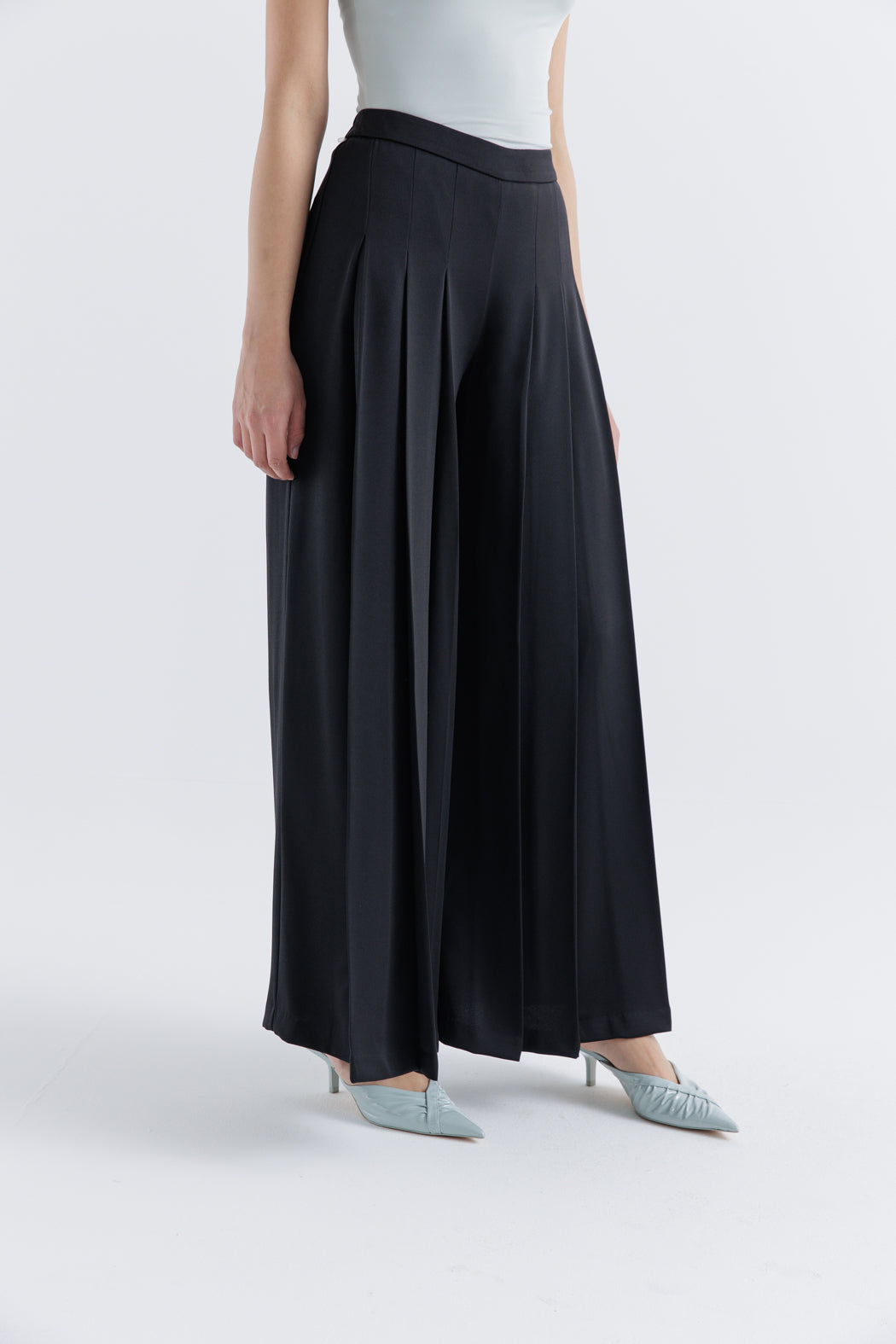 بنطال بالازو بكسرات، بنطال واسع، بنطال بخصر مرتفع، ملابس سهرة أنيقة، إطلالة راقية، بنطال انسيابي، موضة فاخرة، ستايل عصري، ملابس رسمية، قطعة أساسية أنيقة