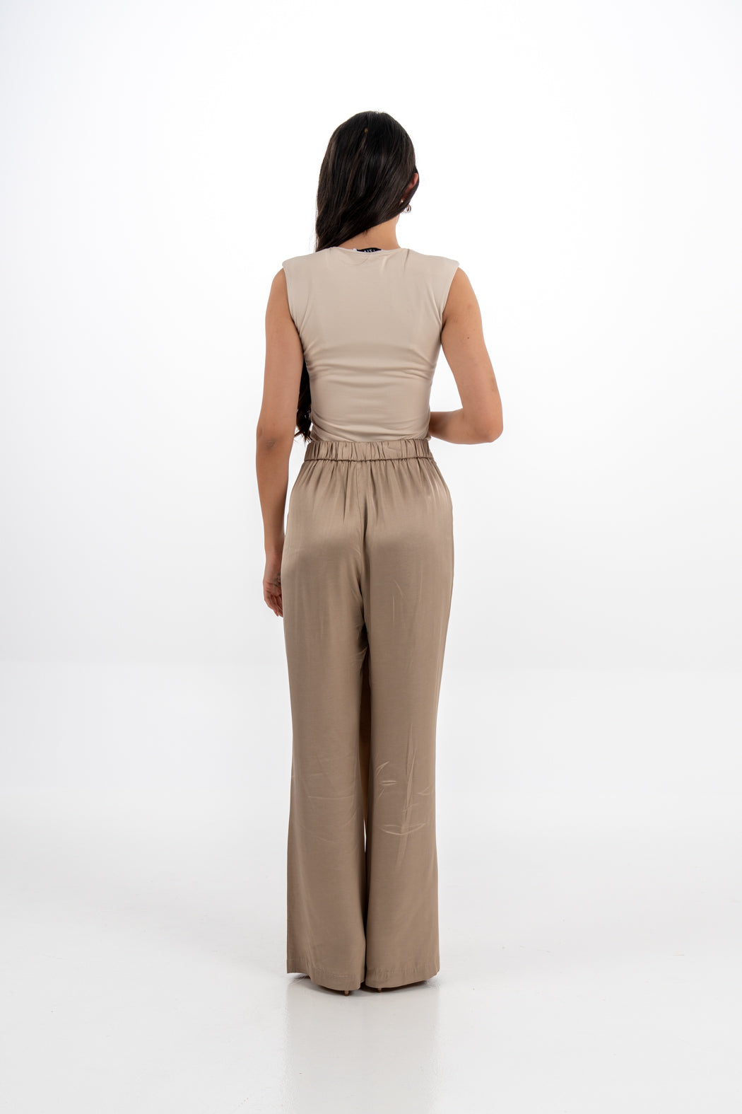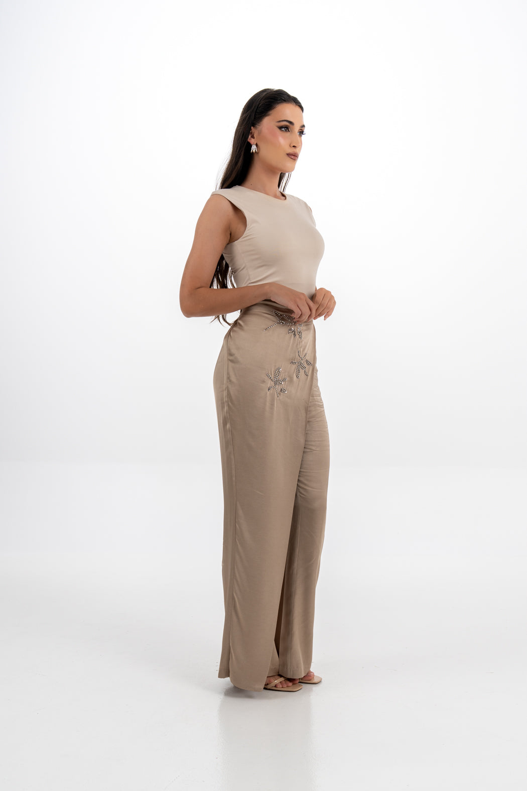أضيفي لمسة من الفخامة إلى إطلالتك مع هذا البنطال المصمم بقَصّة عالية الخصر وتفصيل ملفوف في الأمام، مزين بتطريزات معدنية بشكل أوراق تمنحه مظهراً أنيقاً ومعاصراً. يتميز بقَصّة واسعة وانسيابية مع خصر مطاطي من الخلف لراحة تدوم طوال اليوم. الطول التقريبي 112 سم، ويمكن تنسيقه مع القميص 2502026 لإطلالة متناغمة وأنيقة.